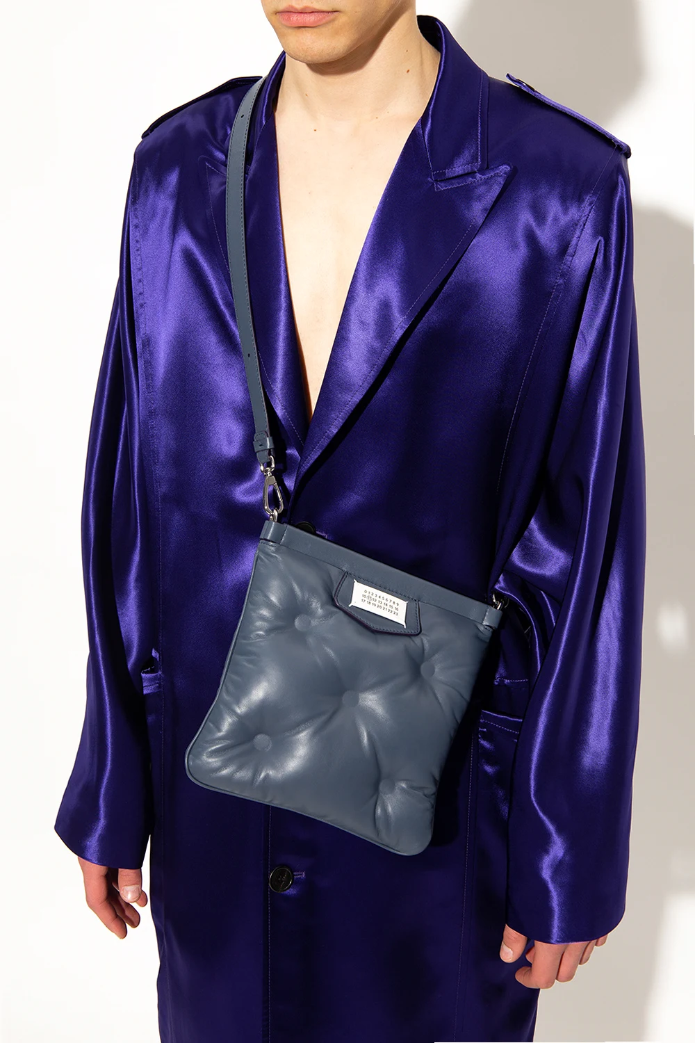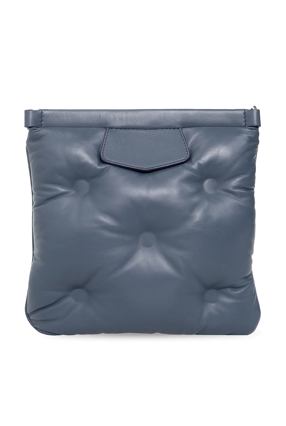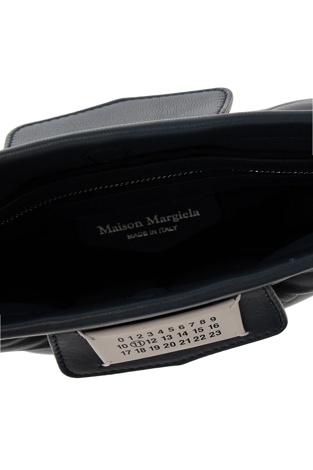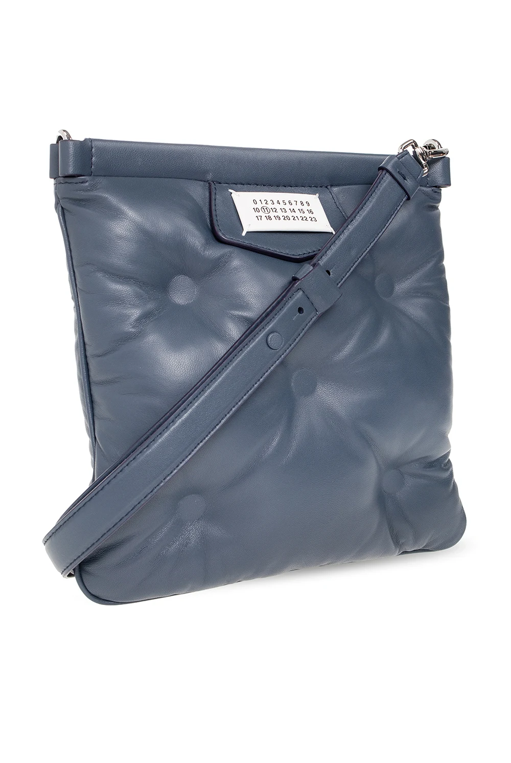 Granatowa, pikowana torba na ramię, model ‘Glam Slam’ Maison Margiela. Wykonana ze skóry. Ozdobiona biało-czarną naszywką z logo. Odpinany pas na ramię. Wewnątrz komora oraz kieszeń zamykana na zamek. Metalowe wykończenie w kolorze srebrnym.