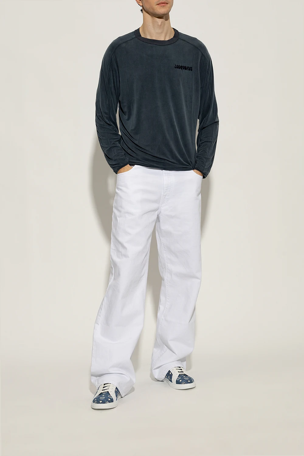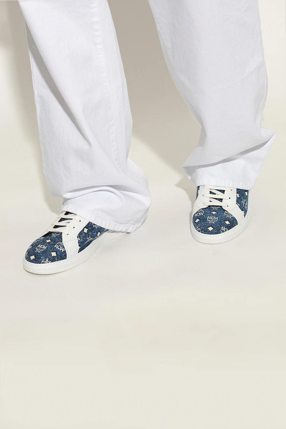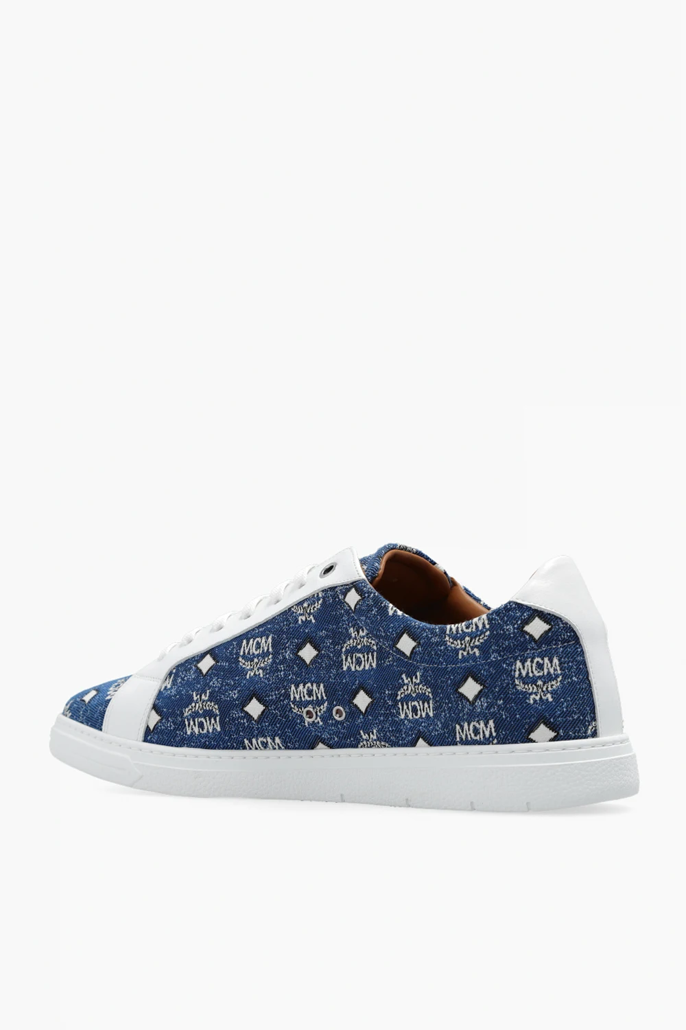 Niebiesko-białe, sznurowane buty sportowe, model ‘Terrain Lo’ MCM. Wykonane z denimu ozdobionego żakardowym wzorem z monogramem oraz wykończone skórą. Na języku metalowa aplikacja z logo w kolorze srebrnym. Biała, gumowa podeszwa.