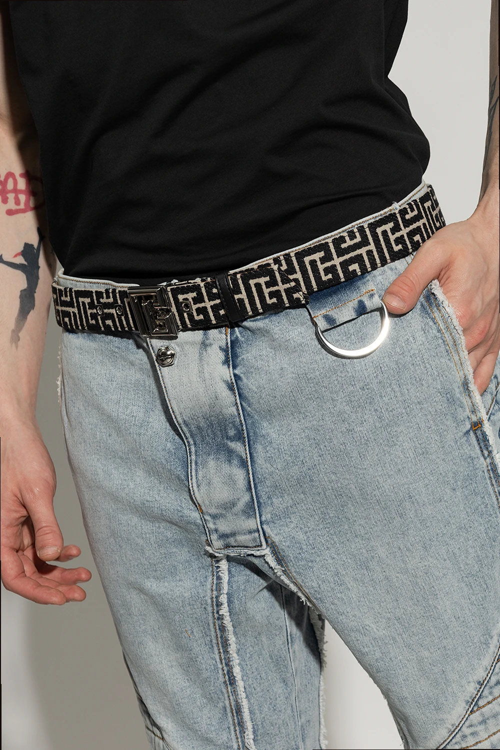 Czarno-beżowy pasek Balmain. Wykonany z płótna ozdobionego wyszytym monogramem. Metalowa klamra w kolorze srebrnym w kształcie logo. Beżowa, skórzana warstwa wewnętrzna.