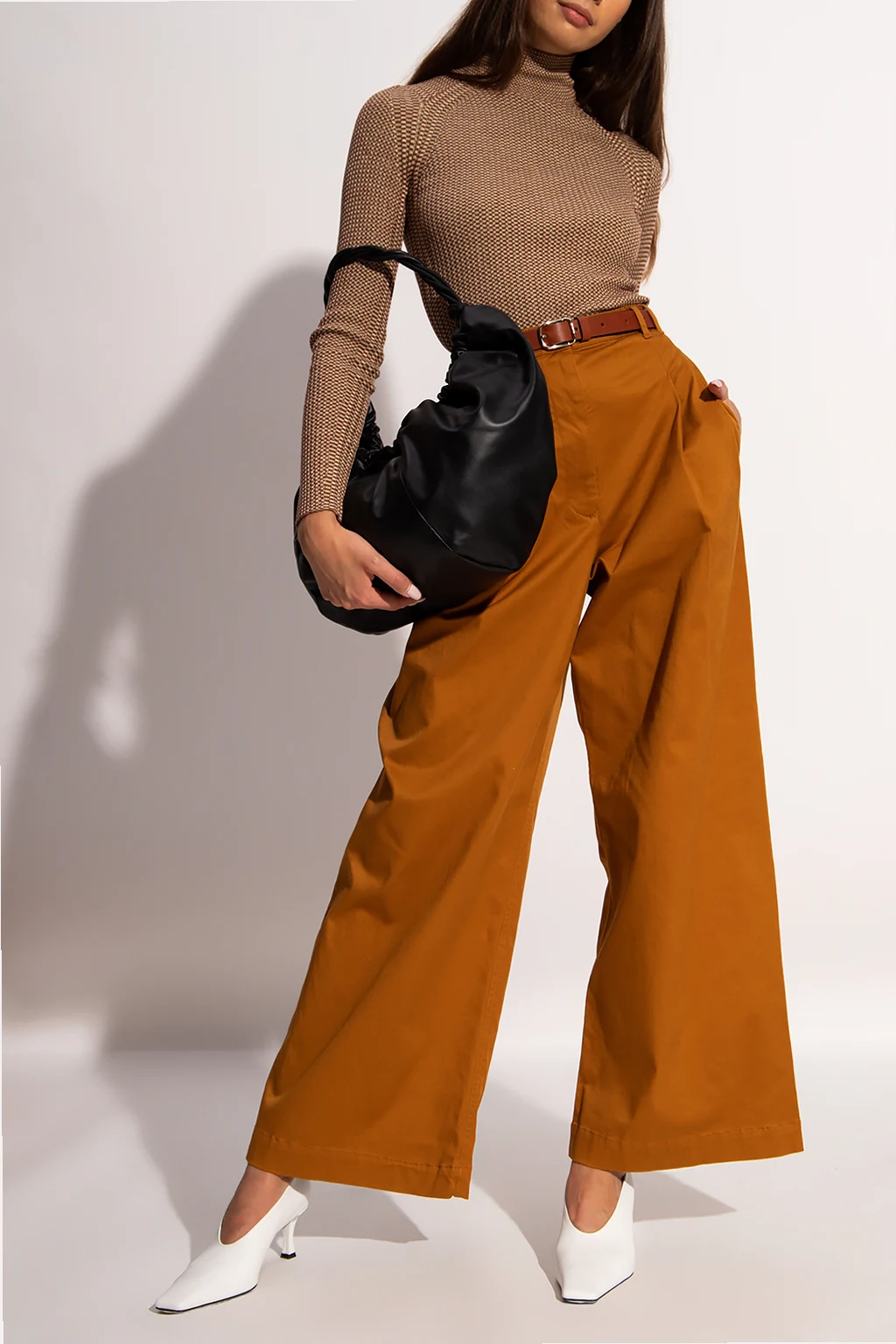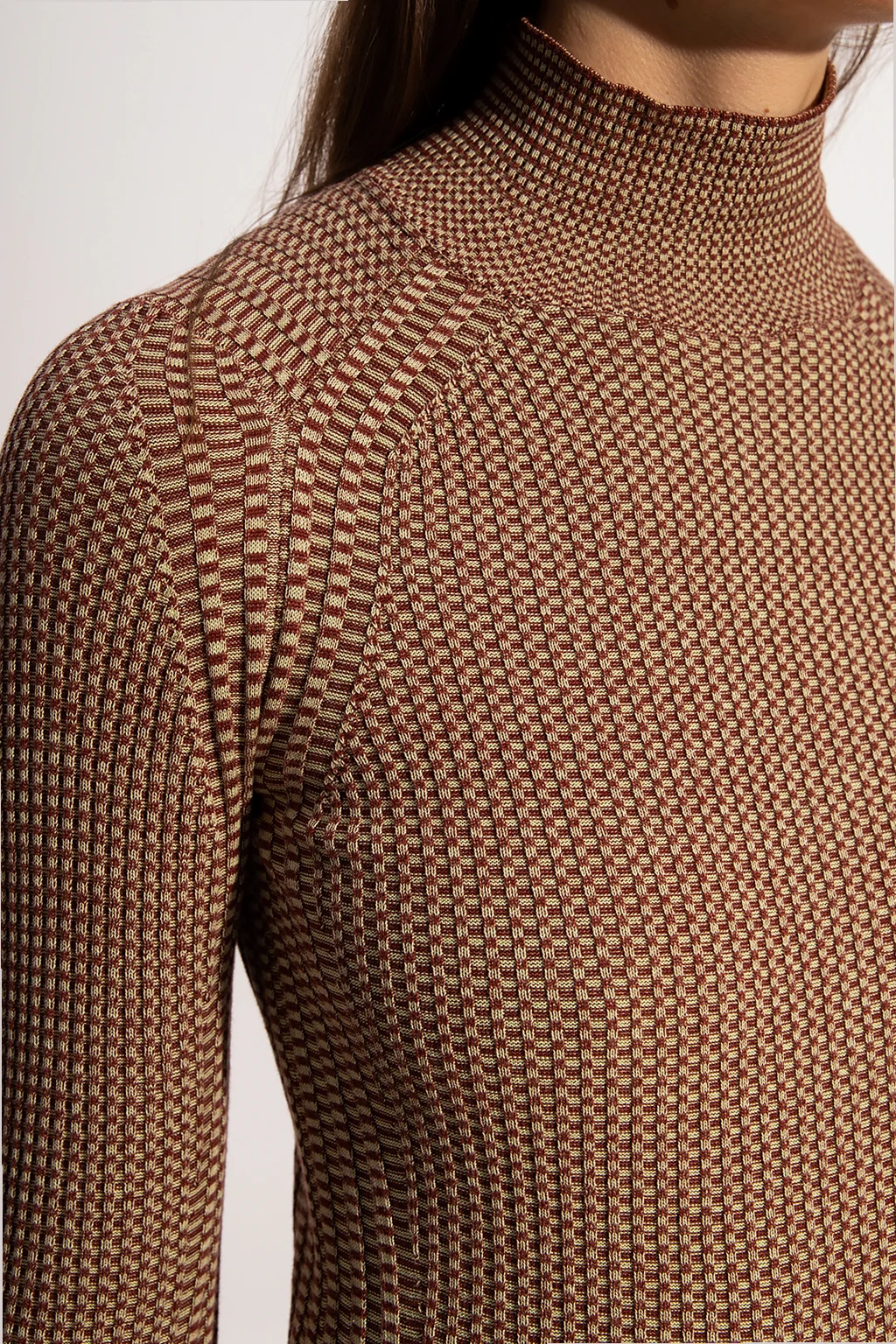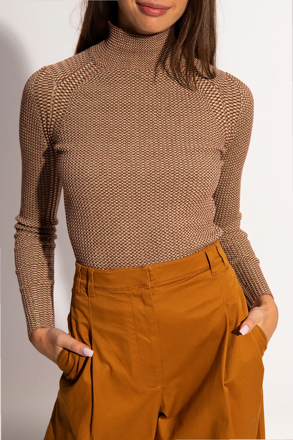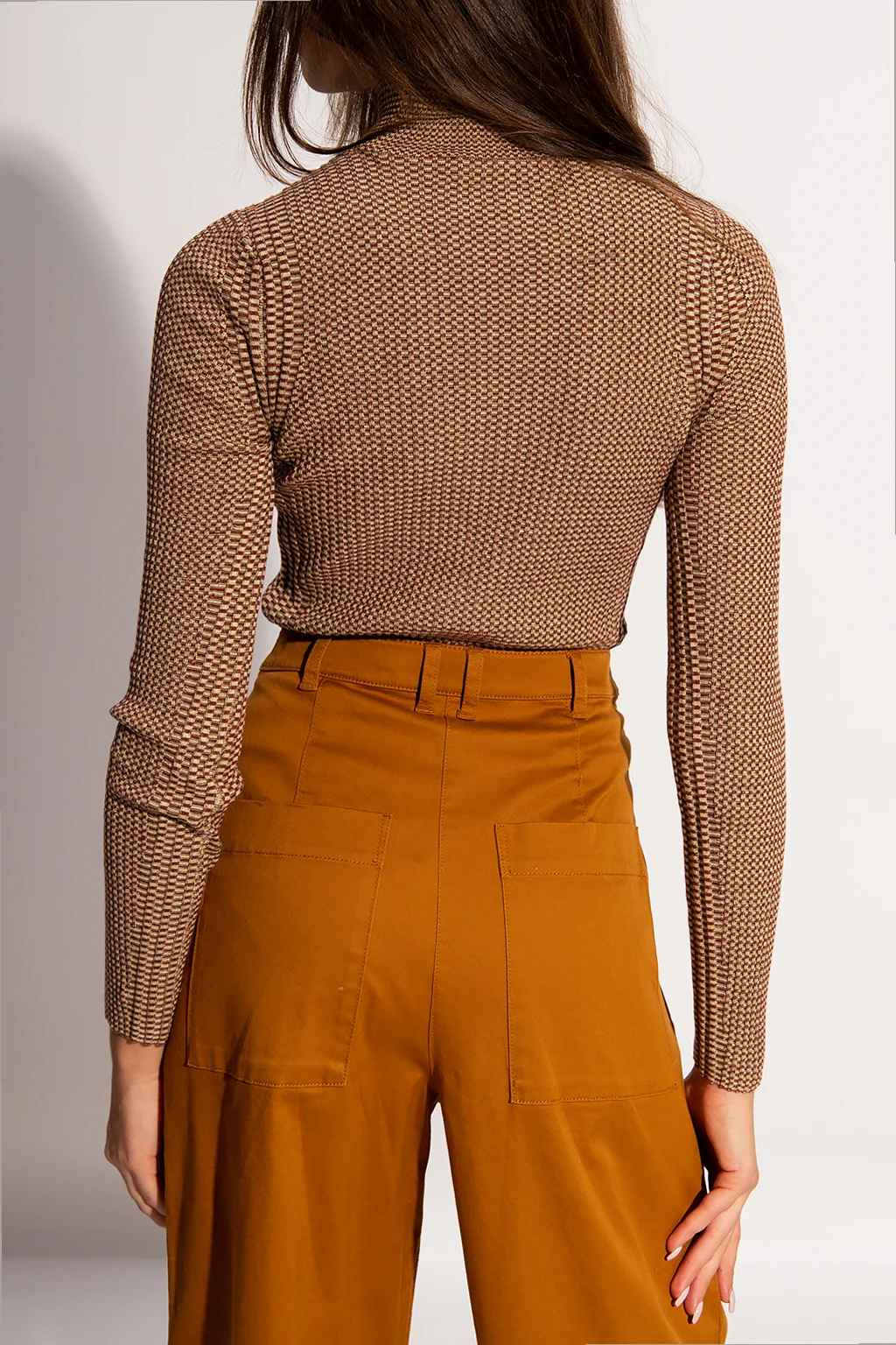 Brązowo-beżowy top z golfem Proenza Schouler White Label. Wykonany z jedwabiu o specjalnej fakturze. Wyszyty wzór. Długie rękawy.