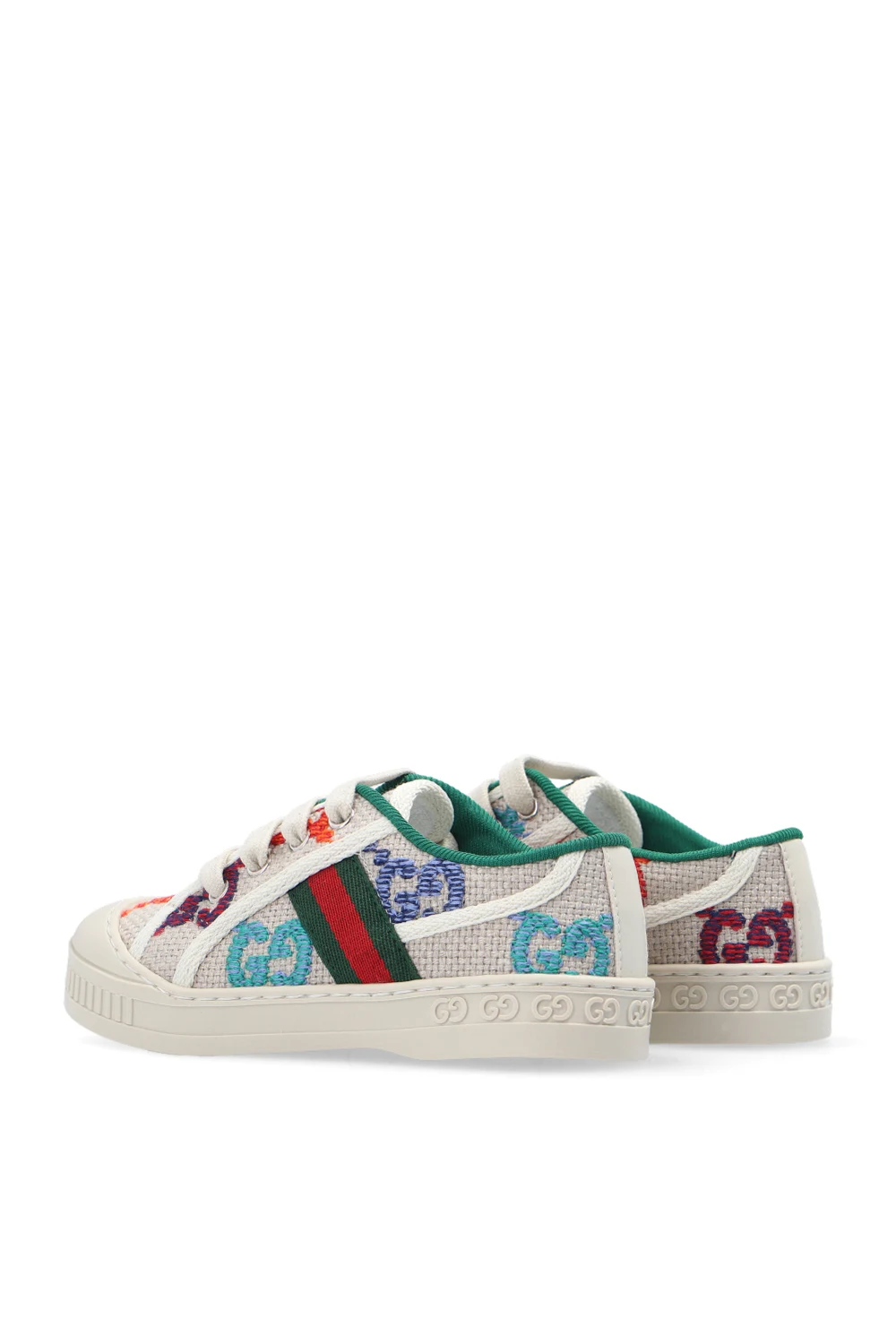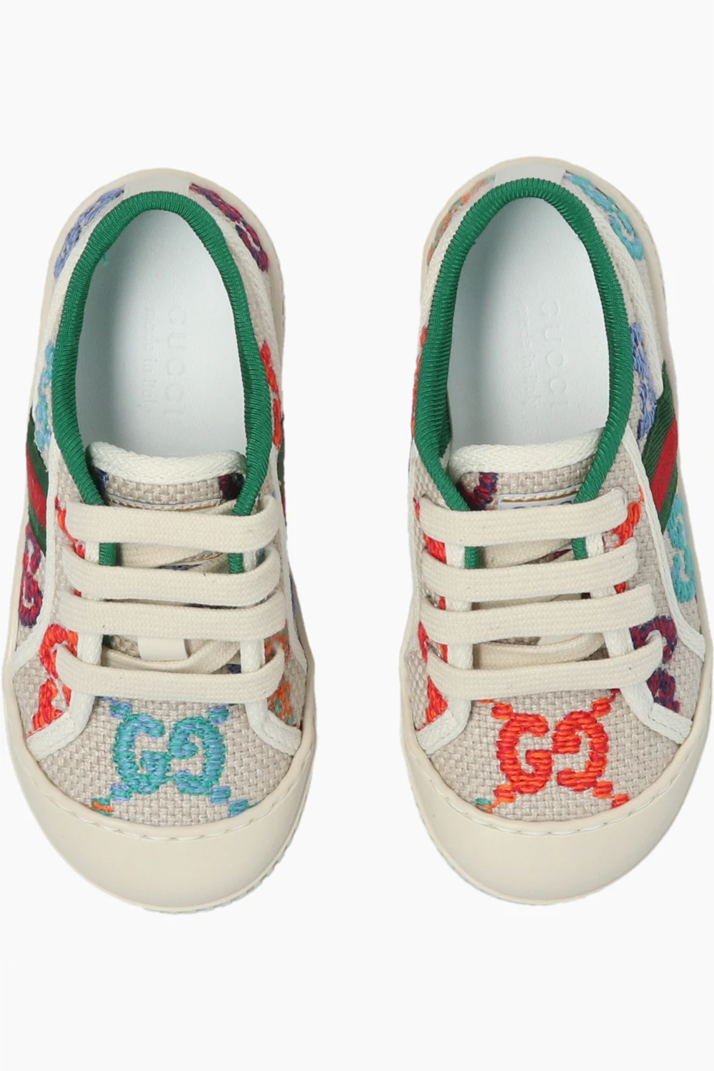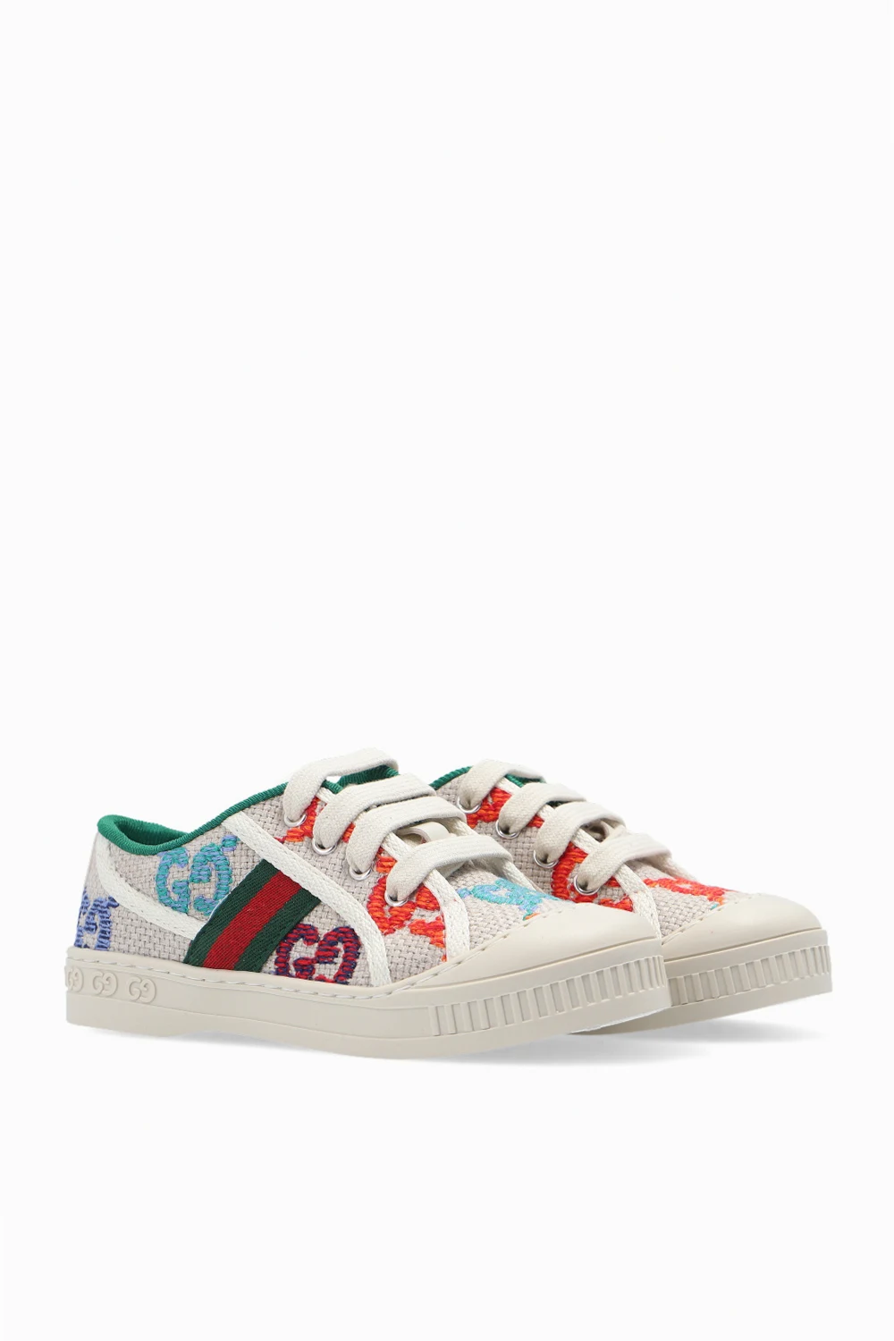 Jasnoszare, sznurowane buty sportowe Gucci Kids. Ozdobione kolorowo wyszytym logo. Zaokrąglony nosek wykończony gumą. Po bokach charakterystyczny zielono-czerwono-zielony pasek ‘Web’. Jasnoszara, gumowa podeszwa.