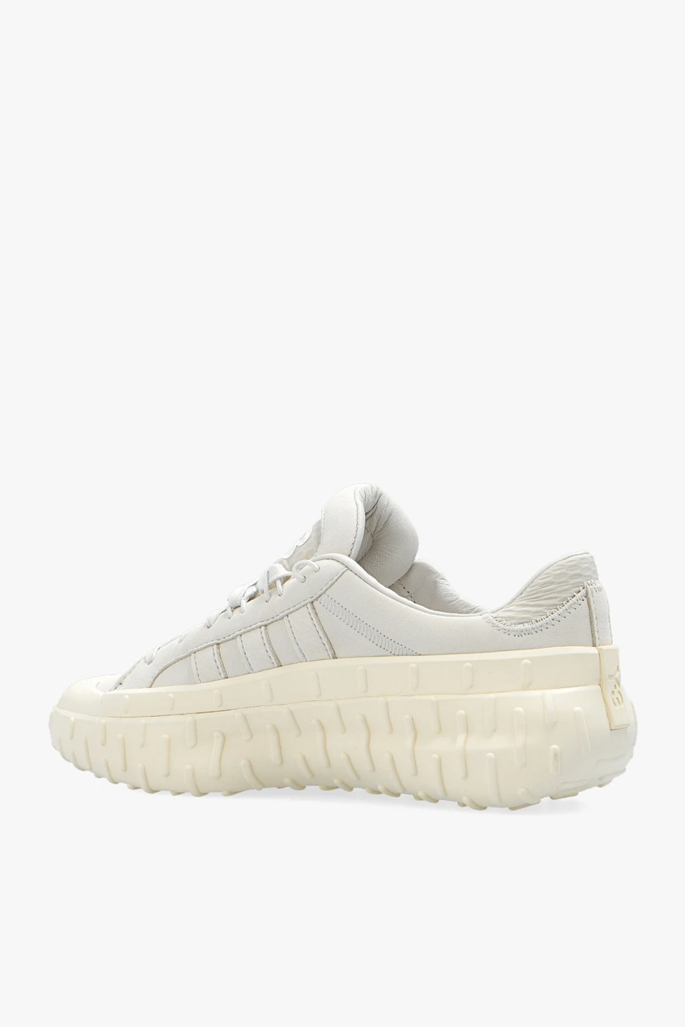 Kremowe, sznurowane buty sportowe, model ‘GR.1P’ Y-3 Yohji Yamamoto. Wykonane ze skóry. Wykończone gumą. Na języku wypukłe, białe logo. Po bokach charakterystyczne trzy paski. Z tyłu wytłoczone logo. Kremowa, gumowa podeszwa.