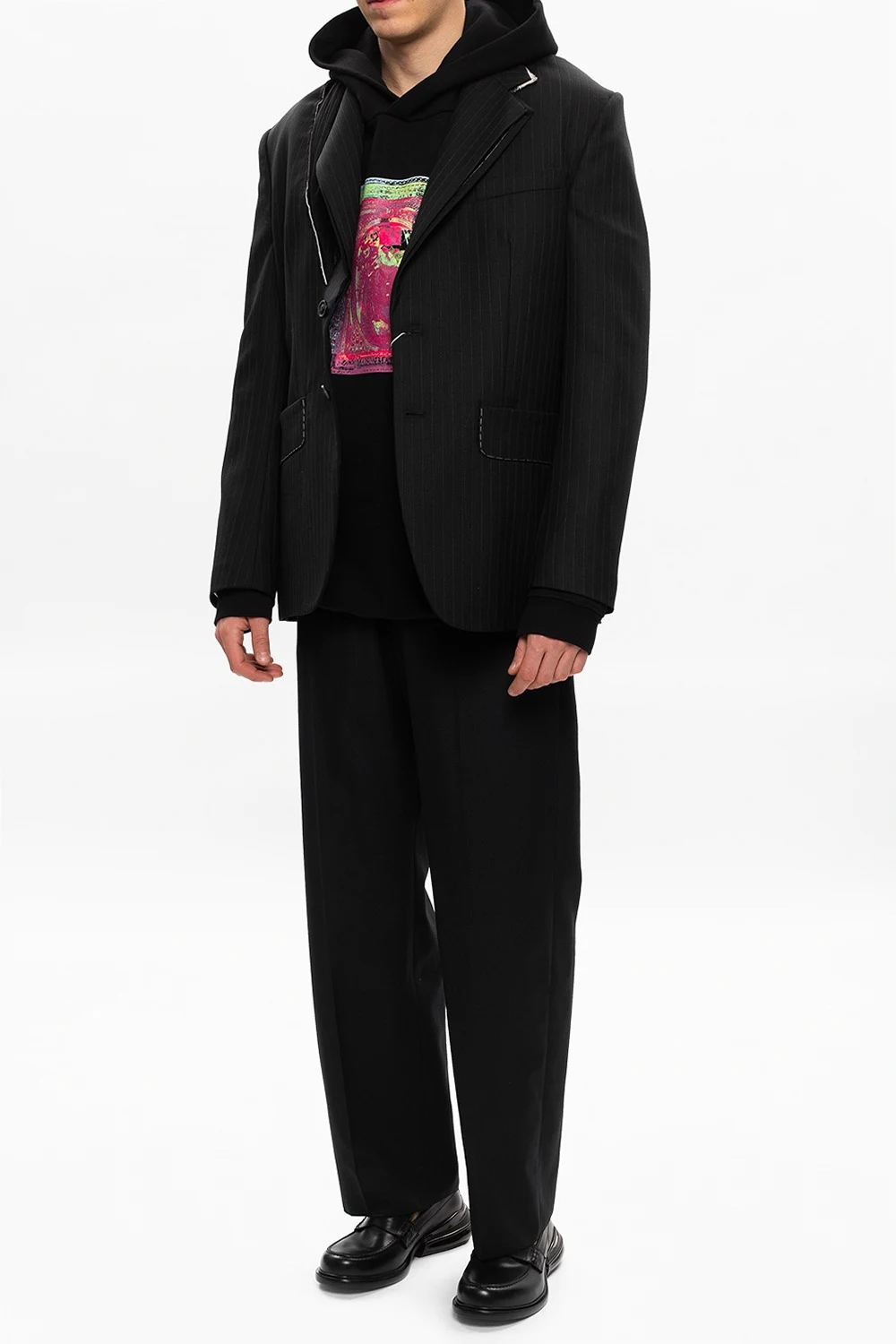 Czarne, skórzane mokasyny Maison Margiela. Ozdobione pasem z wyciętym wzorem. Z tyłu wytłoczone logo. Beżowa, skórzana podeszwa wykończona czarną gumą.