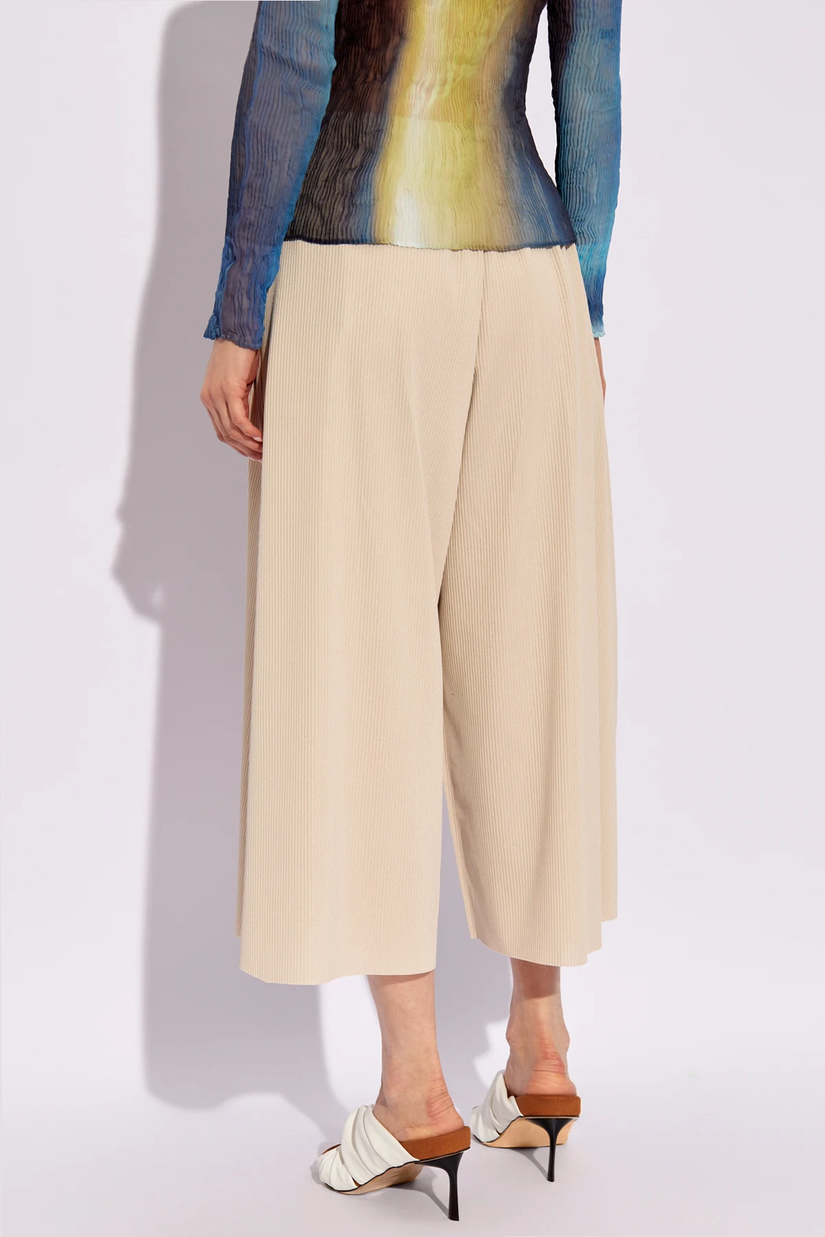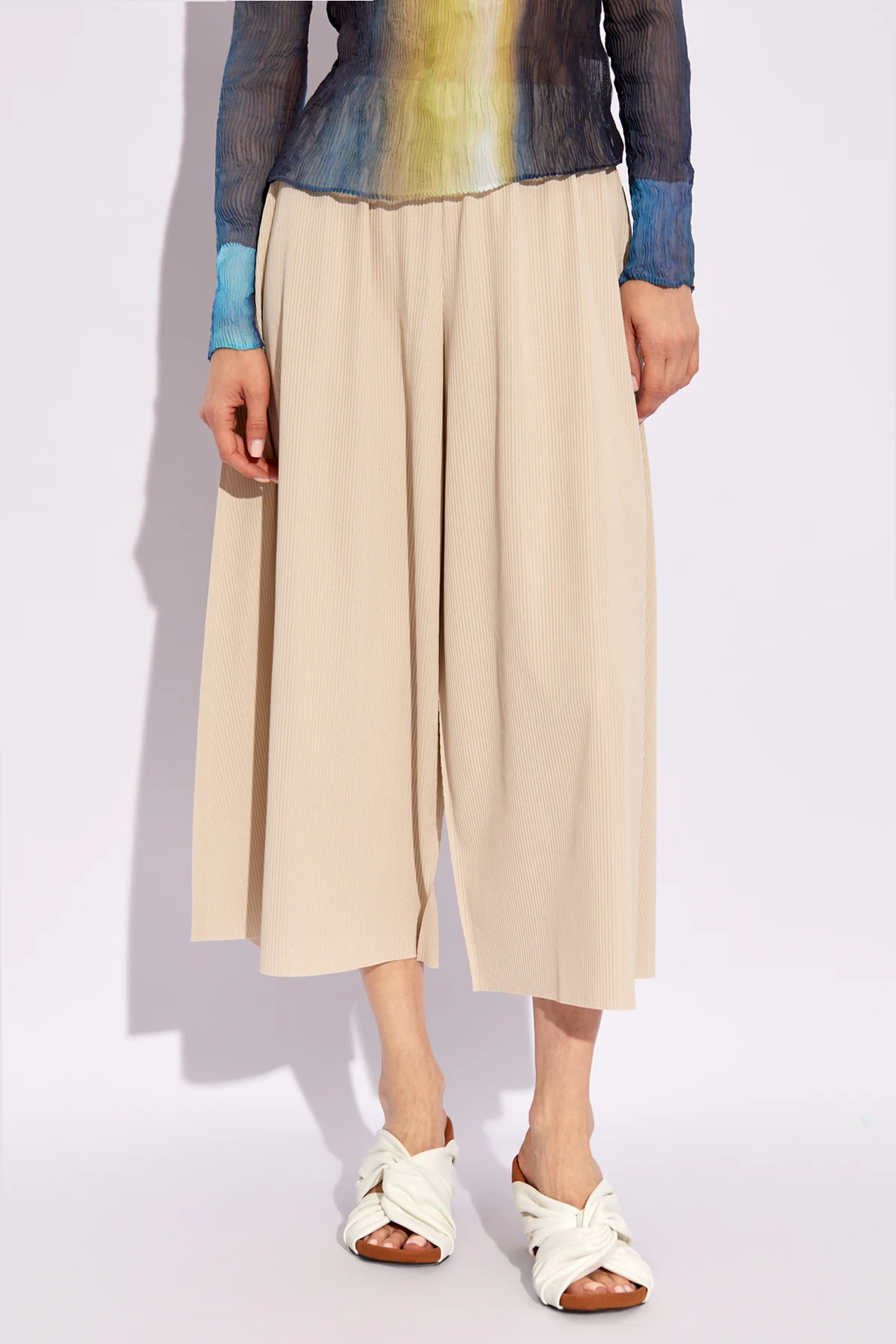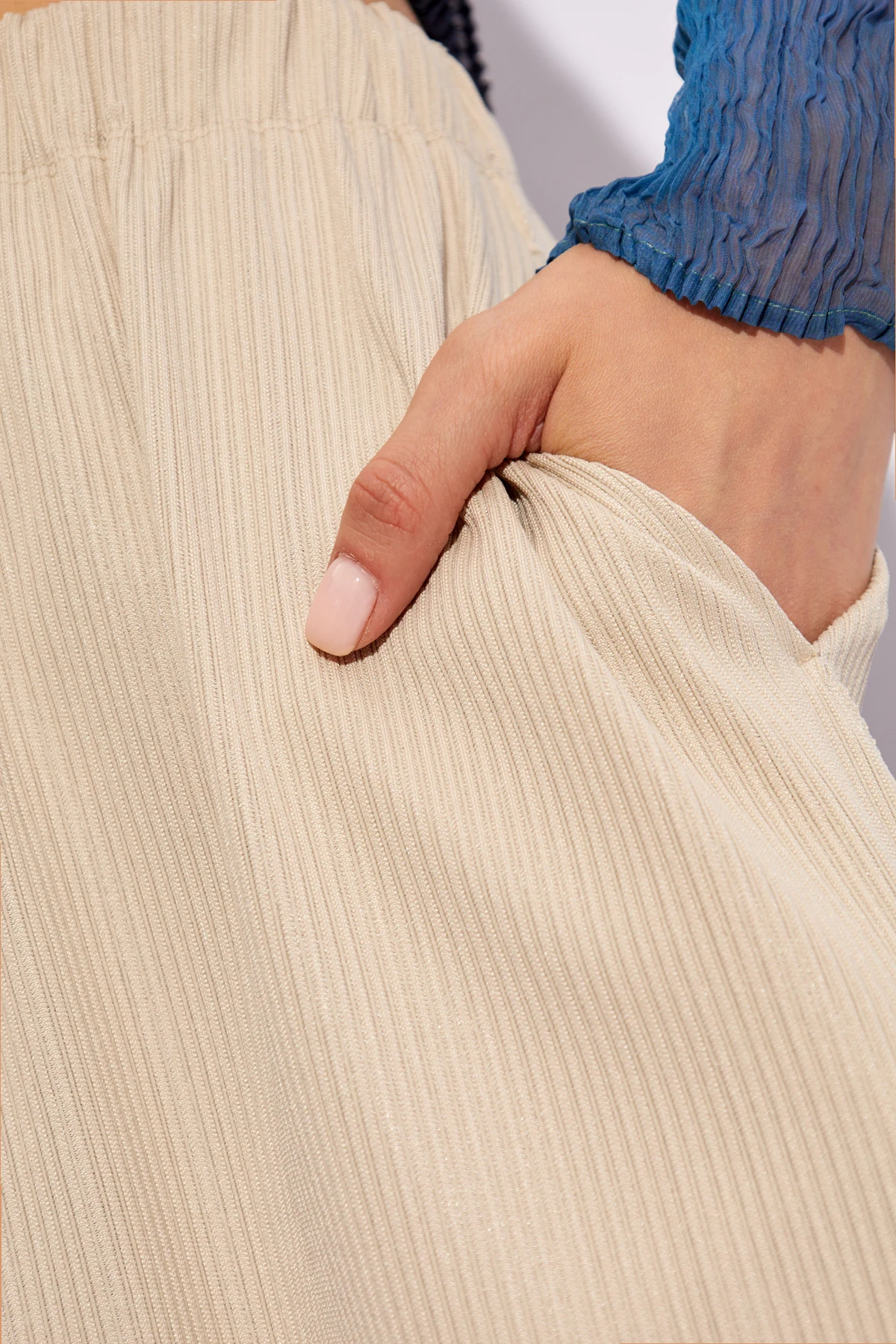 Zachwycające prążkowane spodnie od cenionego projektanta Issey Miyake , z kolekcji Pleats Please , są kwintesencją elegancji połączonej z nowoczesnością. Dominujący beżowy kolor, w harmonii z subtelną prążkowaną strukturą materiału, tworzy niepowtarzalną kompozycję, która optycznie wydłuża sylwetkę, nadając jej smukłości i gracji.
