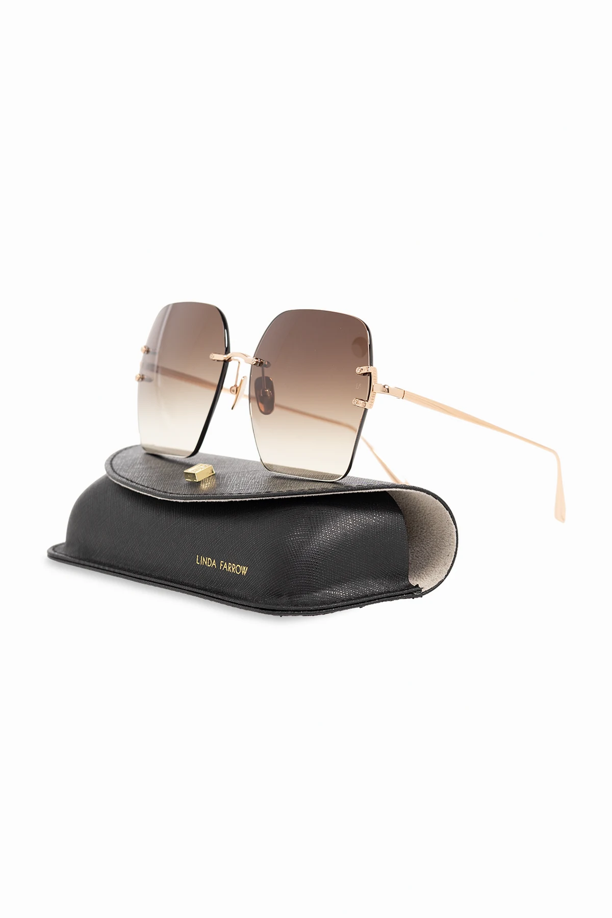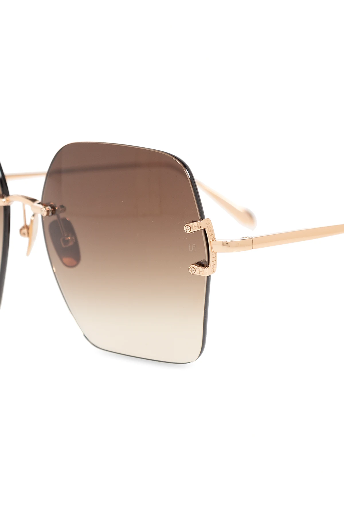 Okulary przeciwsłoneczne w kolorze złotym, model ‘Karina’ Linda Farrow. Wykonane z tytanu. Ozdobione wygrawerowanym logo. Brązowe, gradientowe soczewki ze 100% ochroną przed promieniowaniem UV.