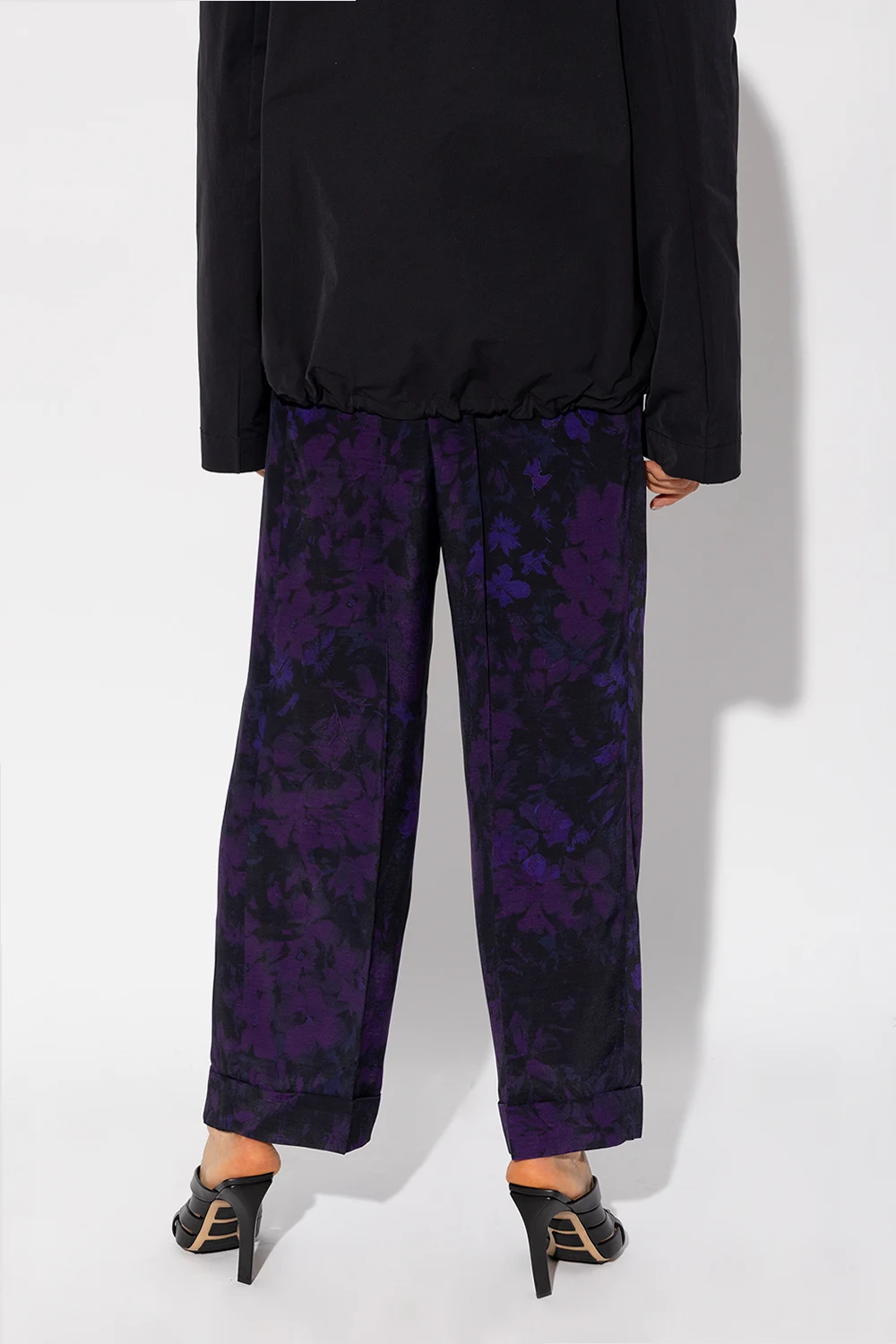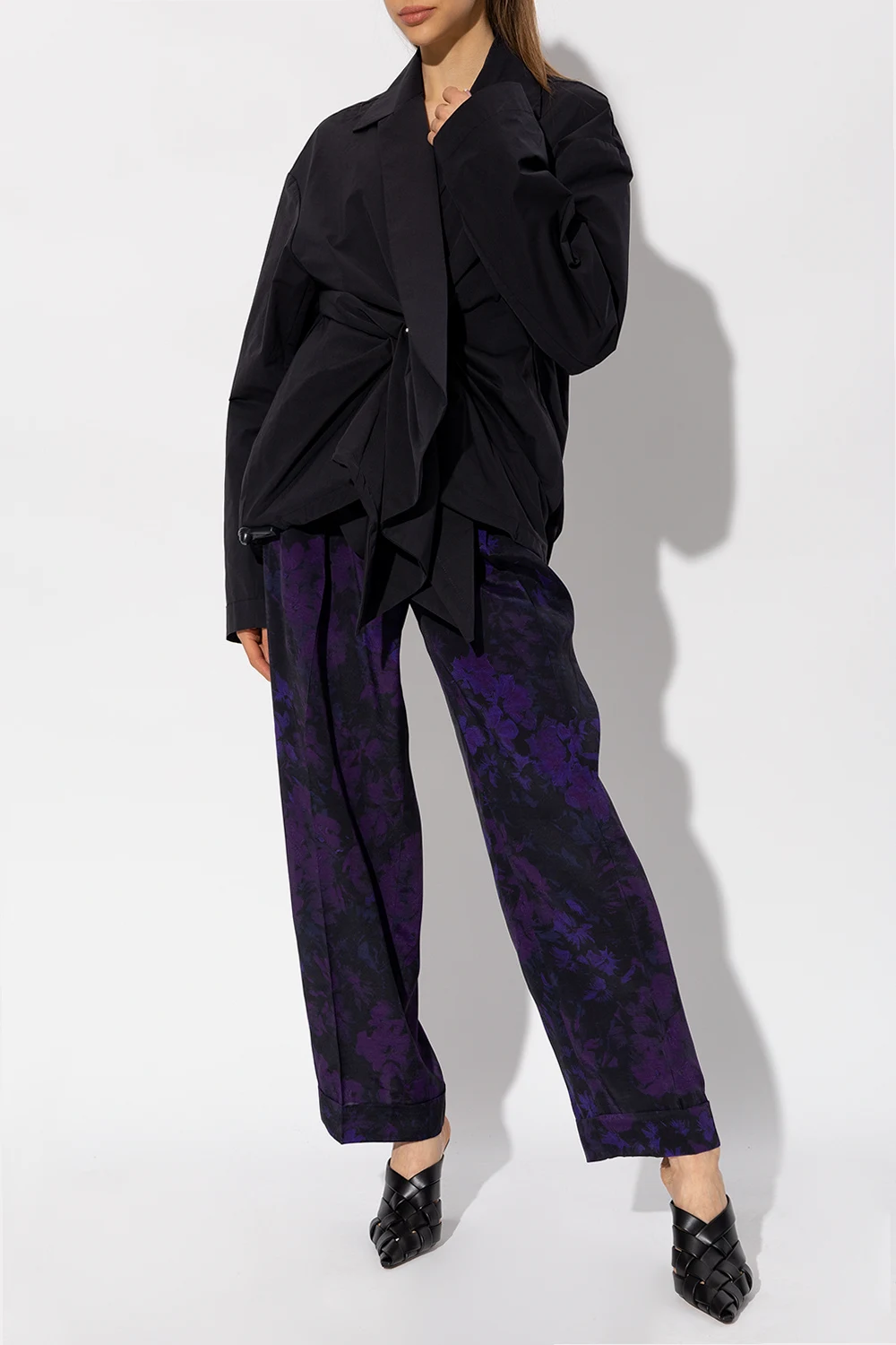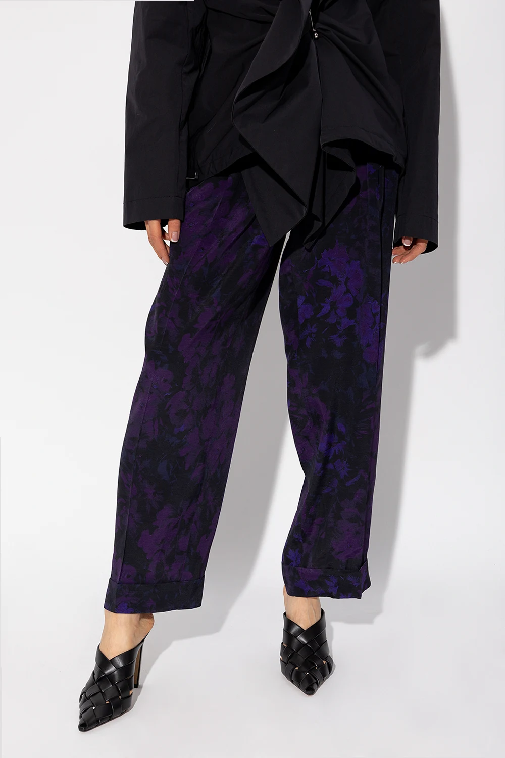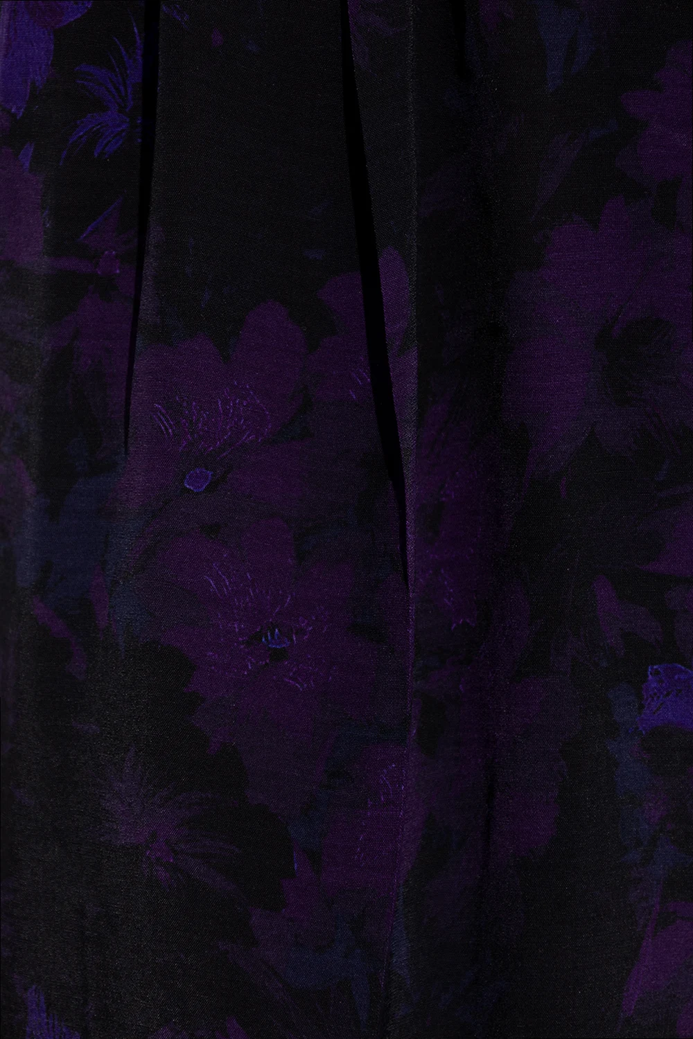 Czarno-fioletowe spodnie o luźnym kroju Dries Van Noten. Wysoki stan. Zapinane na zamek, zaczep i guzik. Z przodu zaszewki. Cztery kieszenie: dwie z przodu i dwie z tyłu z patką zapinaną na guzik.