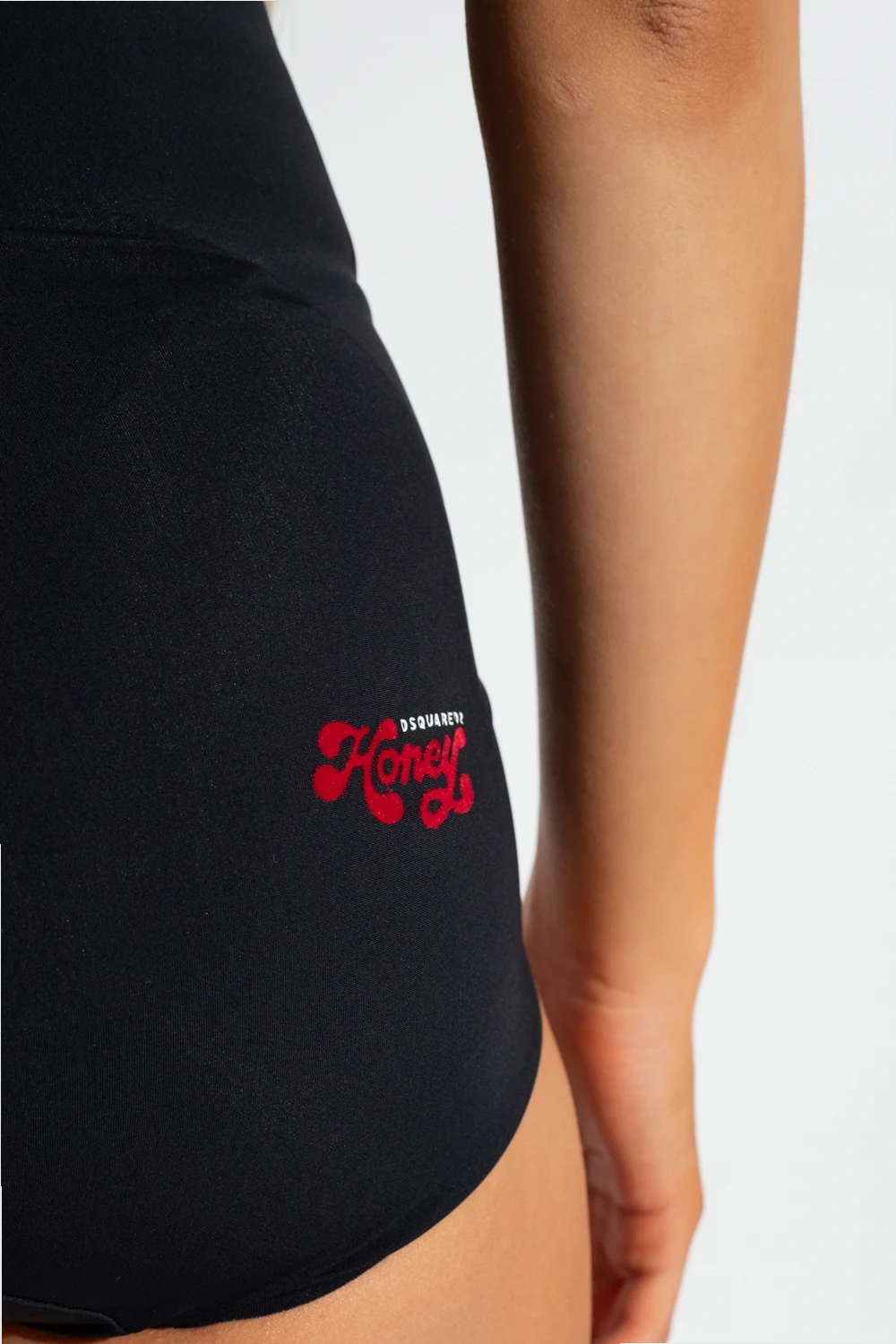 Czarne figi z wysokim stanem Dsquared2. Ozdobione czerwono-białym nadrukiem z aksamitnym wykończeniem.