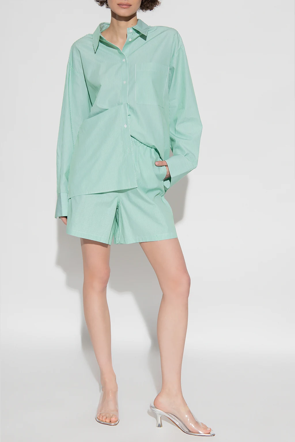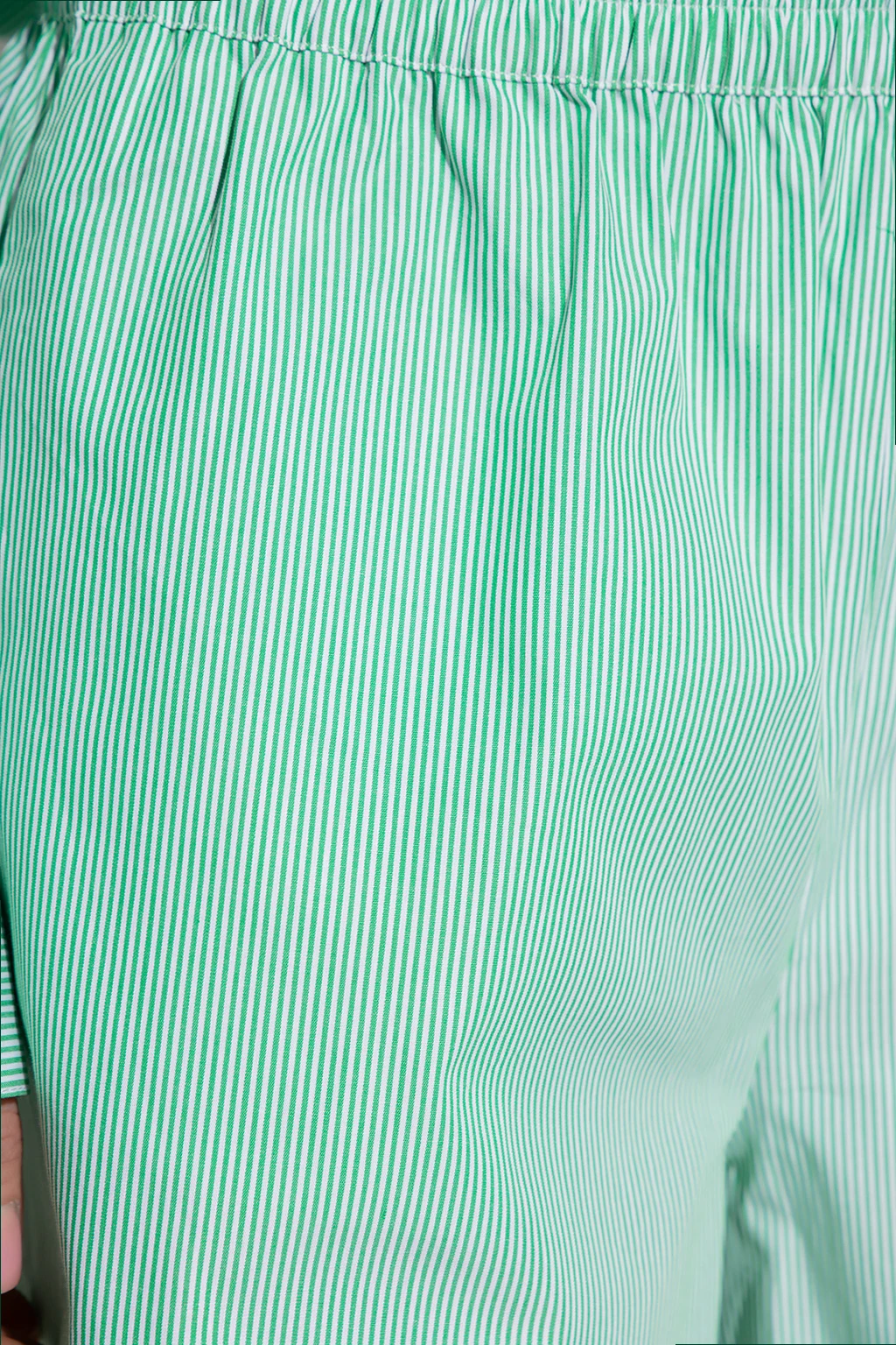 Zielono-białe, bawełniane szorty z wysokim stanem, model ‘Bryan’ Birgitte Herskind. W pasie wszyta guma. Ozdobione wzorem w prążki. Z przodu dwie kieszenie.