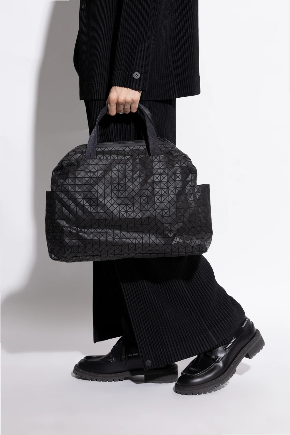 Prezentujemy ekskluzywną czarną SHOPPER BAG od renomowanej marki BAO BAO ISSEY MIYAKE . Ta wyjątkowa torba wyróżnia się nowoczesnym, geometrycznym wzorem, składającym się z małych, trójkątnych elementów, które tworzą jednolitą, dynamiczną powierzchnię. Jej prostokątny kształt, lekko zaokrąglony na górze, dodaje elegancji i wyrafinowania.