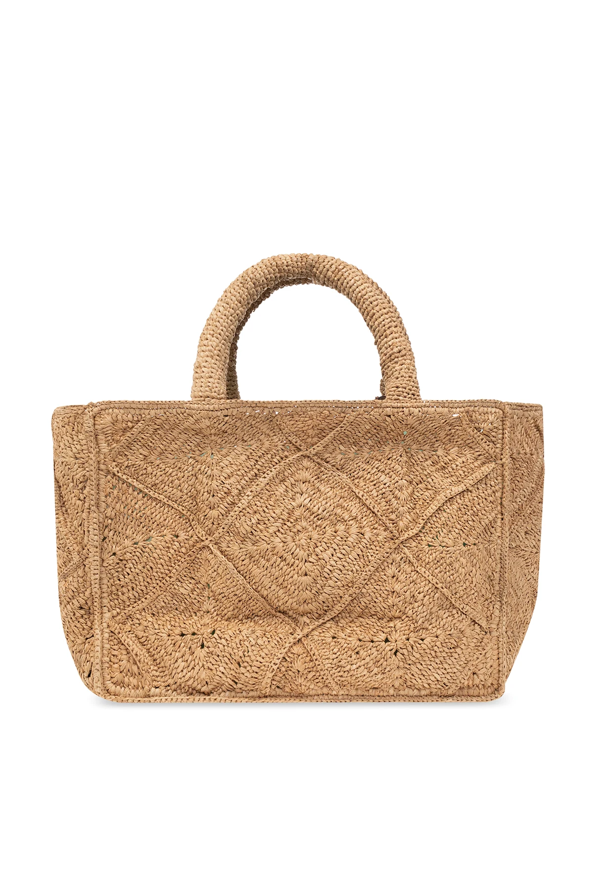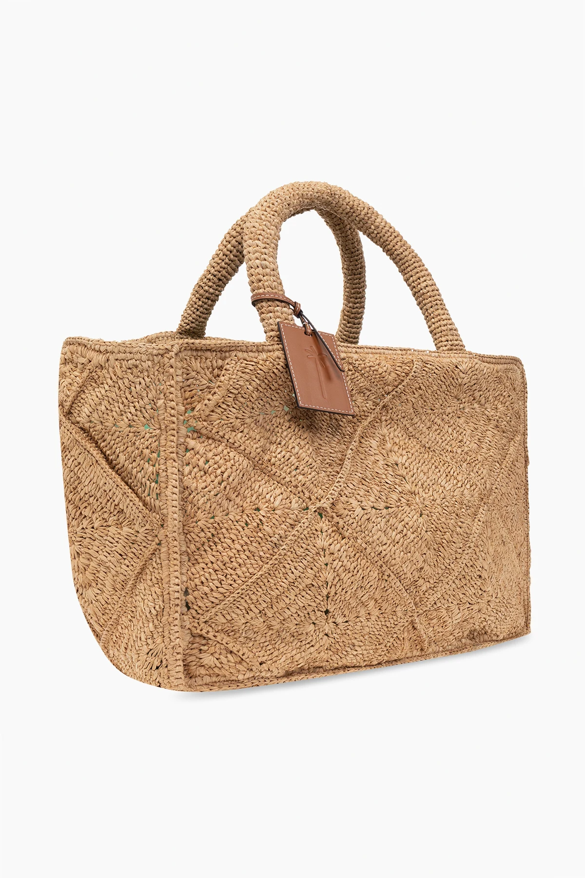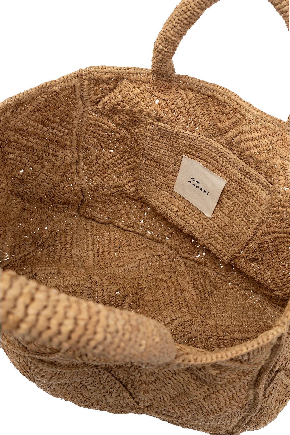 Beżowa torba typu ‘shopper’, model ‘Sunset Large’ Manebi. Wykonana z plecionej rafii. Dwie półokrągłe rączki. Dołączona brązowa, skórzana zawieszka z wytłoczonym logo. Wewnątrz komora z wsuwaną kieszenią.