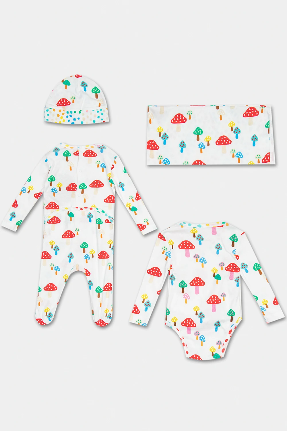 Biały, bawełniany zestaw niemowlęcy: koc, pajacyk, body i czapka Stella McCartney Kids. Ozdobiony kolorowym nadrukiem z motywem muchomora. Pajacyk z długimi rękawami, zapinany z tyłu na zatrzask. Okrągły dekolt. Body z długimi rękawami, zapinane z przodu na zatrzaski. Zawijana czapka. Koc o wymiarach 70/73 cm.