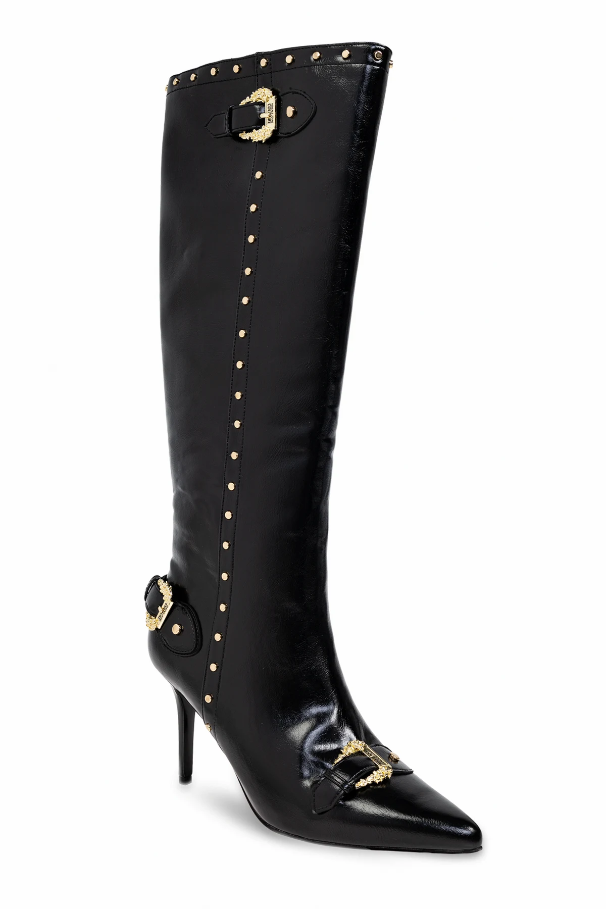 Na załączonych zdjęciach prezentujemy ekskluzywne kozaki na obcasie od renomowanej marki Versace Jeans Couture , zaprojektowane z myślą o eleganckich i wymagających kobietach.