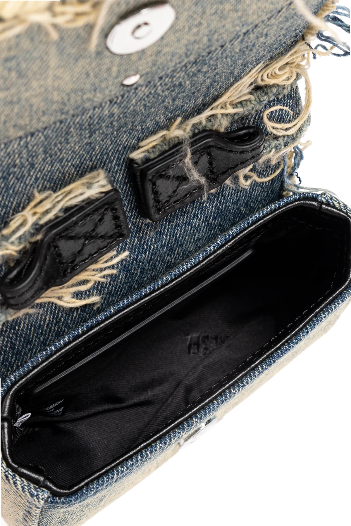 Ta designerska torba, wykonana z materiału przypominającego dżins, zachwyca swoją wyraźną teksturą i unikalnym wykończeniem. Surowe, postrzępione krawędzie oraz rączka dodają jej charakteru, podkreślając nowoczesny, nieco surowy wygląd.