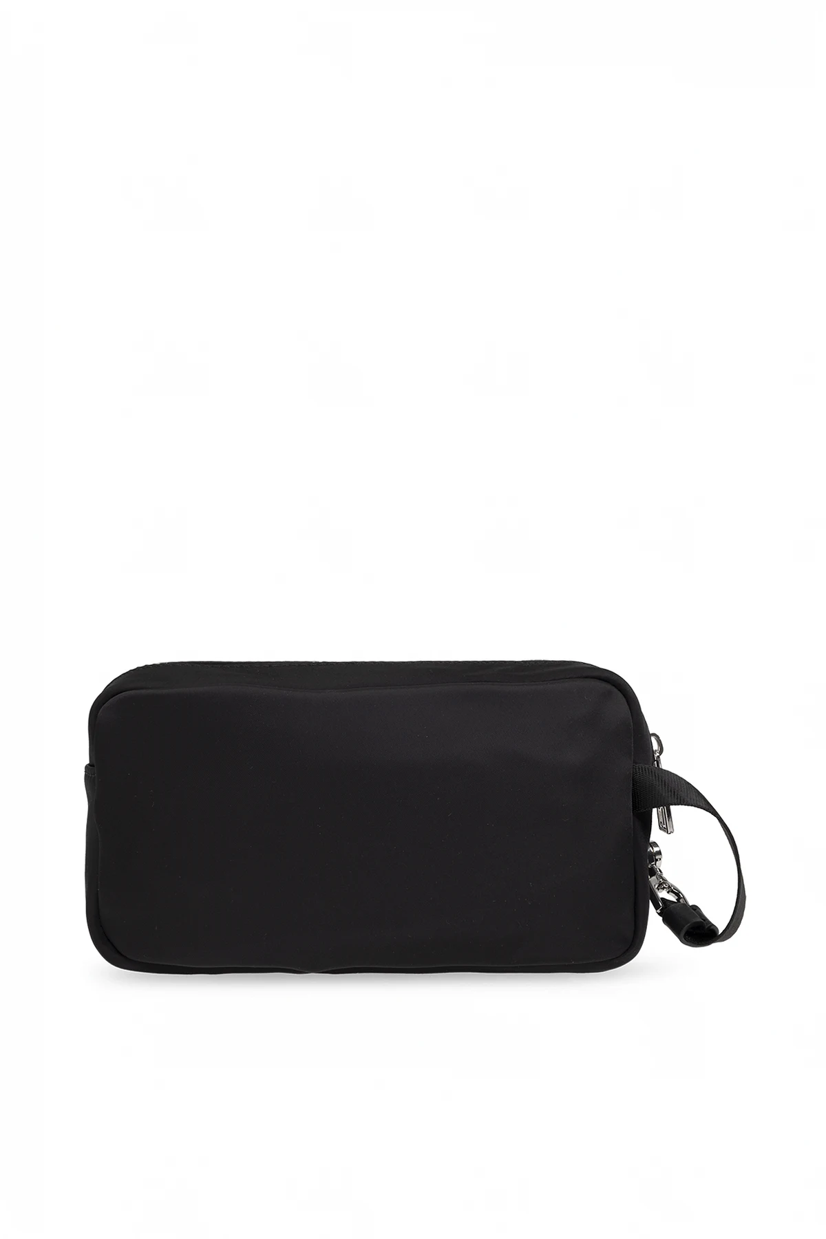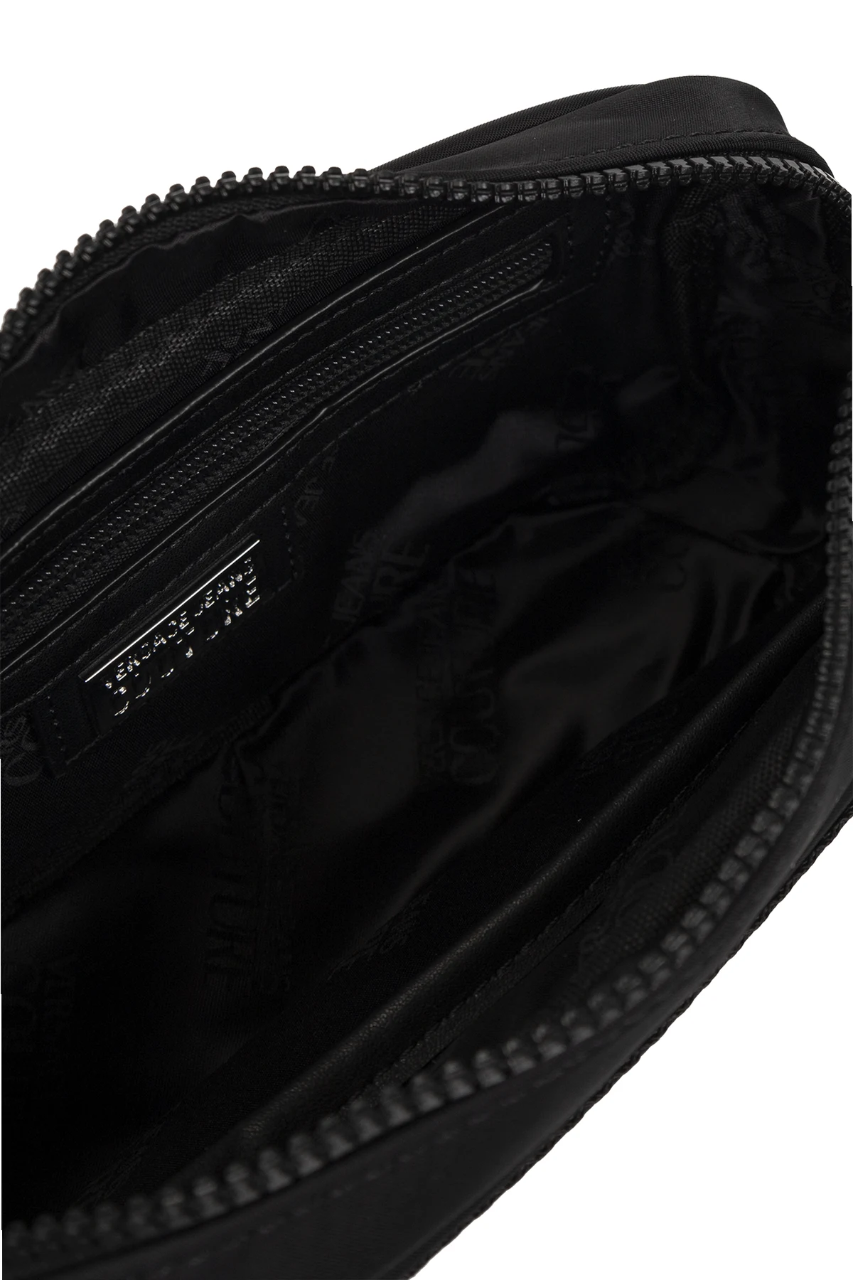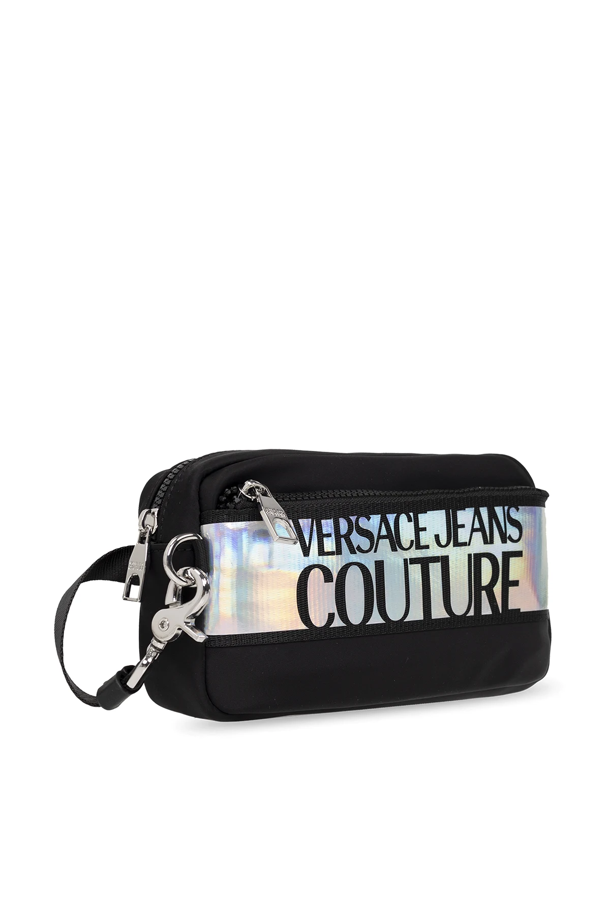 Czarna kosmetyczka Versace Jeans Couture. Wykonana z materiału. Zamykana na zamek. Ozdobiona nadrukiem z efektem holograficznym i logo. Z przodu kieszeń zamykana na zamek. Z boku półokrągła rączka z karabińczykiem. Wewnątrz komora, kieszeń zamykana na zamek i wsuwana kieszeń. Metalowe elementy w kolorze srebrnym.