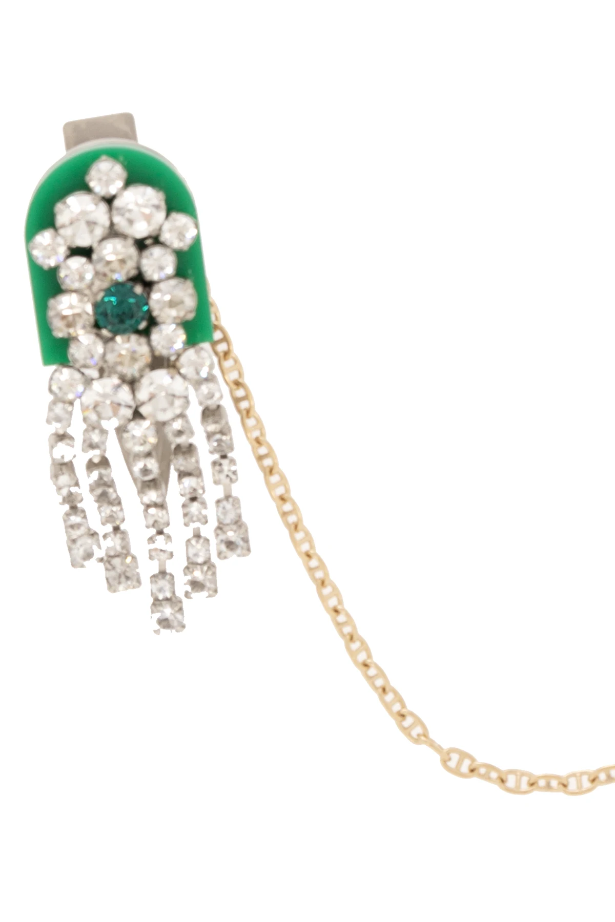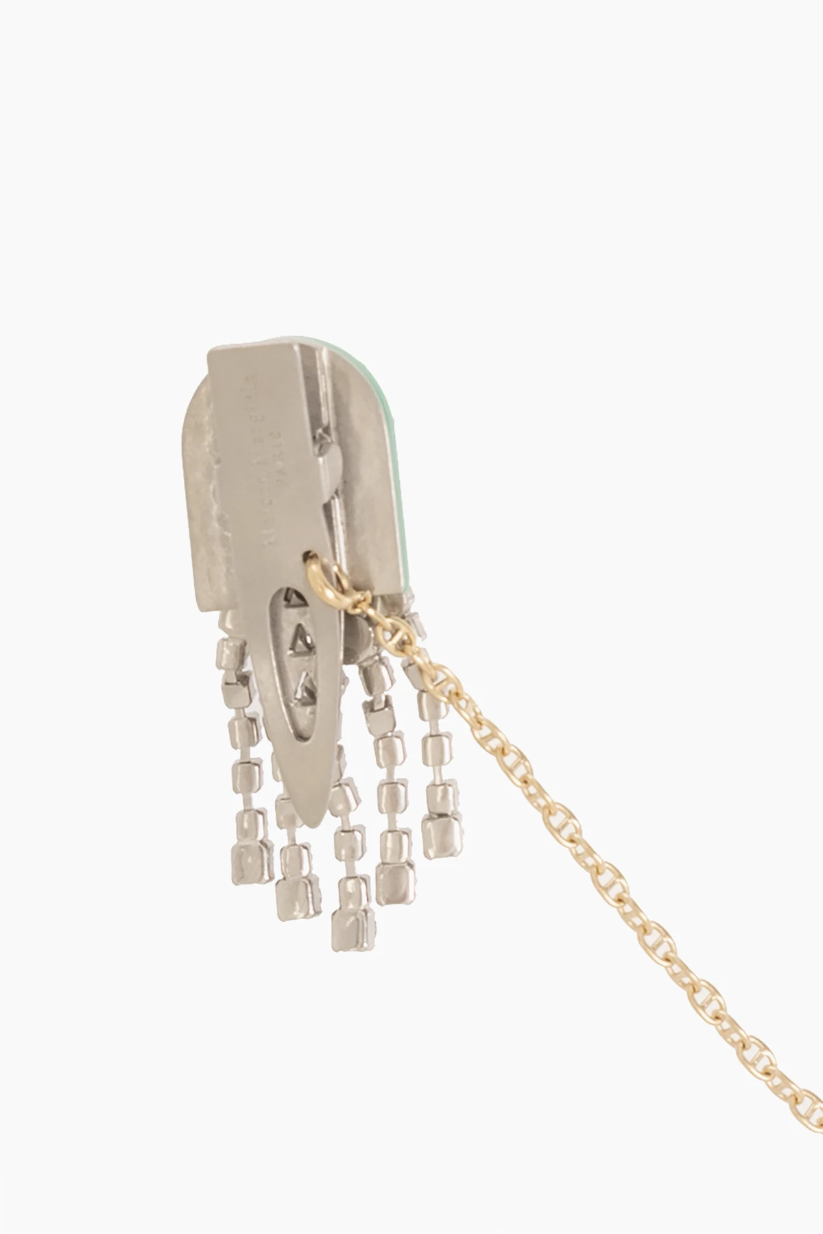 Mosiężna przypinka w kolorze srebrno-zielonym Maison Margiela. Wysadzana połyskującymi kryształami w kolorze białym i zielonym. Odpinany łańcuch w kolorze złotym.