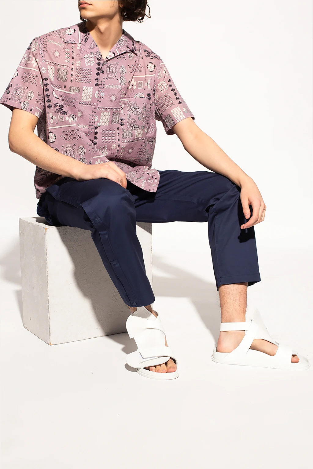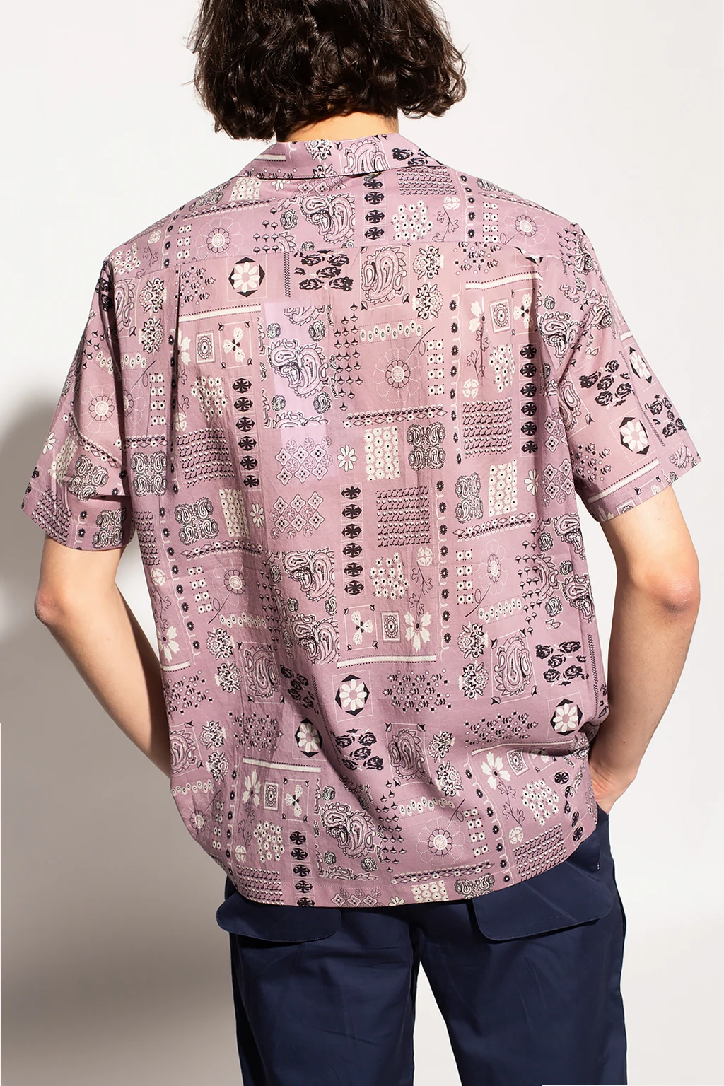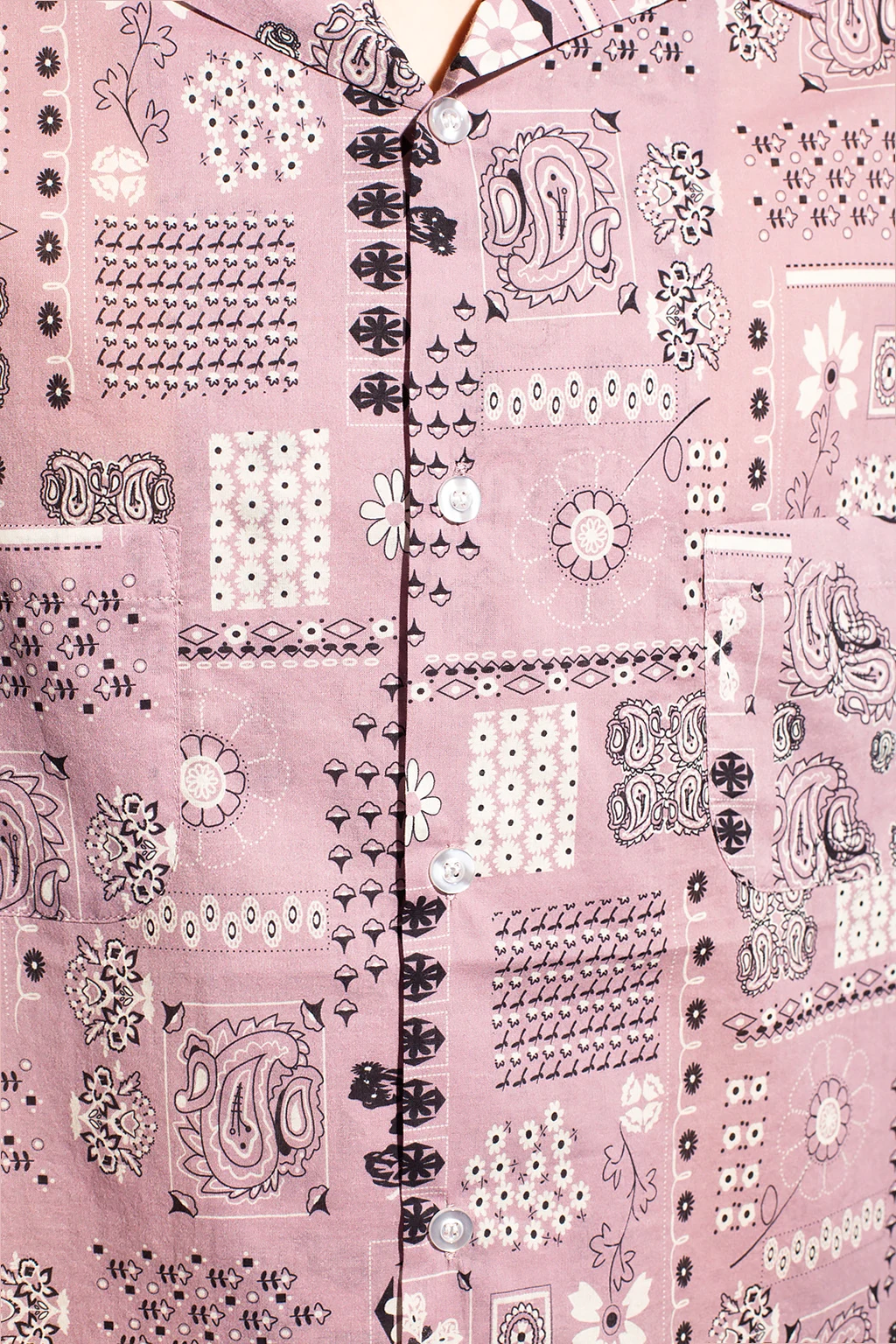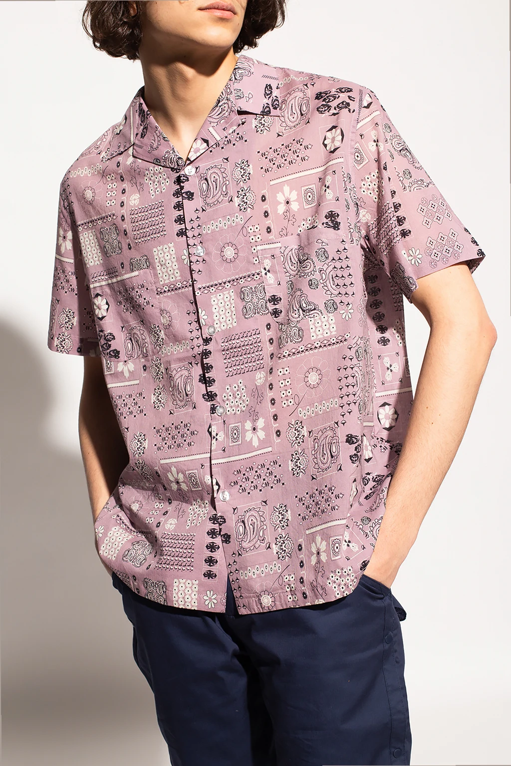 Fioletowa koszula z krótkimi rękawami Iro. Wykonana z bawełny. Zapinana na guziki. Nadrukowany czarno-biały wzór. Dwie wsuwane kieszenie.