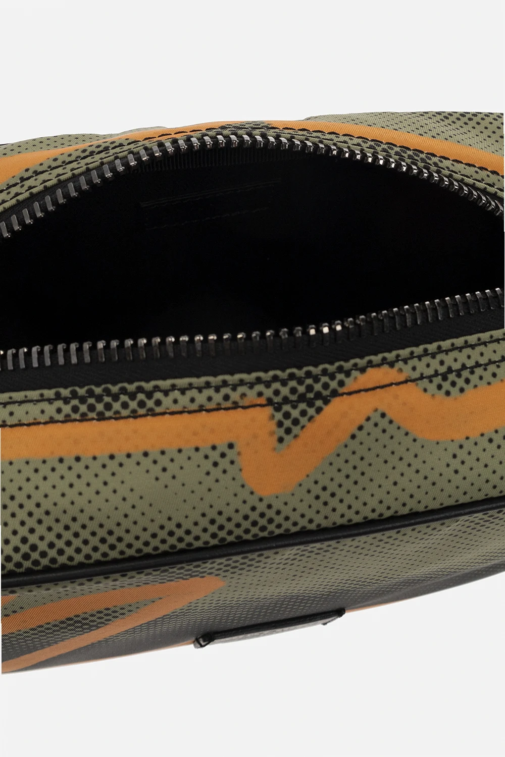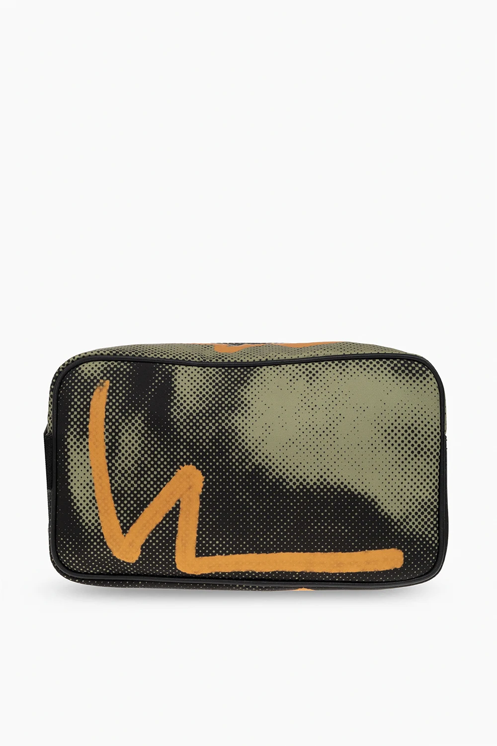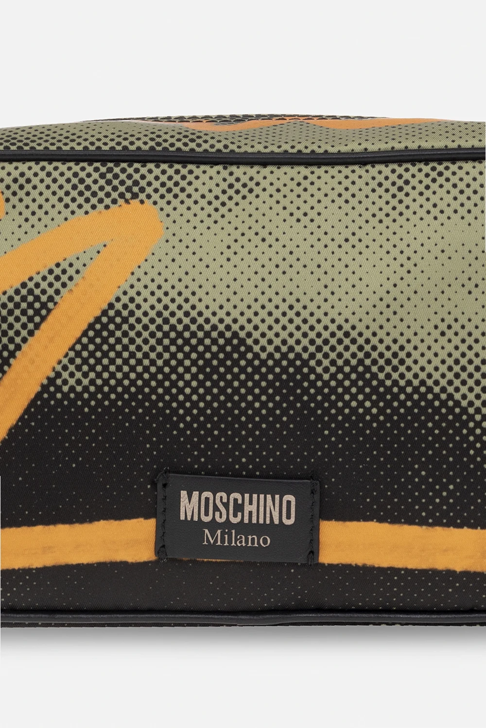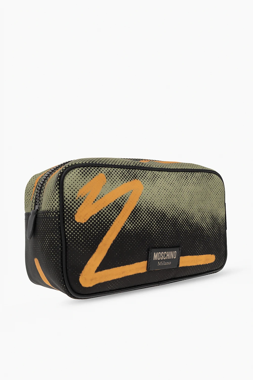 Zielono-czarno-pomarańczowa kosmetyczka Moschino. Zamykana na zamek. Ozdobiona wzorem oraz naszywką z logo. Z boku krótki uchwyt. Wewnątrz komora. Metalowe wykończenie w kolorze srebrnym.