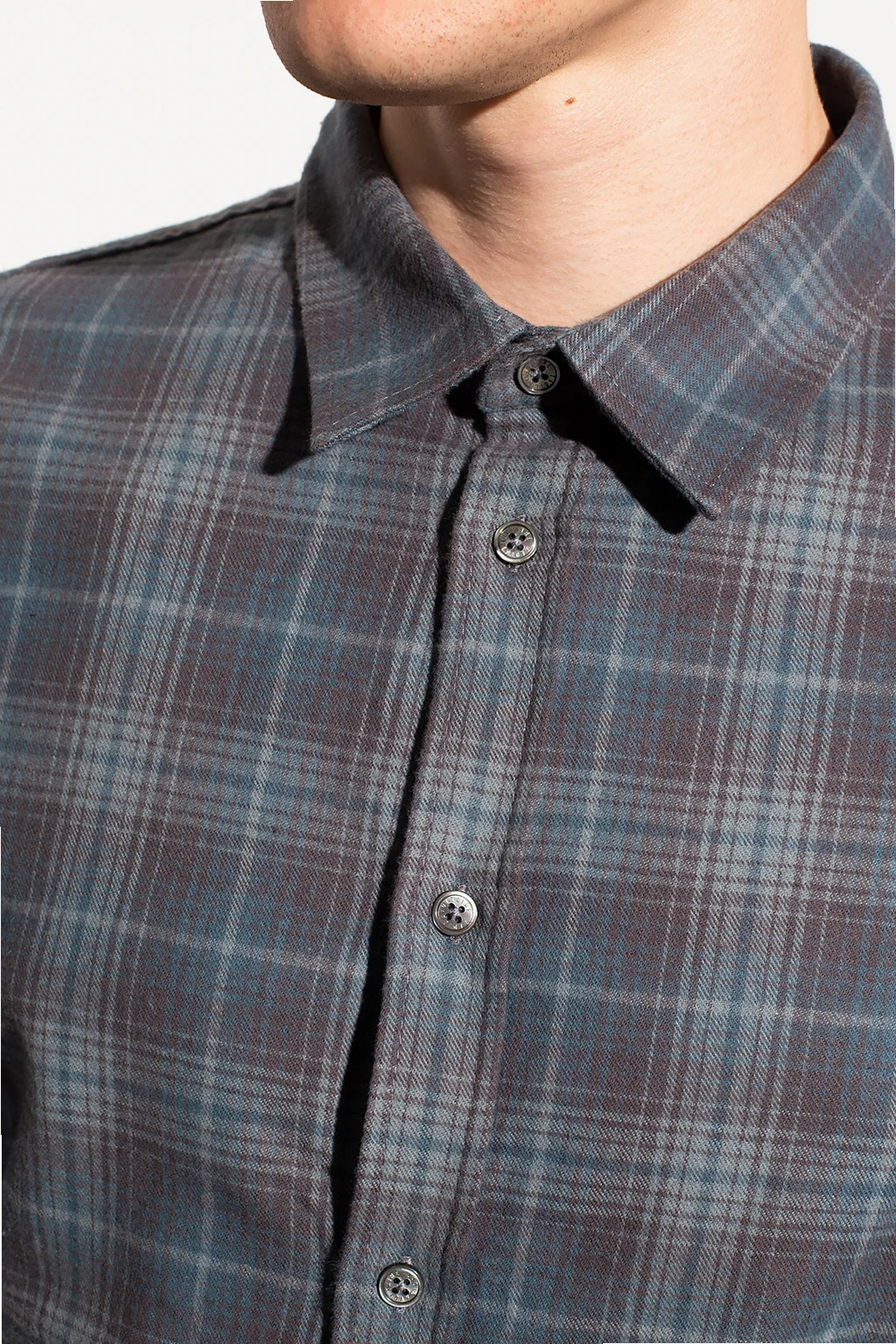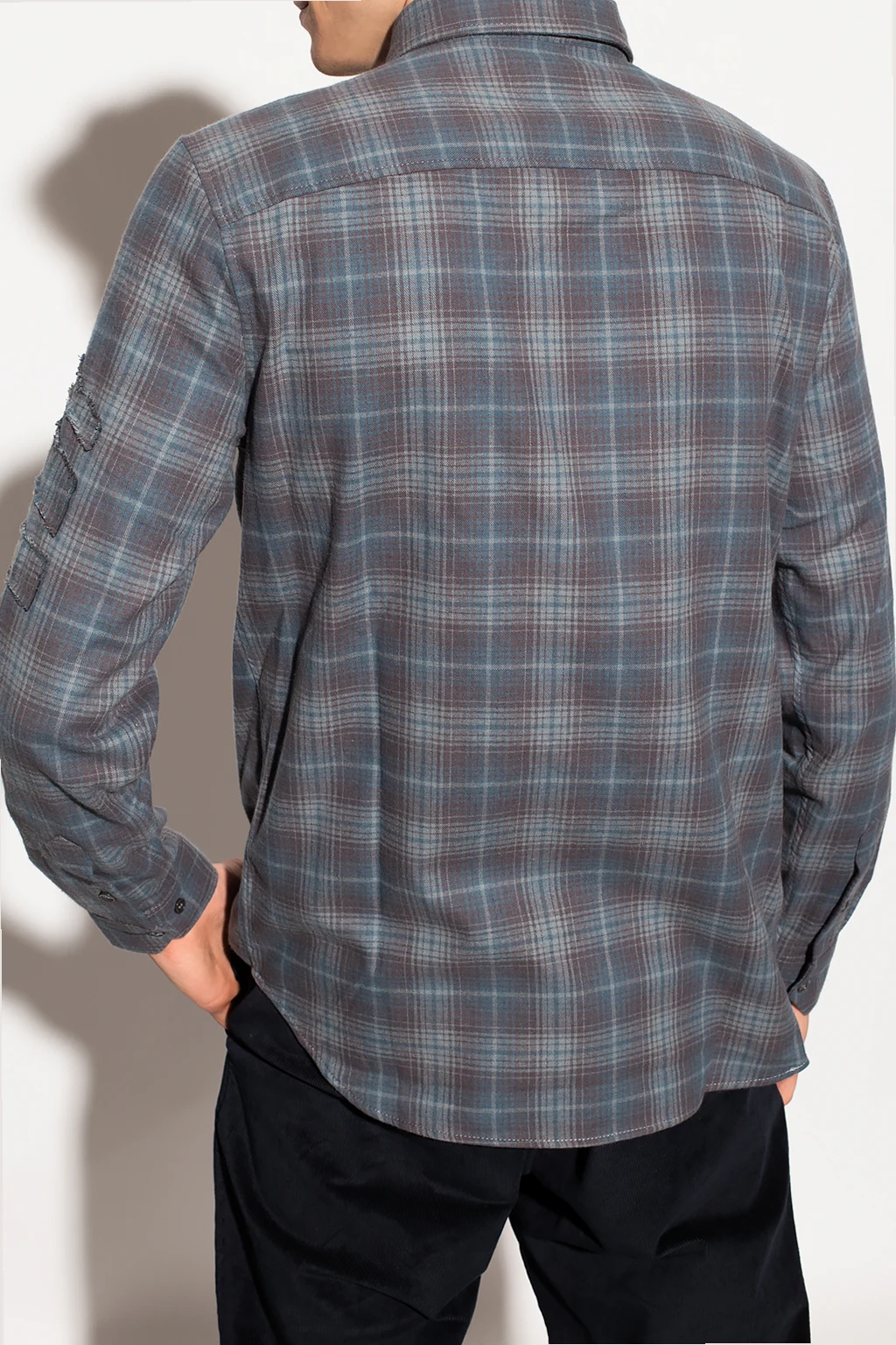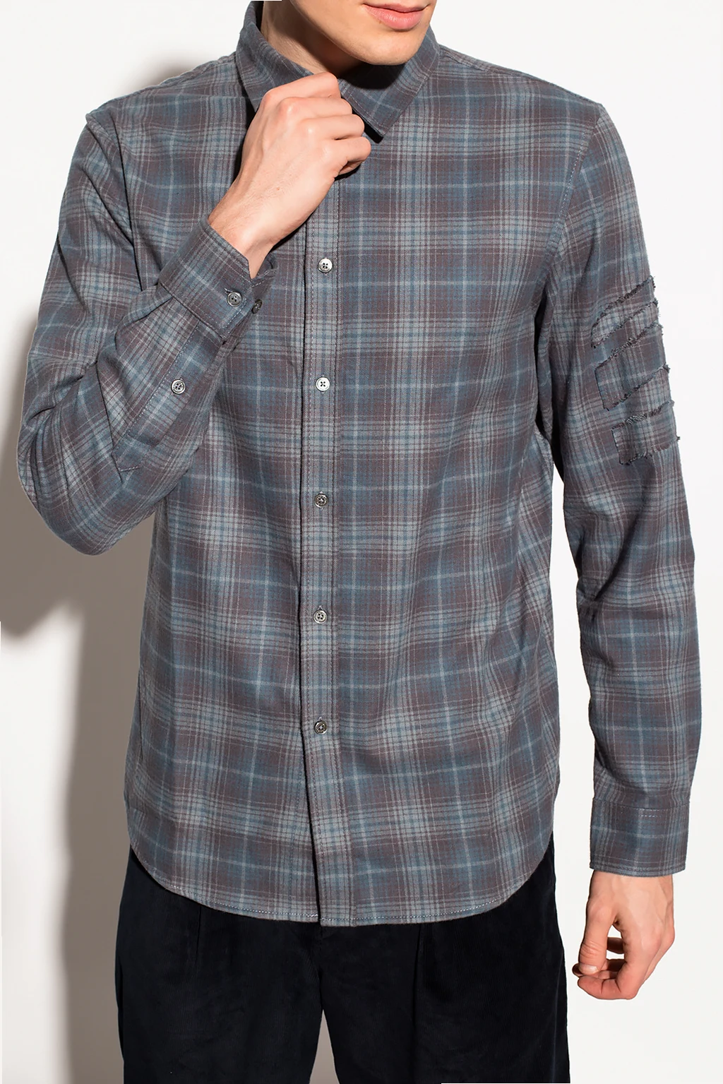 Niebiesko-szara, bawełniana koszula Zadig & Voltaire. Zapinana na guziki. Na rękawie naszywki z surowym wykończeniem. Ozdobiona wzorem w kratę. Rękawy zakończone mankietem z zapięciem na guziki.