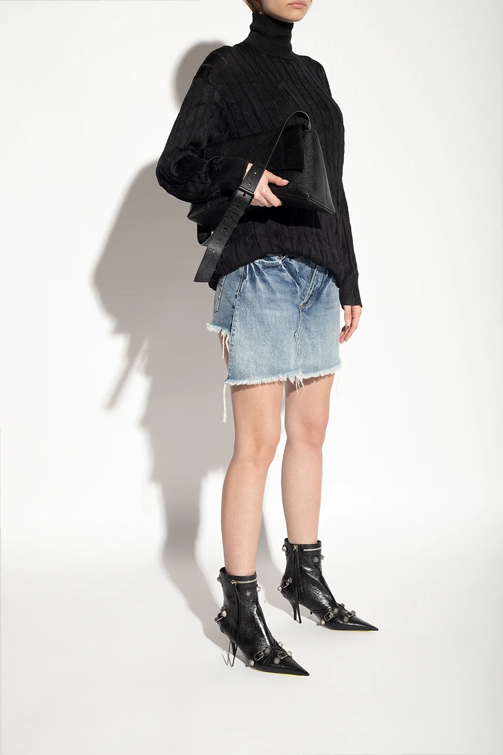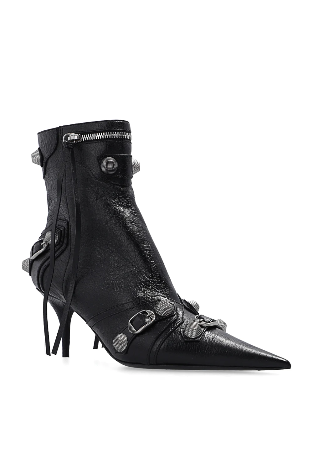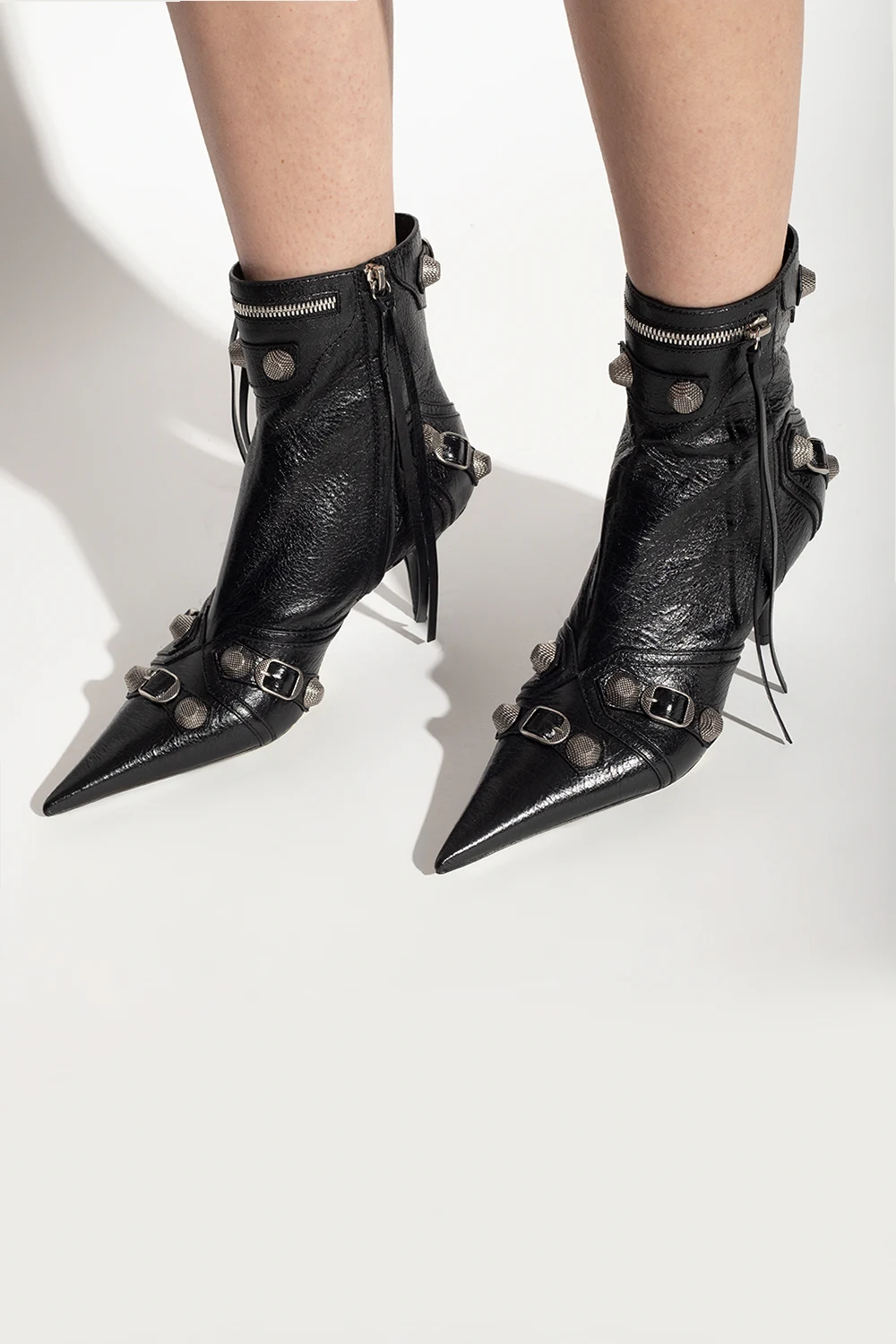Czarne botki za kostkę na obcasie, model ‘Cagole’ Balenciaga. Wykonane z lakierowanej, marszczonej skóry jagnięcej. Z boku zapinane na zamek z długimi frędzlami. Ozdobione metalowymi klamrami, wypukłymi aplikacjami oraz suwakami w kolorze postarzanego srebra. Nosek w szpic. Czarna podeszwa wykonana ze skóry.