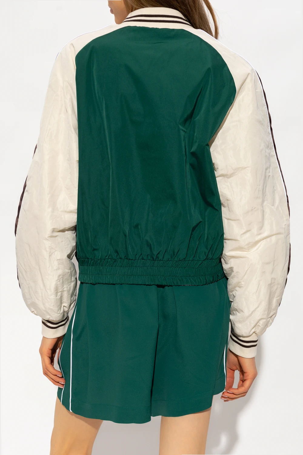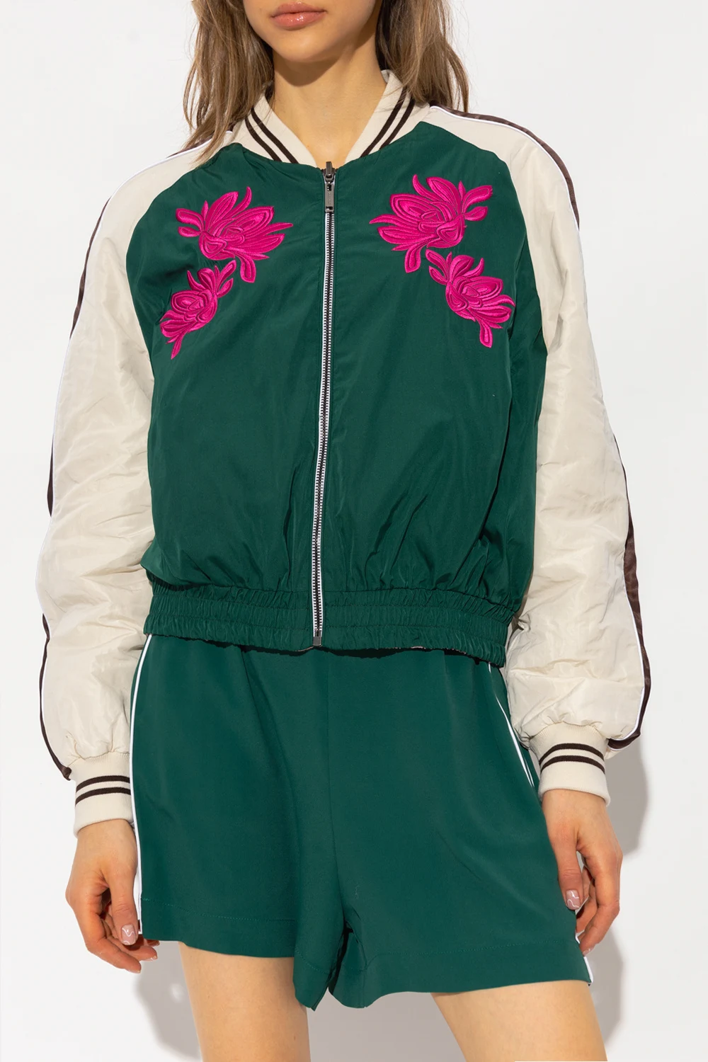 Zielono-różowa, dwustronna kurtka typu ‘bomber’ Iceberg. Zapinana na zamek. Ozdobiona wyhaftowanym wzorem z motywem roślinnym i logo. Stójka, dół i długie rękawy wykończone ściągaczem.