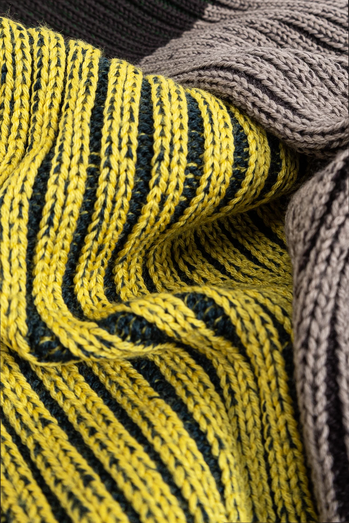 Wykonany w całości z najwyższej jakości wełny, szal posiada prążkowaną fakturę , która nadaje mu efekt trójwymiarowości i elegancji. Zdjęcia produktu ukazują nie tylko jego strukturalny wzór, ale również sposób, w jaki układa się na sylwetce, podkreślając kontrast i bogactwo kolorów.