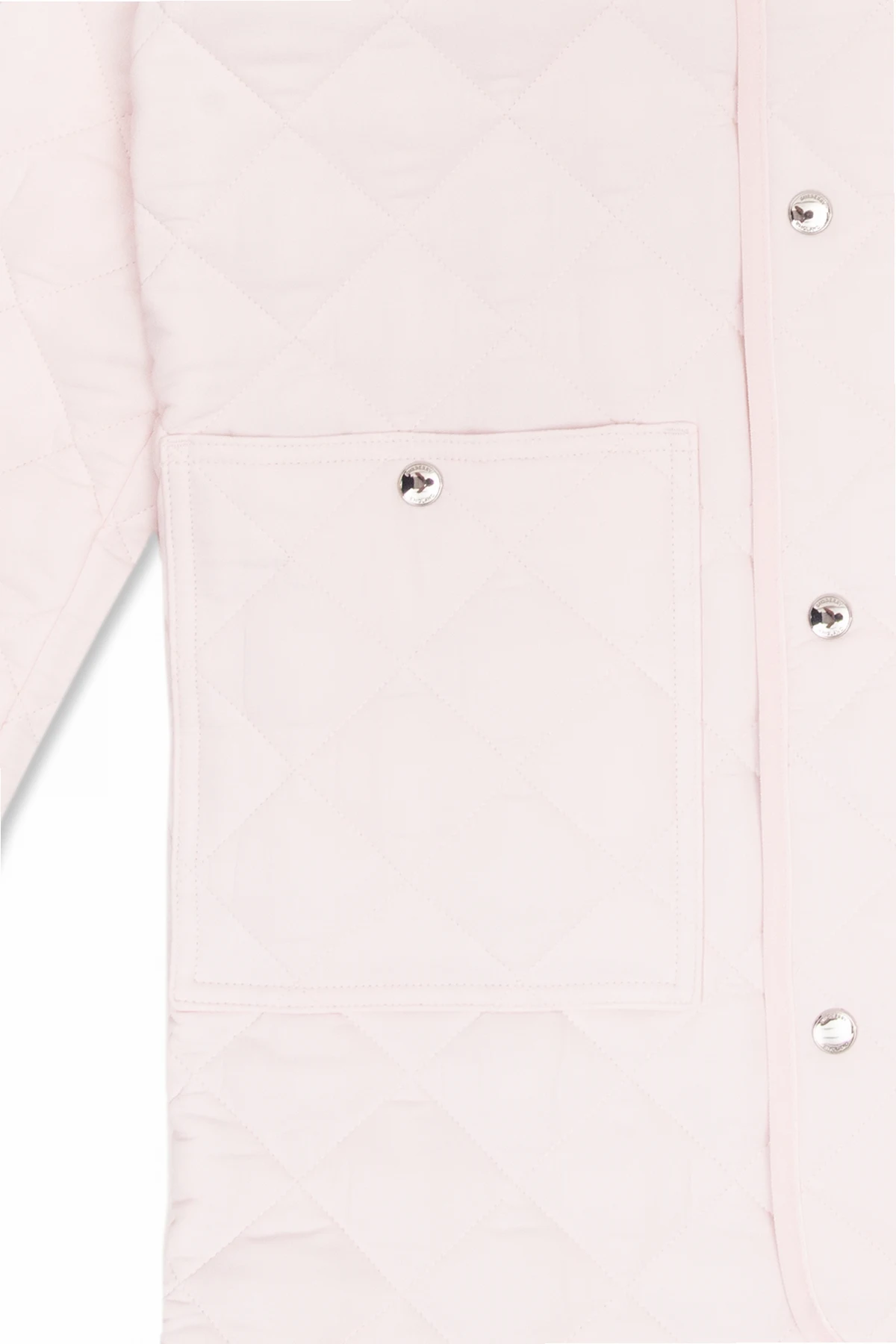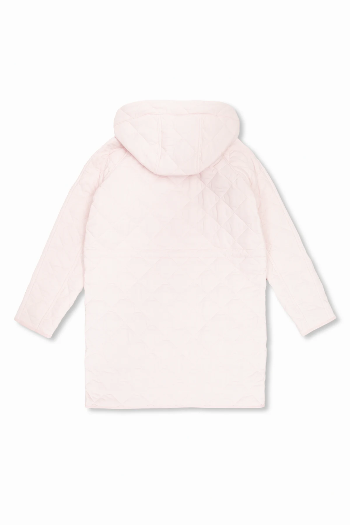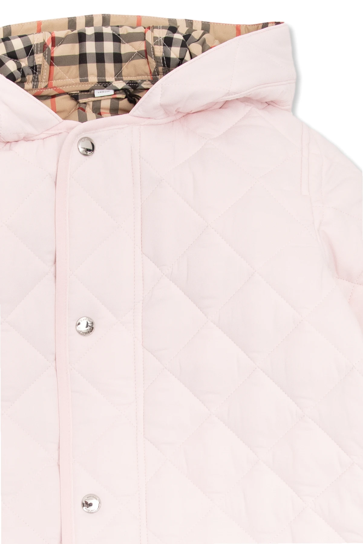 Jasnoróżowa, pikowana i ocieplana kurtka z kapturem, model ‘Reilly’ Burberry Kids. Zapinana na dwubiegunowy zamek i zatrzaski. Dwie kieszenie zapinane na zatrzask. Długie rękawy. Beżowa warstwa wewnętrzna ozdobiona charakterystycznym wzorem w kratę.