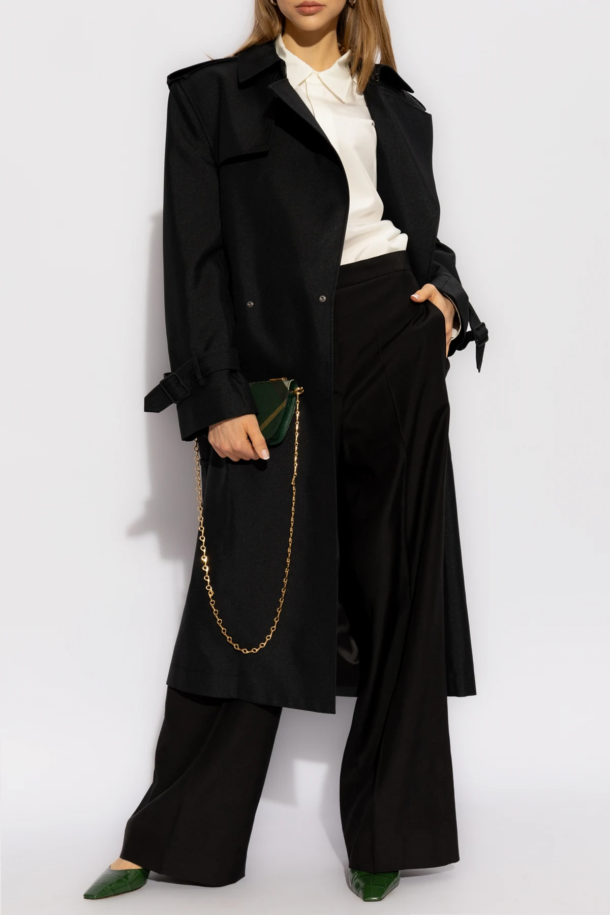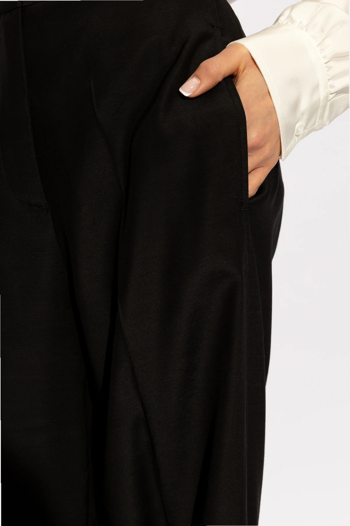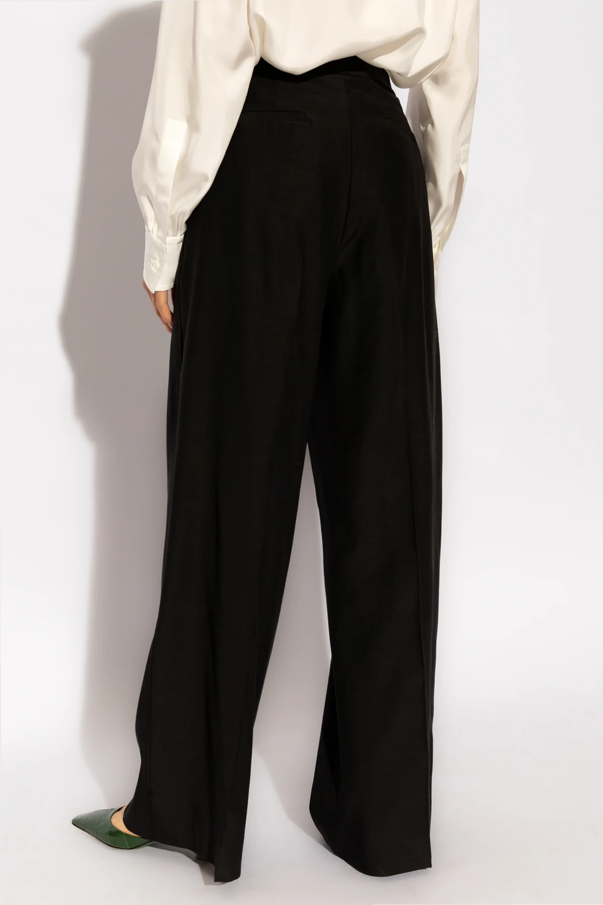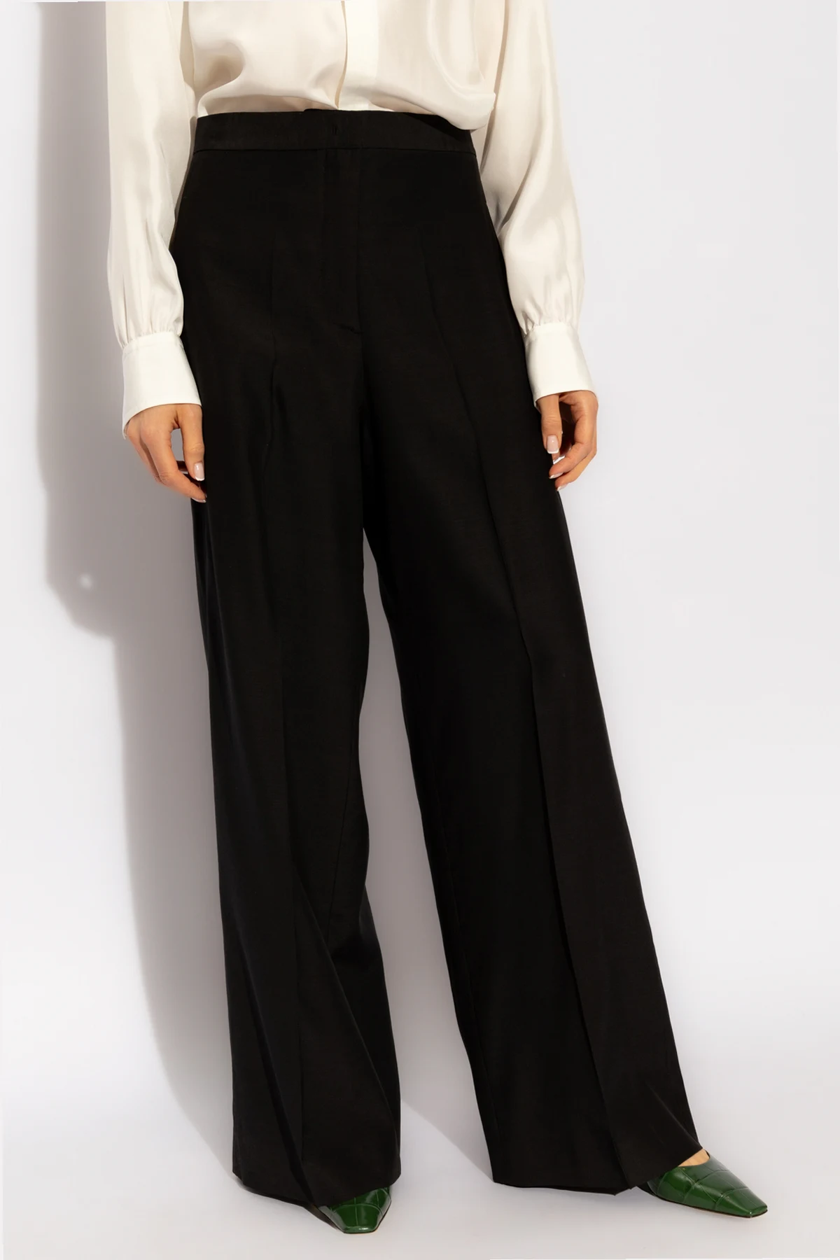 Kompozycja materiałowa, w której dominuje wełna połączona z jedwabiem , gwarantuje nie tylko nieporównywalny komfort noszenia, ale również trwałość i odporność na zagniecenia. Wysoki stan w połączeniu z długimi, luźnymi nogawkami o prostym kroju wizualnie wydłuża sylwetkę, zaś funkcjonalne, głębokie kieszenie boczne dodają spodniom praktycznego uroku.