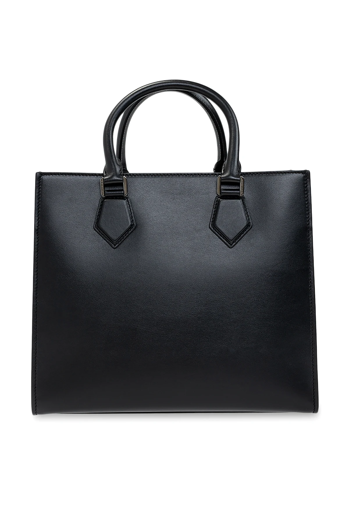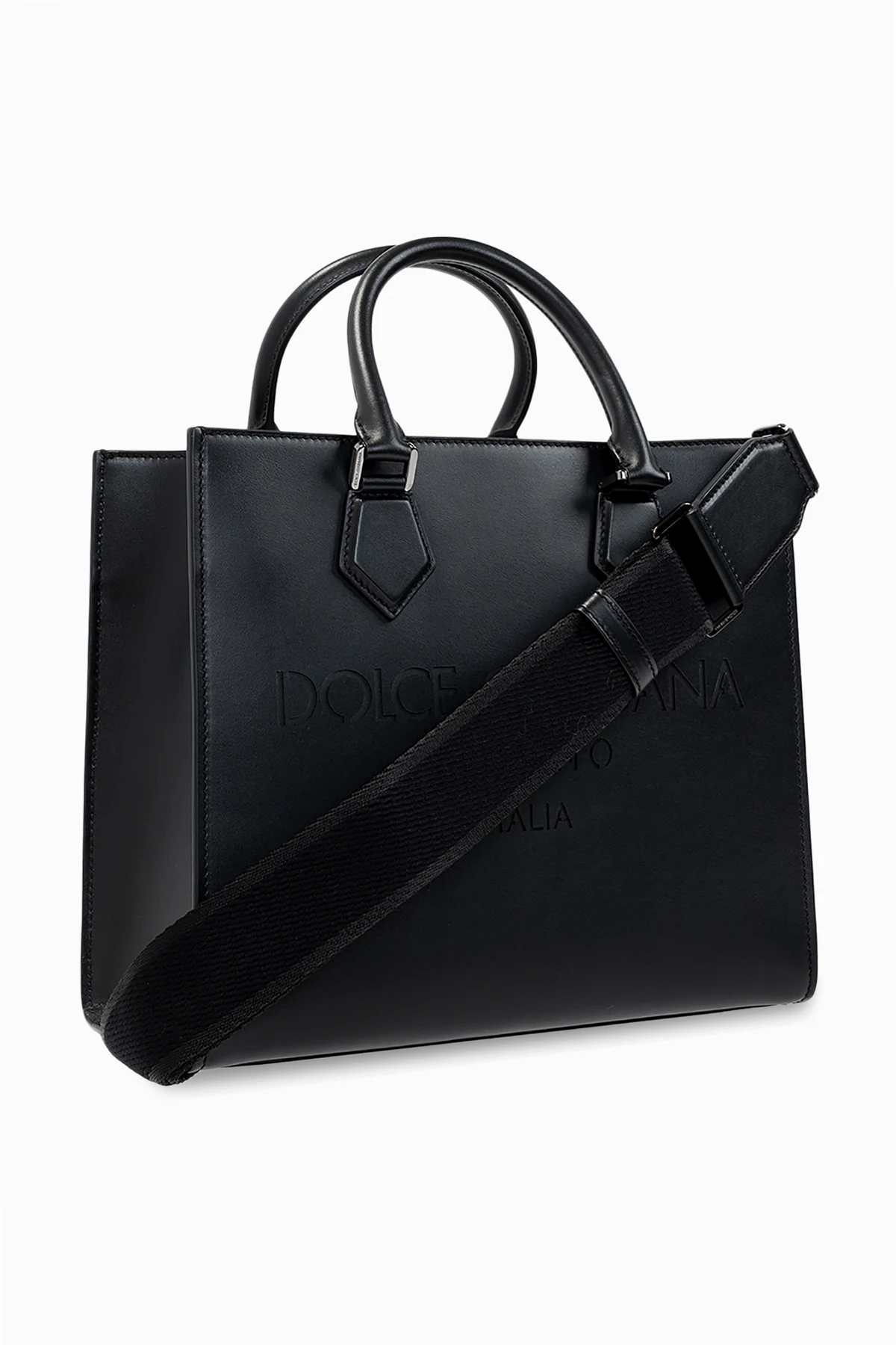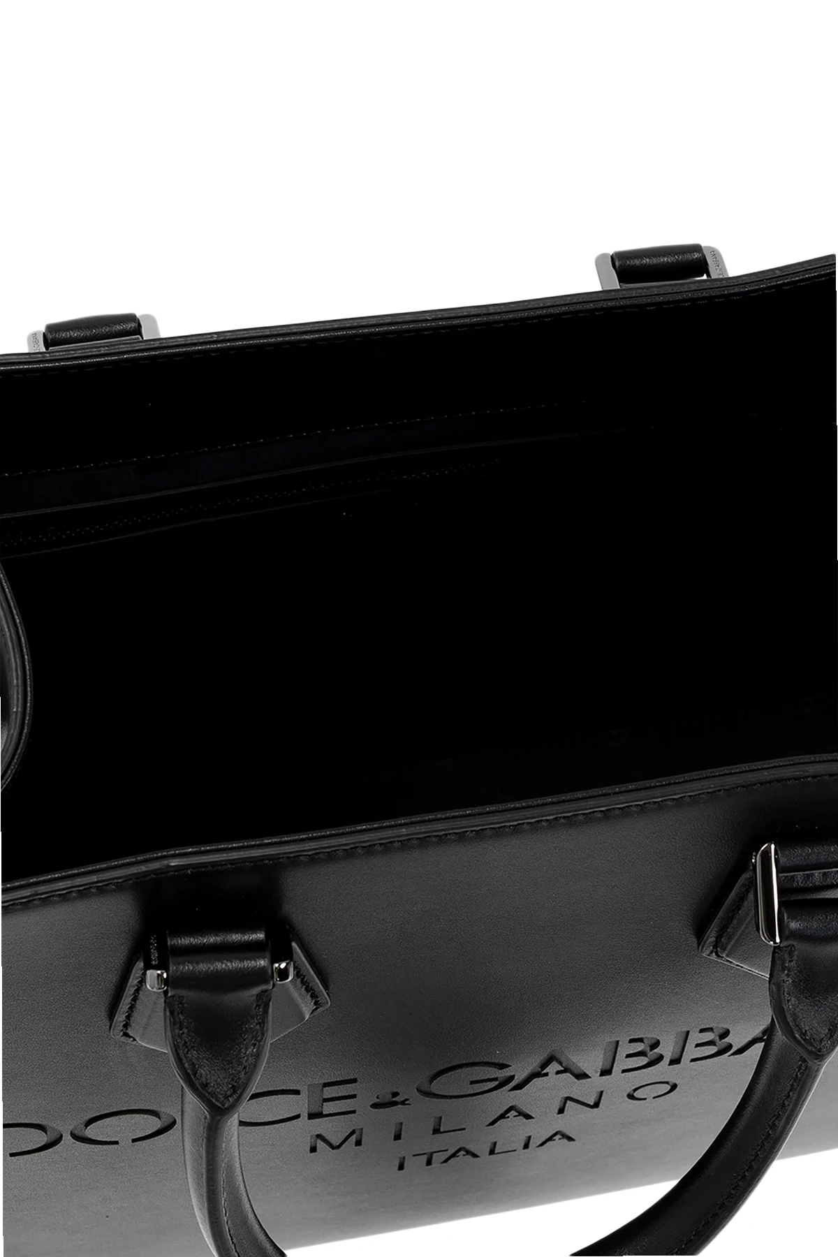 Czarna torba typu ‘shopper’, model ‘Edge’ Dolce & Gabbana. Wykonana z cielęcej skóry. Z przodu ozdobiona perforowanym logo. Dwie półokrągłe rączki. Odpinany, regulowany pasek. Wewnątrz komora, kieszeń zamykana na zamek i dwie wsuwane kieszenie. Metalowe elementy w kolorze srebrnym.