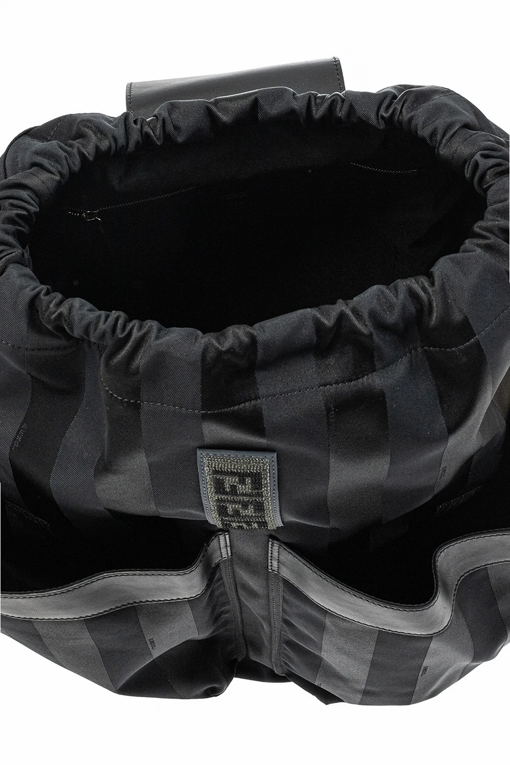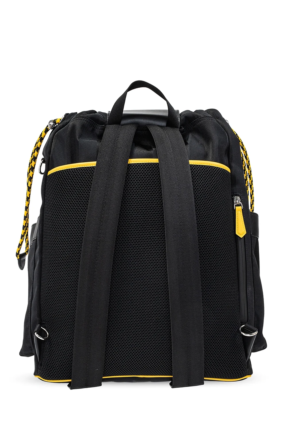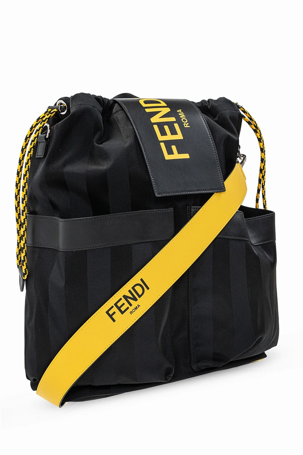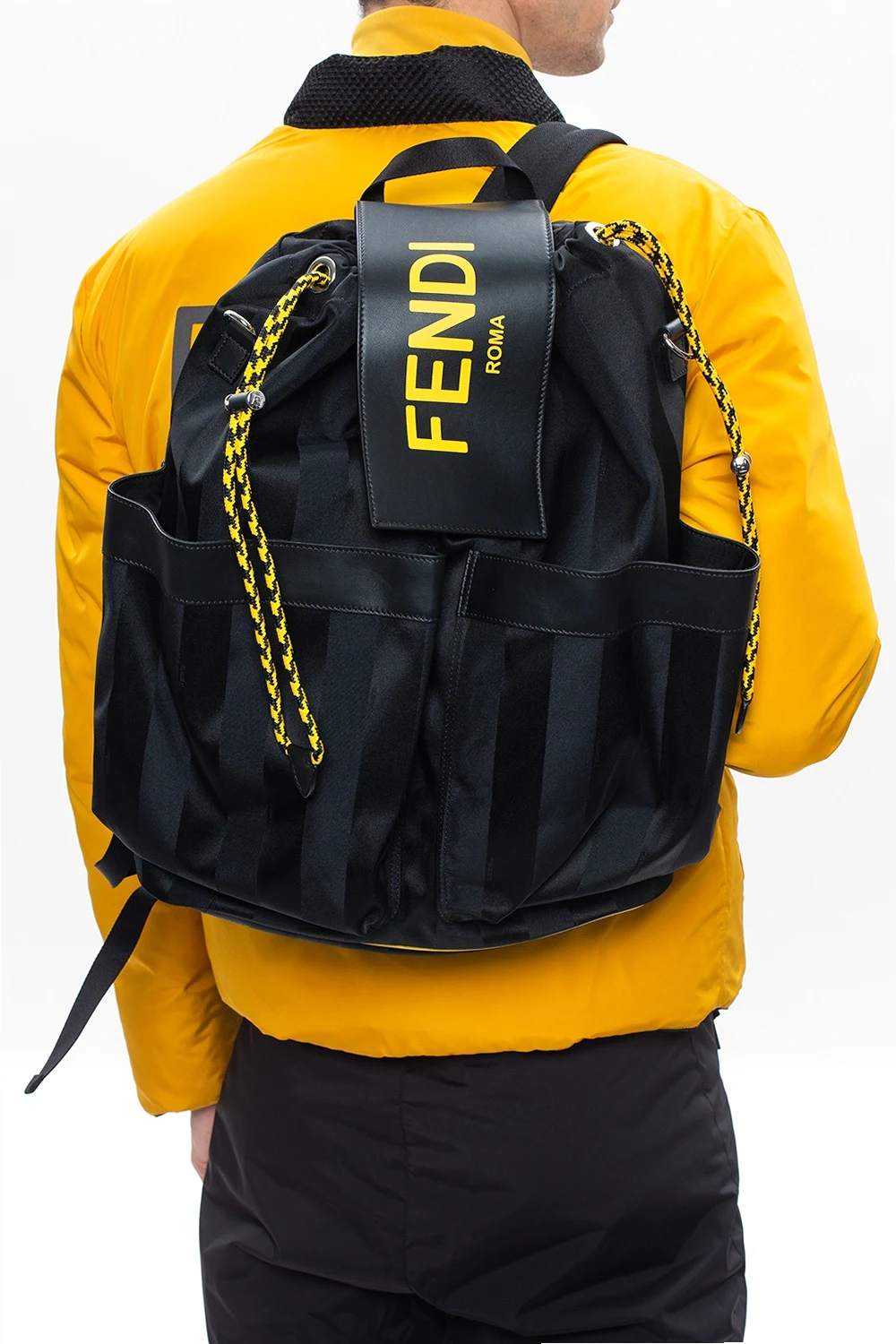 Czarno-żółty plecak z licznymi kieszeniami Fendi. Ściągany trokami i zapinany na rzep. Ozdobiony nadrukowanym logo. Półokrągła rączka i regulowane szelki. Wewnątrz komora i kieszeń zamykana na zamek. Dołączony odpinany pasek z logo.