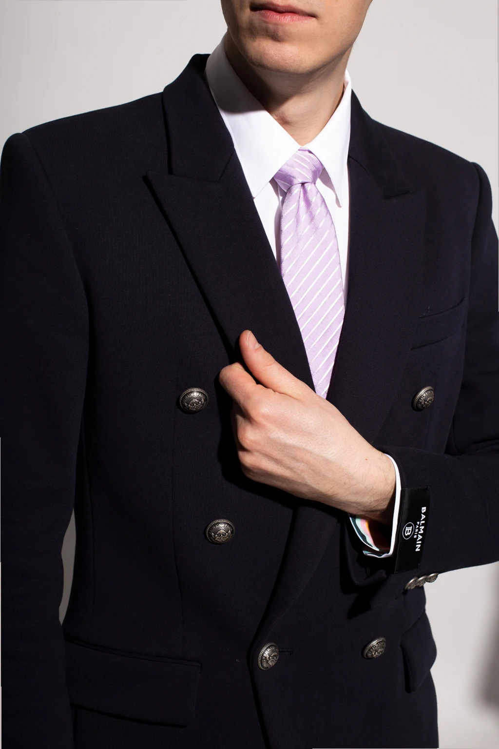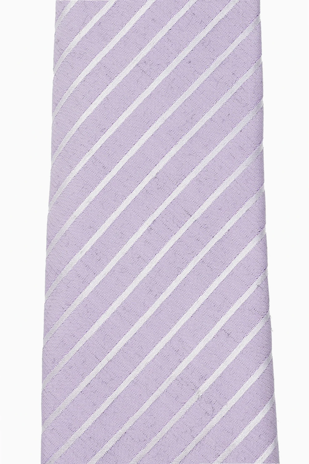 Fioletowy, jedwabny krawat Giorgio Armani. Ozdobiony wzorem w paski w kolorze srebrnym.