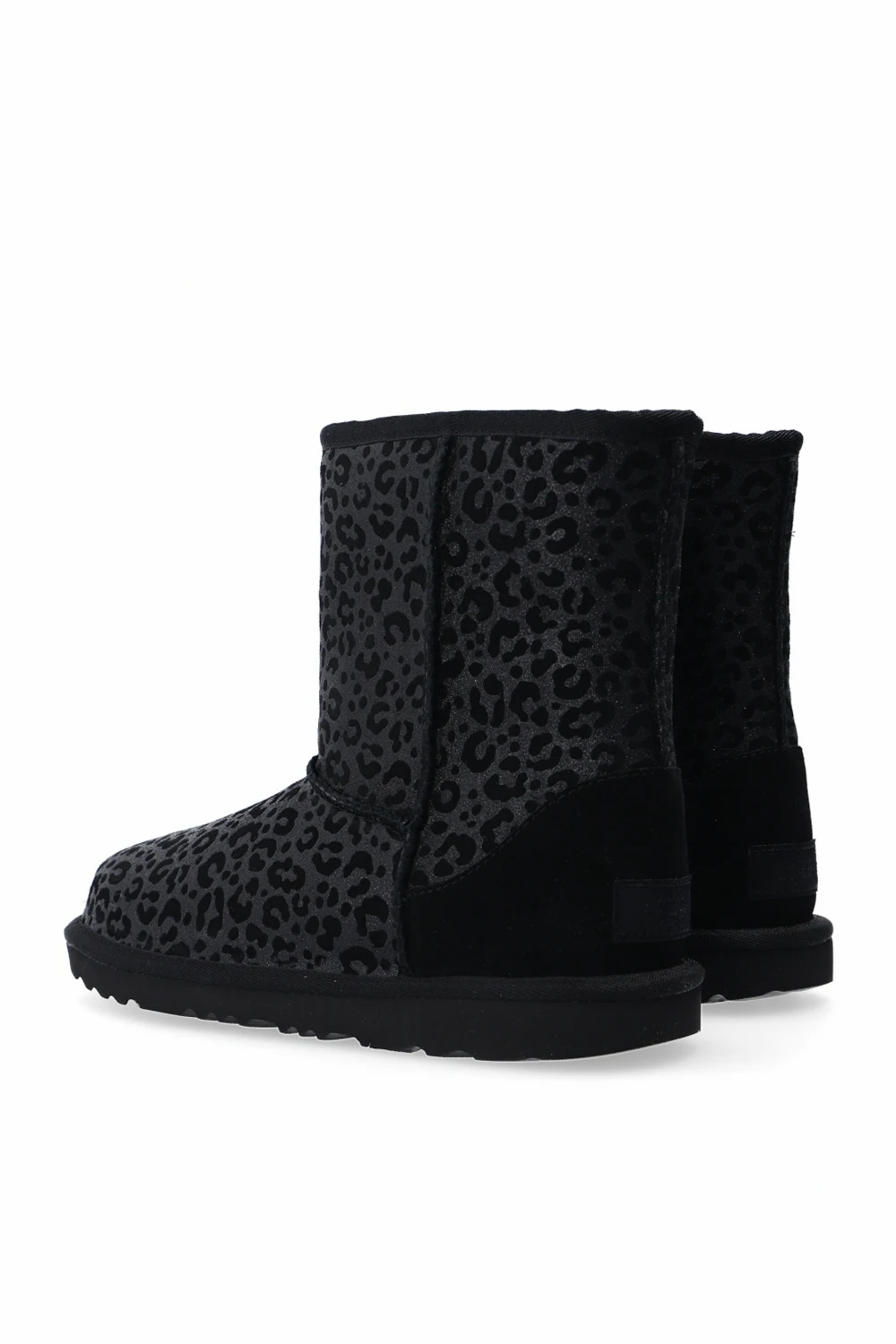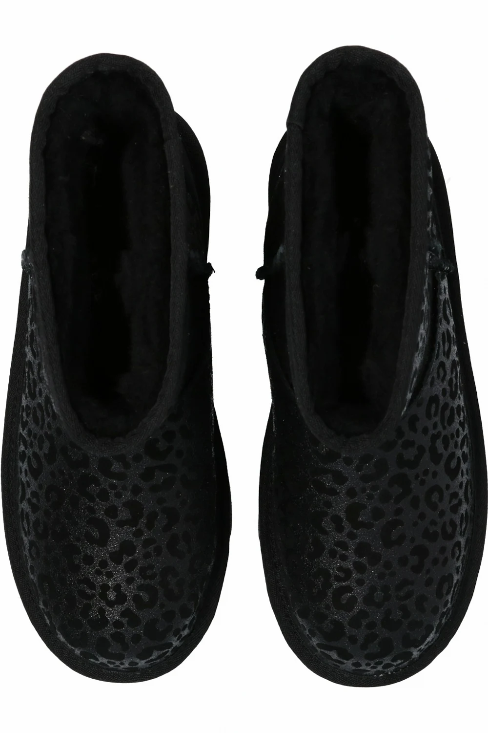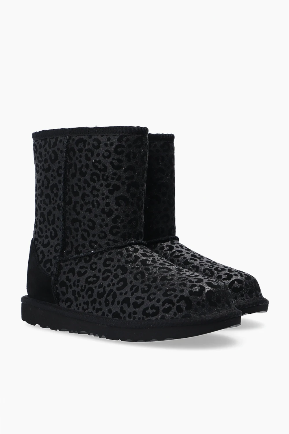 Czarne, zamszowe śniegowce, model ‘T-Classic II Glitter Leopard’ UGG Kids. Ocieplane wełną owczą. Ozdobione przeszyciami, wzorem w cętki oraz brokatem w kolorze srebrnym. Z tyłu naszyta aplikacja z logo. Czarna podeszwa o specjalnej fakturze wykonana z pianki EVA.