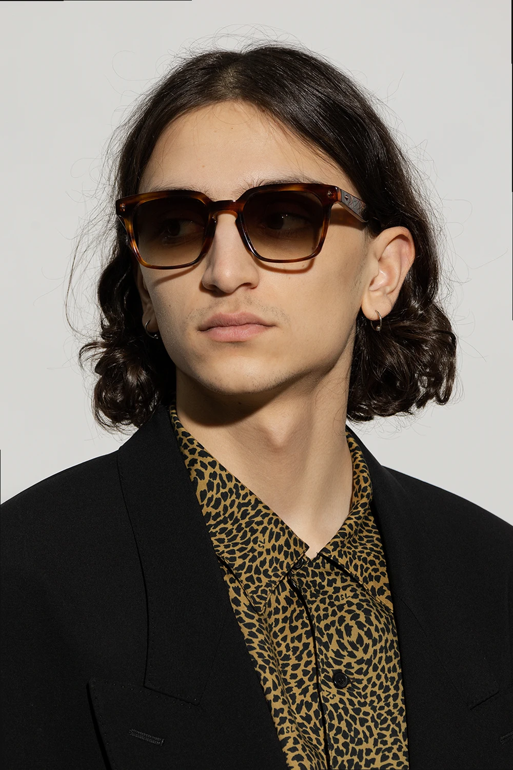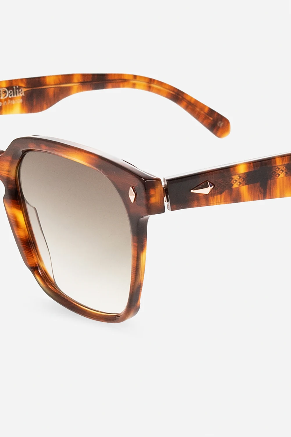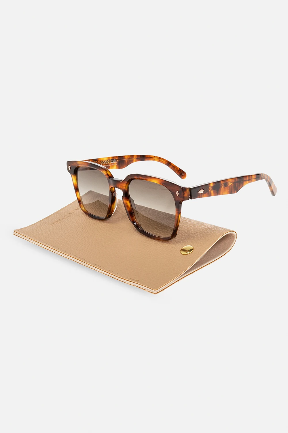 Brązowo-pomarańczowe okulary przeciwsłoneczne, model ‘Francesco’ John Dalia. Kwadratowe, szylkretowe oprawki z pojedynczym mostkiem, wykonane z 6-milimetrowej płyty octanowej. Aplikacje z przodu i na zausznikach pokryte różowym złotem. Brązowe, gradientowe soczewki ze 100% ochroną przed promieniami UVA/UVB. Dołączone etui.