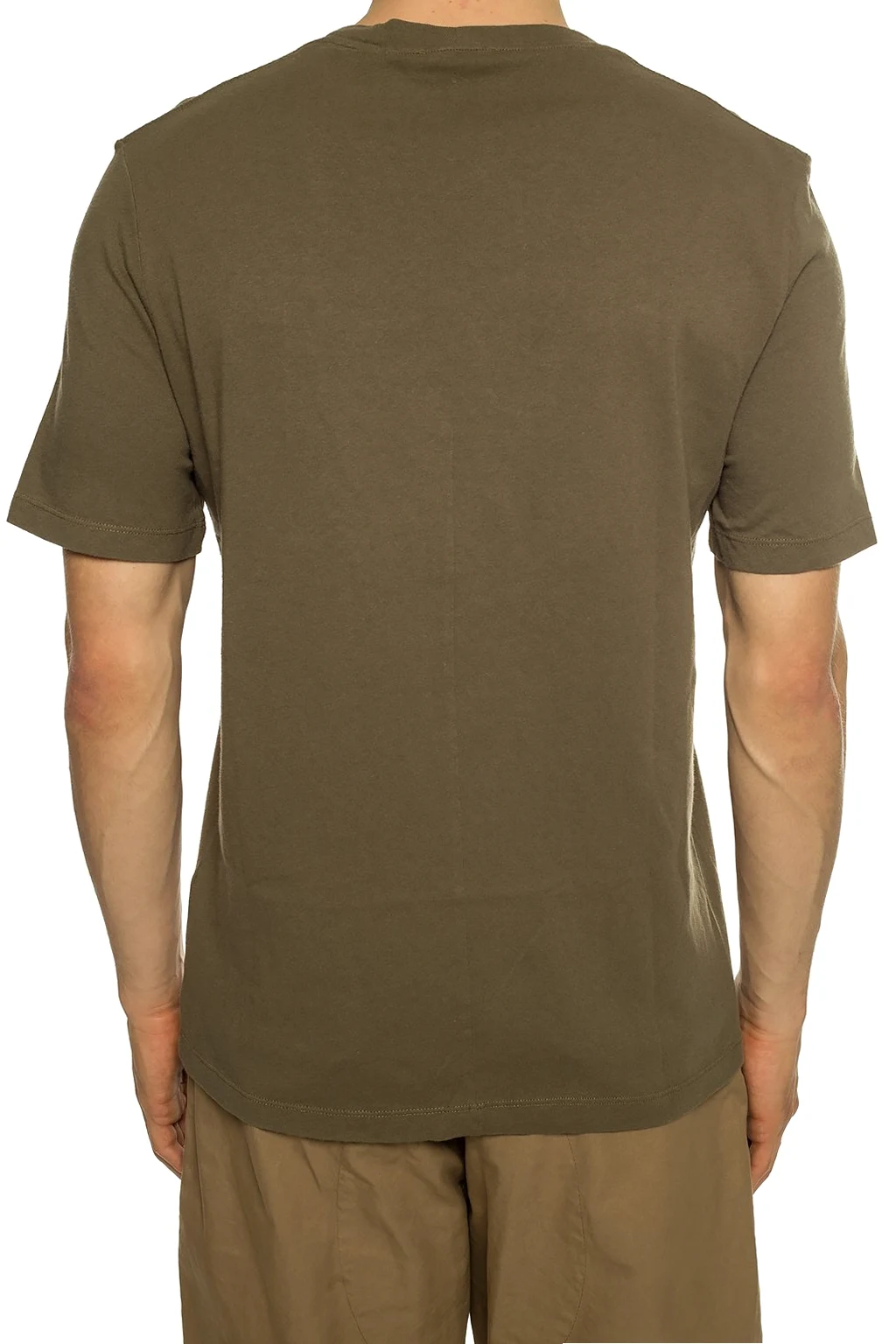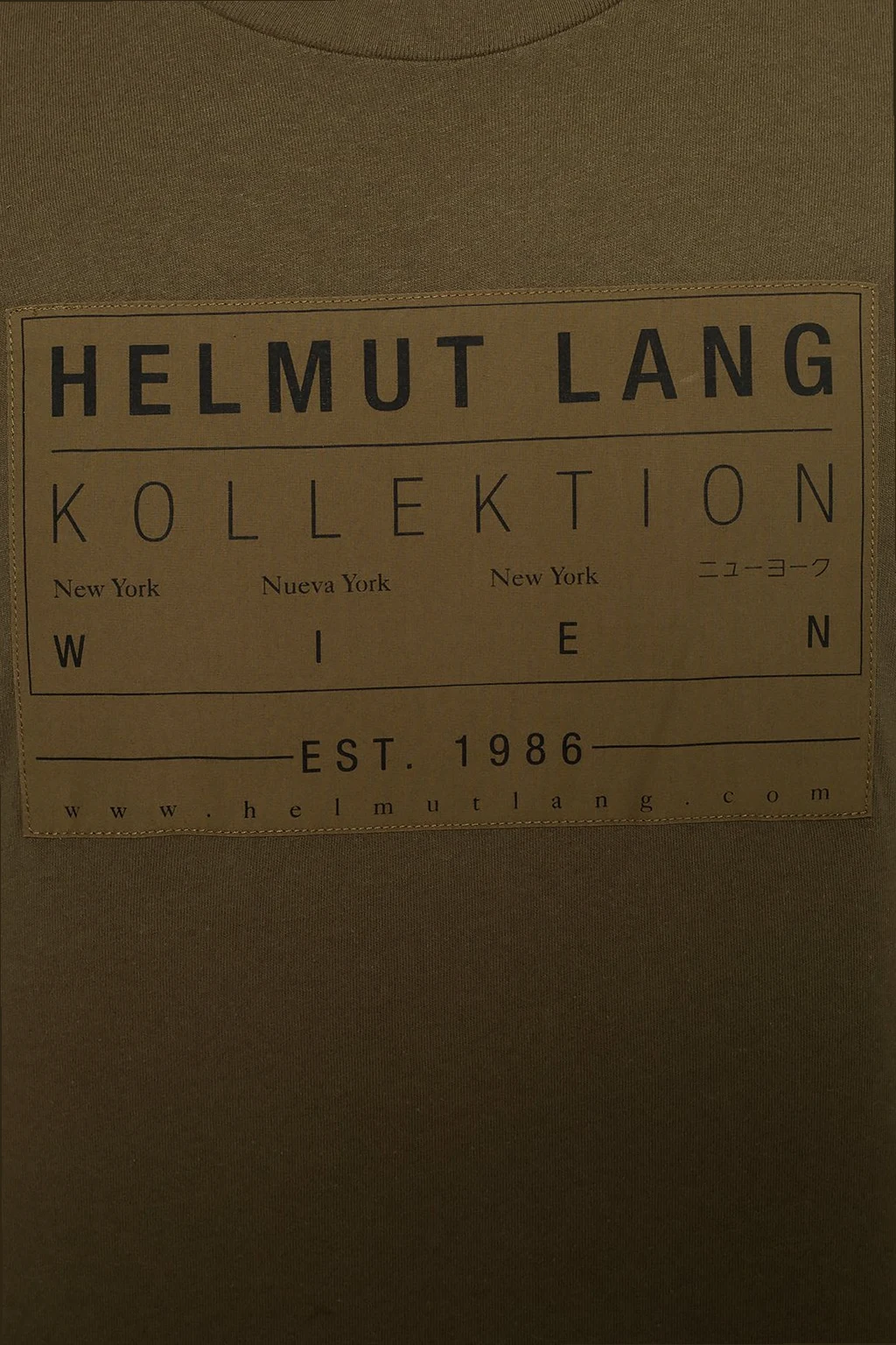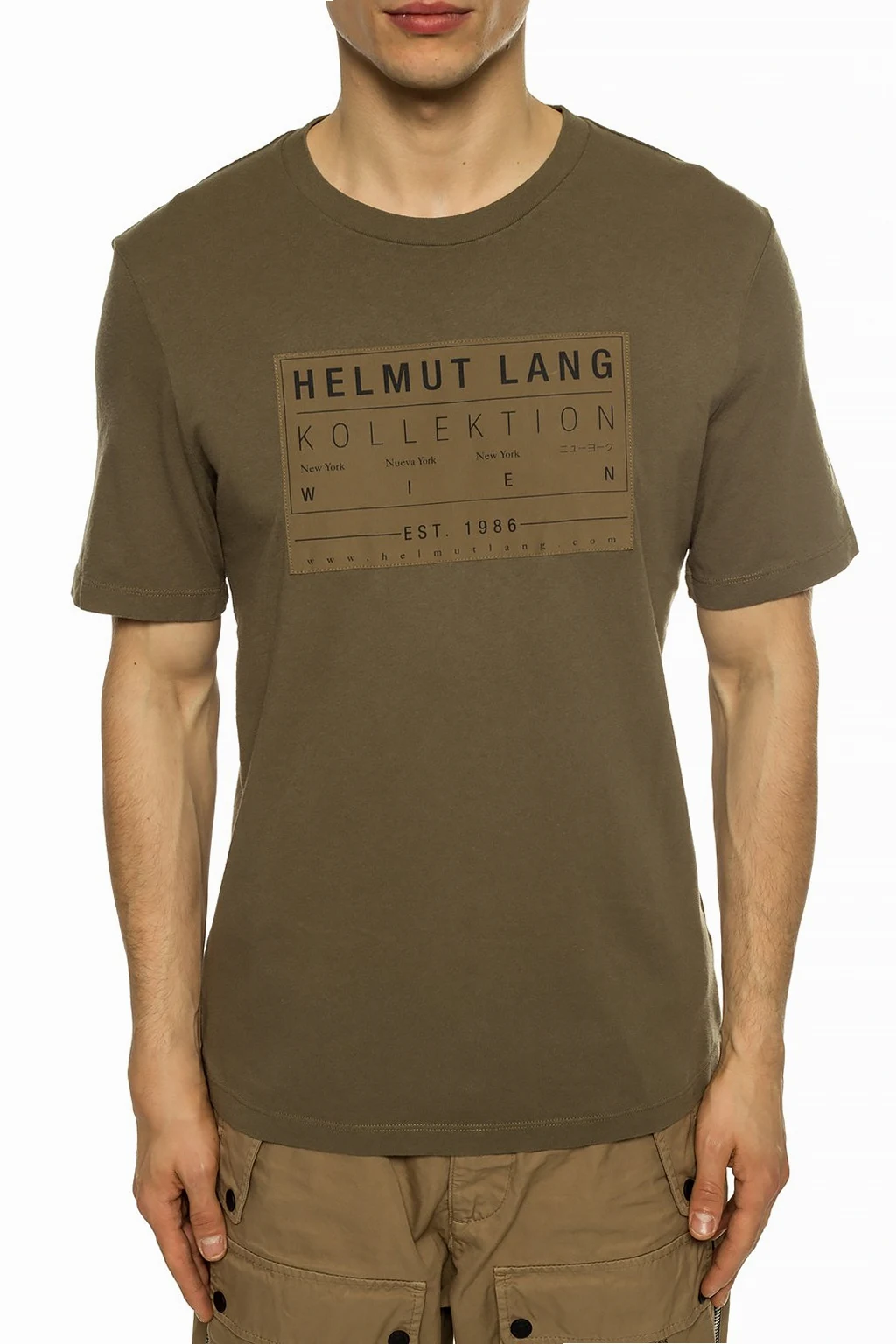 Zielono-brązowy, bawełniany t-shirt Helmut Lang. Ozdobiony brązową naszywką z nadrukowanym logo w kolorze czarnym. Okrągły dekolt zakończony ściągaczem.