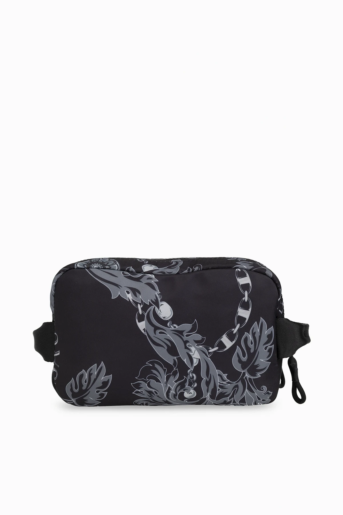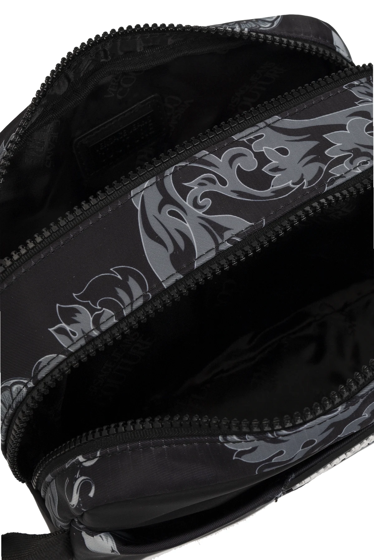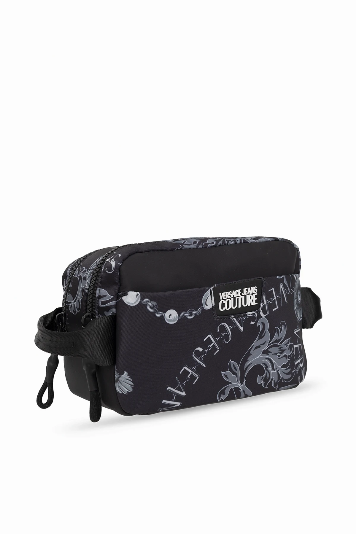 Czarna kosmetyczka Versace Jeans Couture. Wykonana z materiału. Dwie oddzielne komory zamykane na zamek. Ozdobiona nadrukiem ‘Chain Couture’ w kolorze szarym. Z przodu gumowa naszywka z logo oraz kieszeń zamykana na rzep. Po bokach półokrągła rączka. Wewnątrz wsuwana kieszeń.