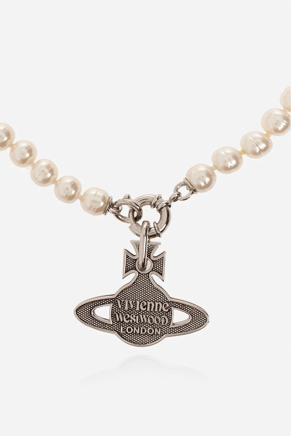 Naszyjnik w kolorze kremowo-srebrnym, model ‘Hilaro’ Vivienne Westwood. Wykonany z mosiądzu i ozdobiony szklanymi perłami. Zapięcie na karabińczyk. Dekoracyjna zawieszka w kształcie logo.