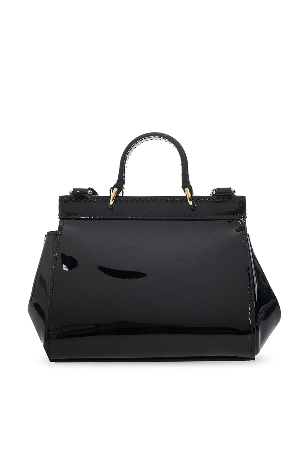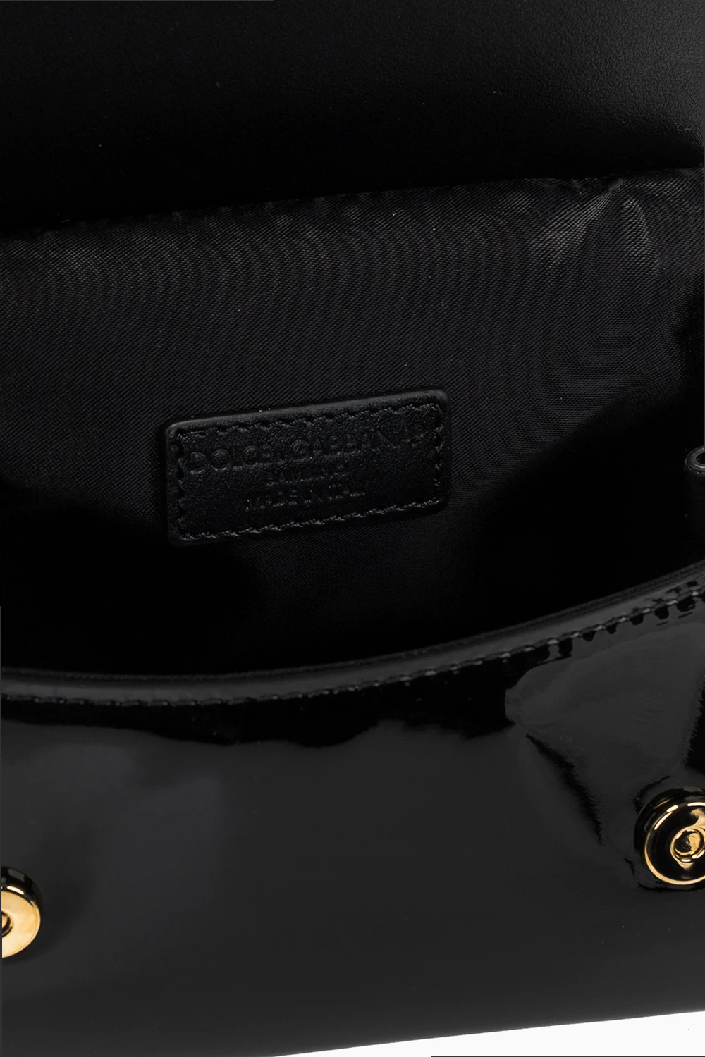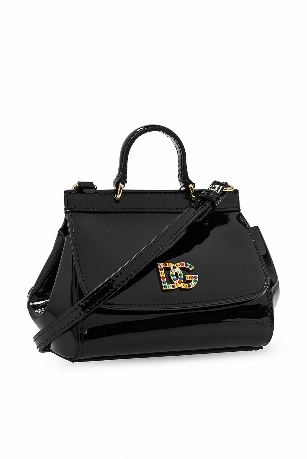 Czarna torba na ramię Dolce & Gabbana Kids. Wykonana z lakierowanej skóry. Zamykana na magnetyczne zatrzaski. Z przodu aplikacja w kształcie logo. Półokrągła rączka. Odpinany, regulowany pasek. Wewnątrz komora.