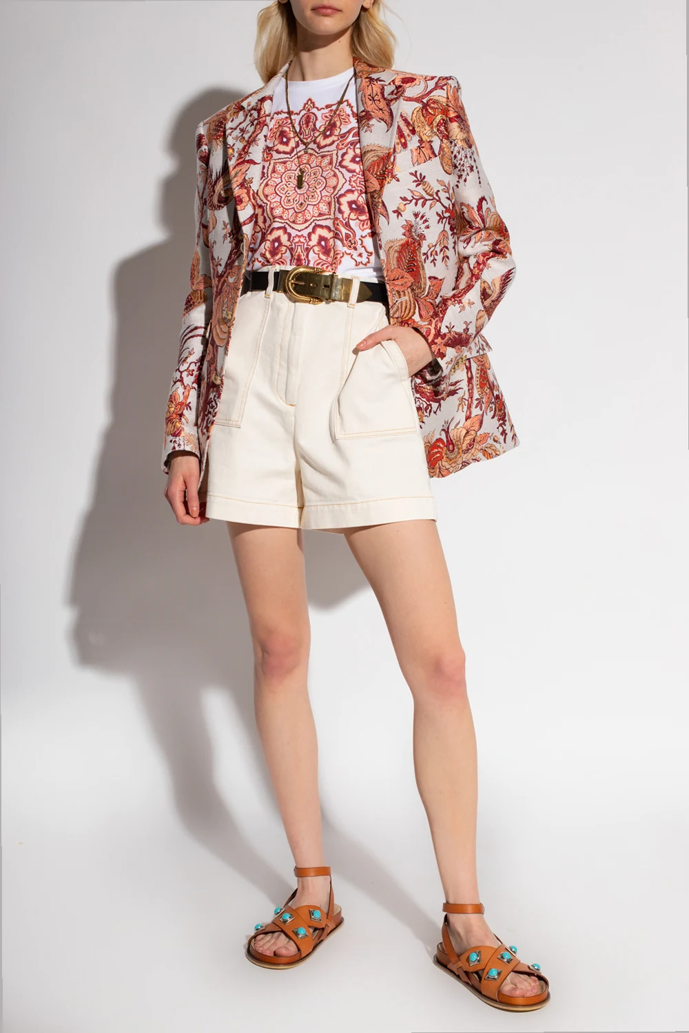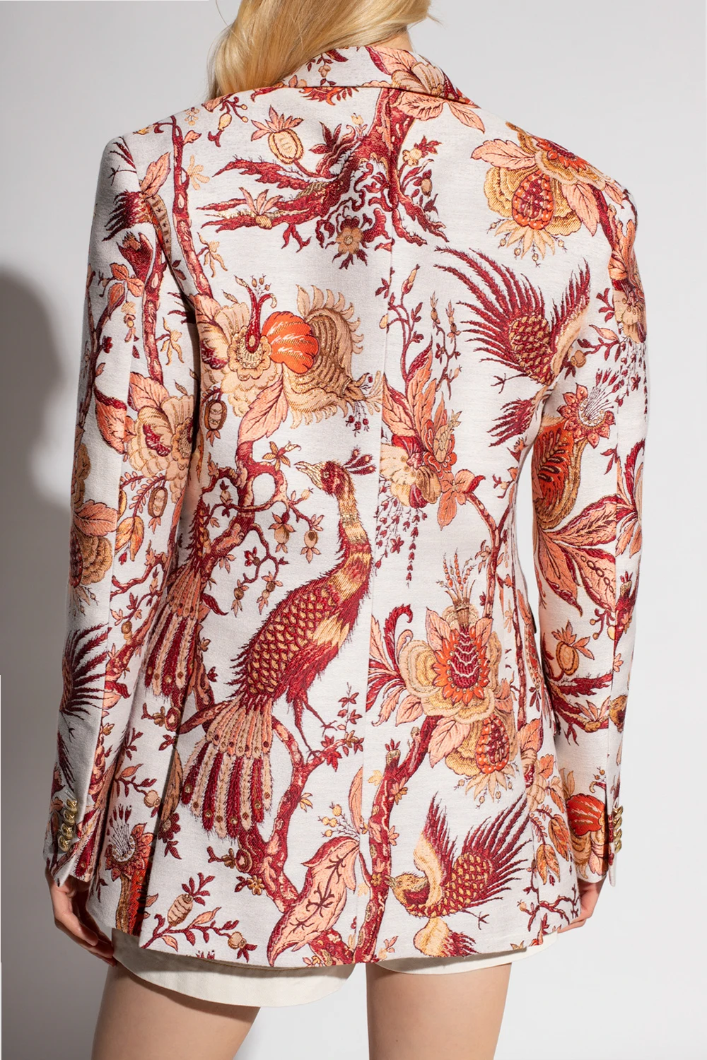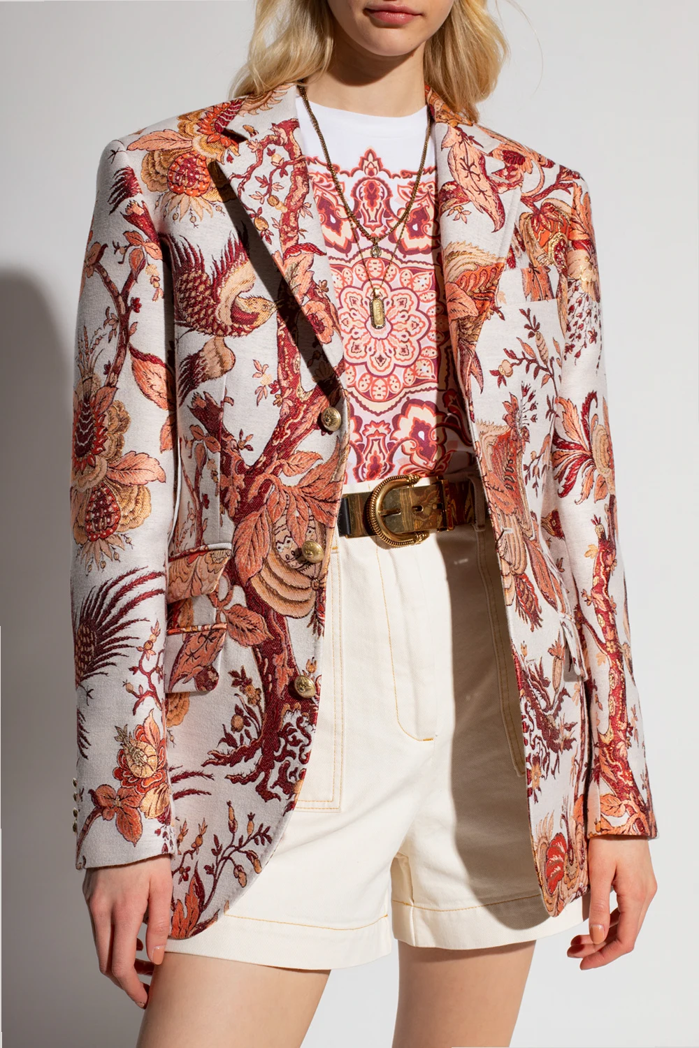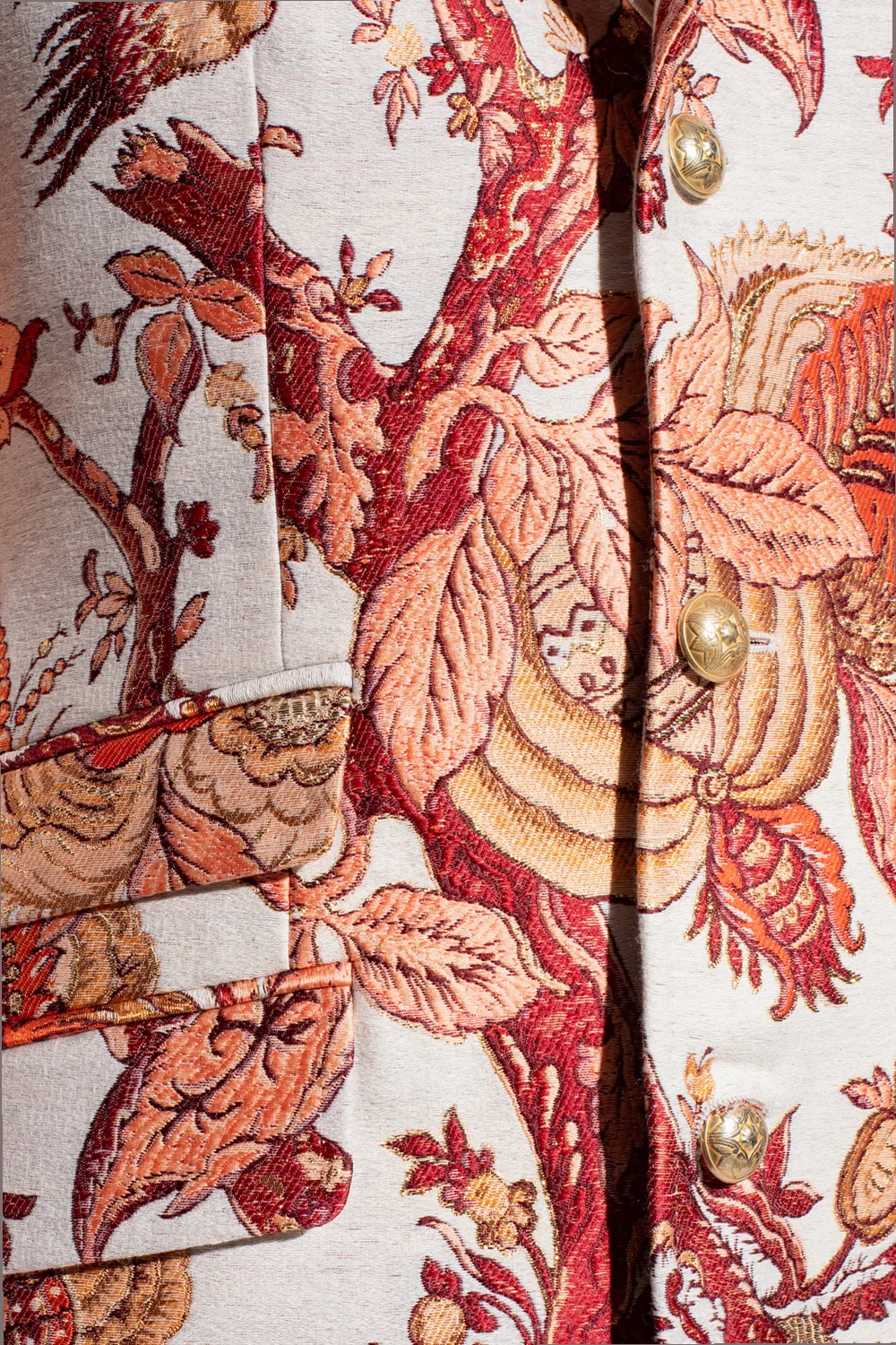 Biała, jednorzędowa marynarka o dopasowanym kroju Etro. Zapinana na dekoracyjne guziki w kolorze złotym. Ozdobiona pomarańczowo-bordowo-kremowym, żakardowym wzorem z motywem roślinnym ‘Tree of Life’. Wzór wykończony lureksową nicią. Kołnierz z otwartymi klapami. Cztery kieszenie: trzy z patkami oraz wsuwana. Długie rękawy zakończone zapięciem na guziki. Z tyłu podwójne rozcięcie.