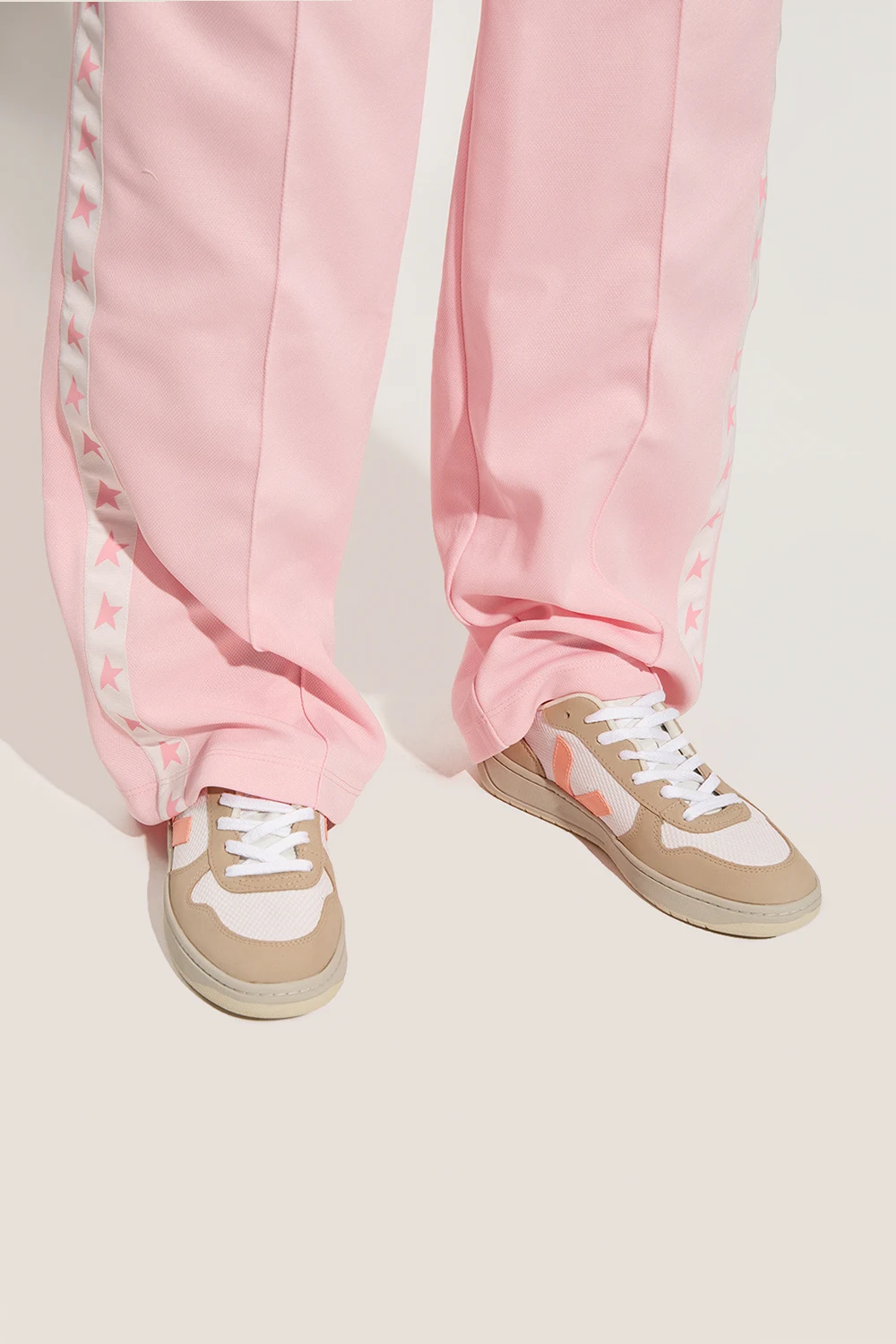 Biało-beżowe, sznurowane buty sportowe, model ‘V-10 Alveomesh’ Veja. Wykonane z nubuku, skóry i Alveomesh (100% poliester z recyklingu). Na języku wytłoczone logo. Charakterystyczna dla marki naszywka w kolorze różowym wykonana z gumy oraz odpadów ryżowych. Sznurówki wykonane z organicznej bawełny. Warstwa wewnętrzna o specjalnej, siateczkowej strukturze wykonana z materiału pochodzącego z recyklingu – cechuje się wyjątkową odpornością na tarcie. Wkładka wykonana z trzciny cukrowej, gumy Amazon, bawełny organicznej i pochodzącej z recyklingu pianki EVA. Kremowa podeszwa wykonana z gumy amazońskiej, odpadów ryżowych i gumy z recyklingu.