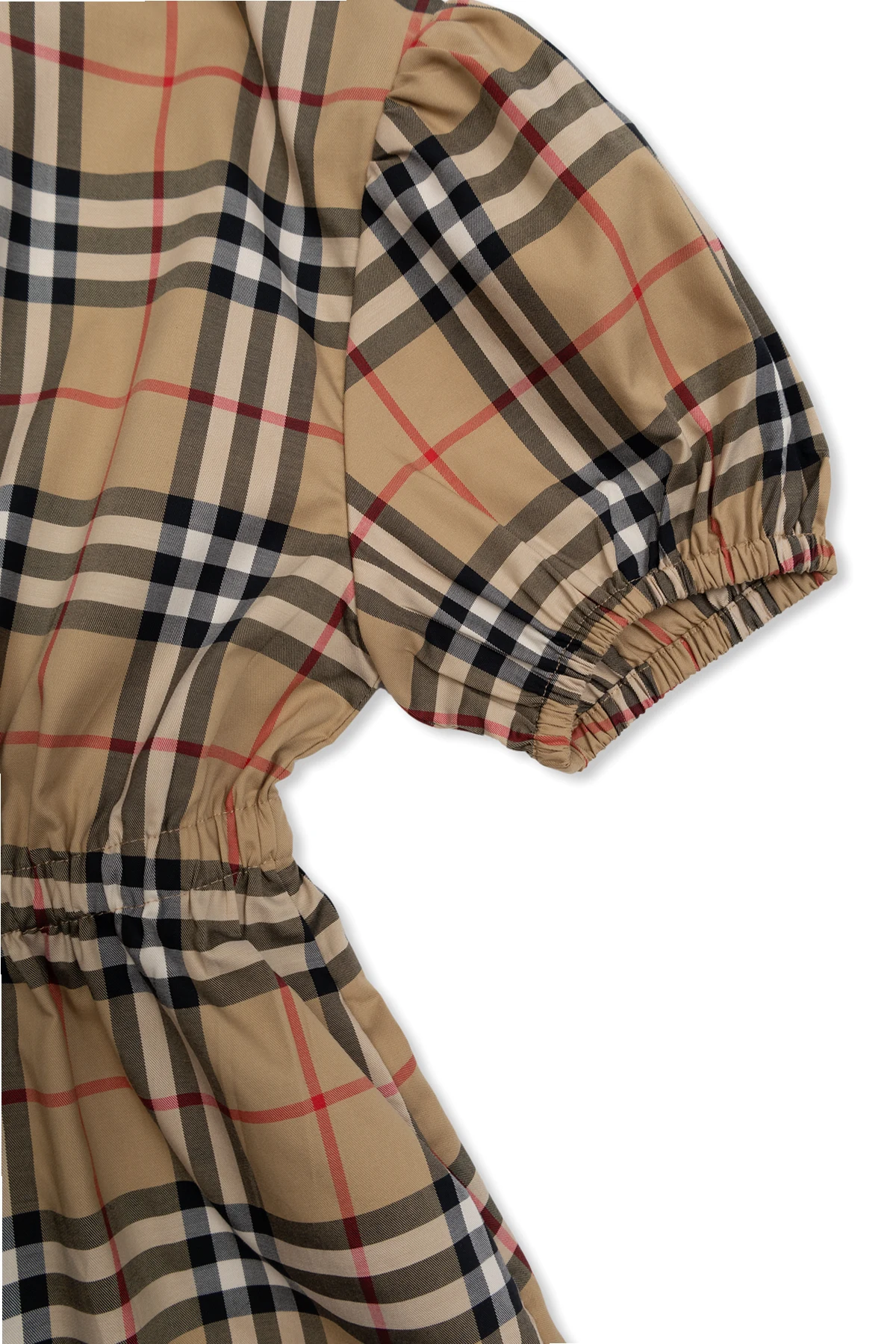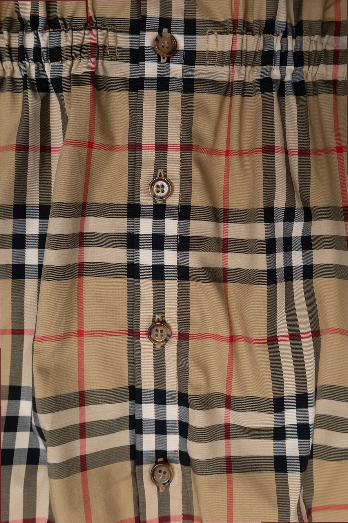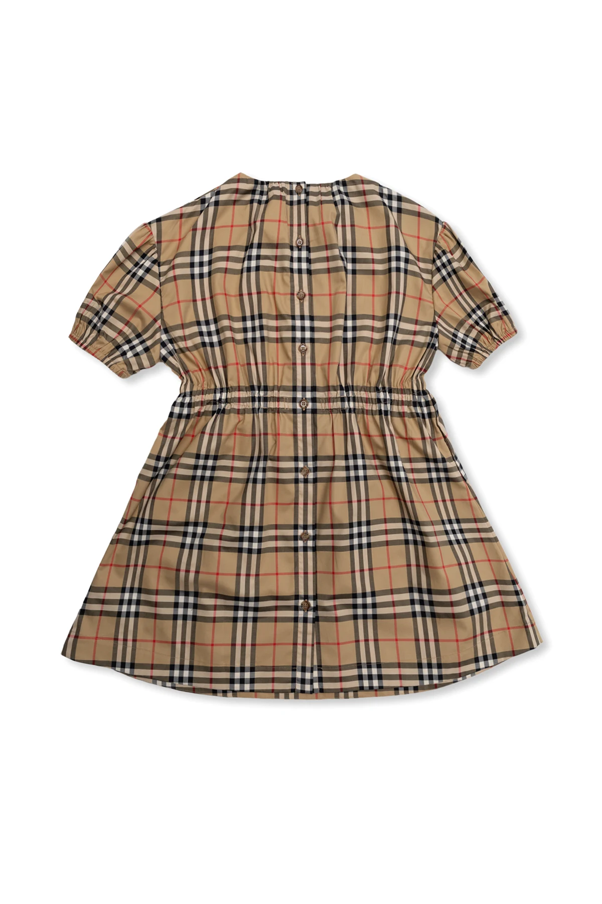 Beżowo-czarno-czerwona sukienka Burberry Kids. Wykonana z bawełny. Zapinana na guziki. Ozdobiona charakterystyczną dla marki kratą ‘Nova Check’. Dwie kieszenie wsuwane. Wykończona ściągaczem.