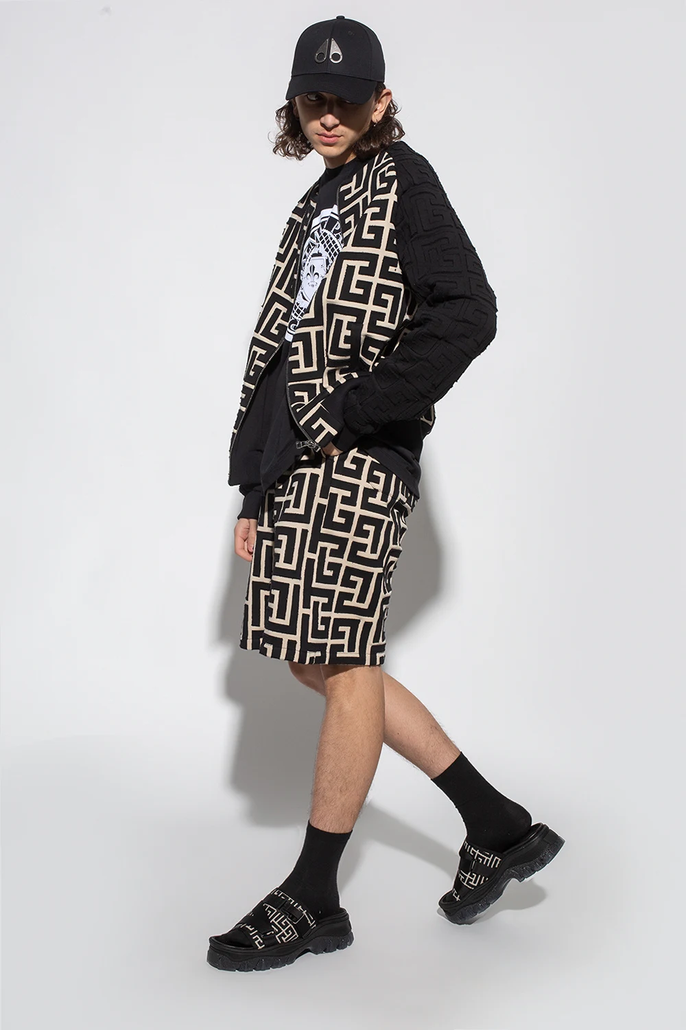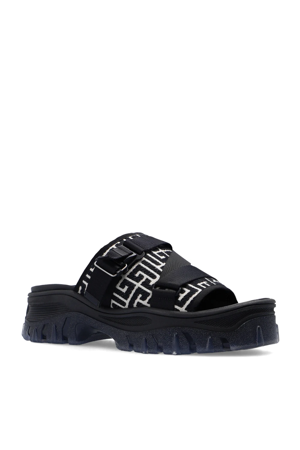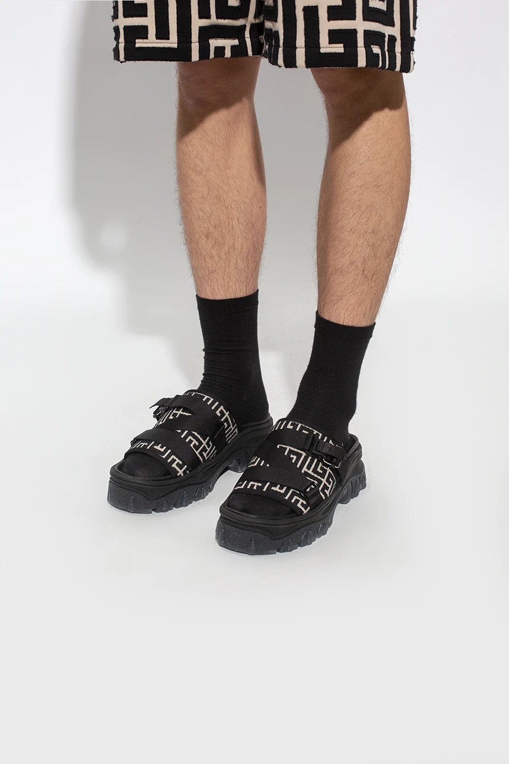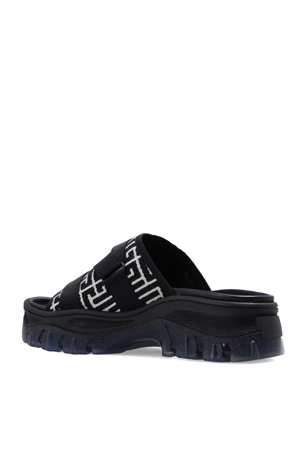 Czarno-beżowe klapki Balmain. Wykonane z materiału ozdobionego monogramem. Regulowane za pomocą paska z klamrą. Skórzana warstwa wewnętrzna. Czarna, gumowa podeszwa.