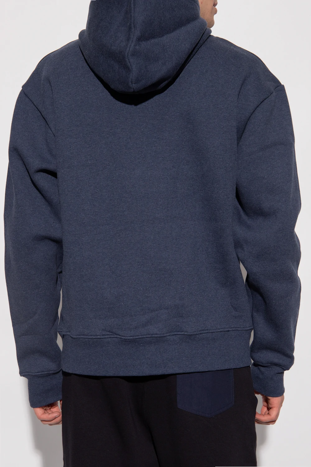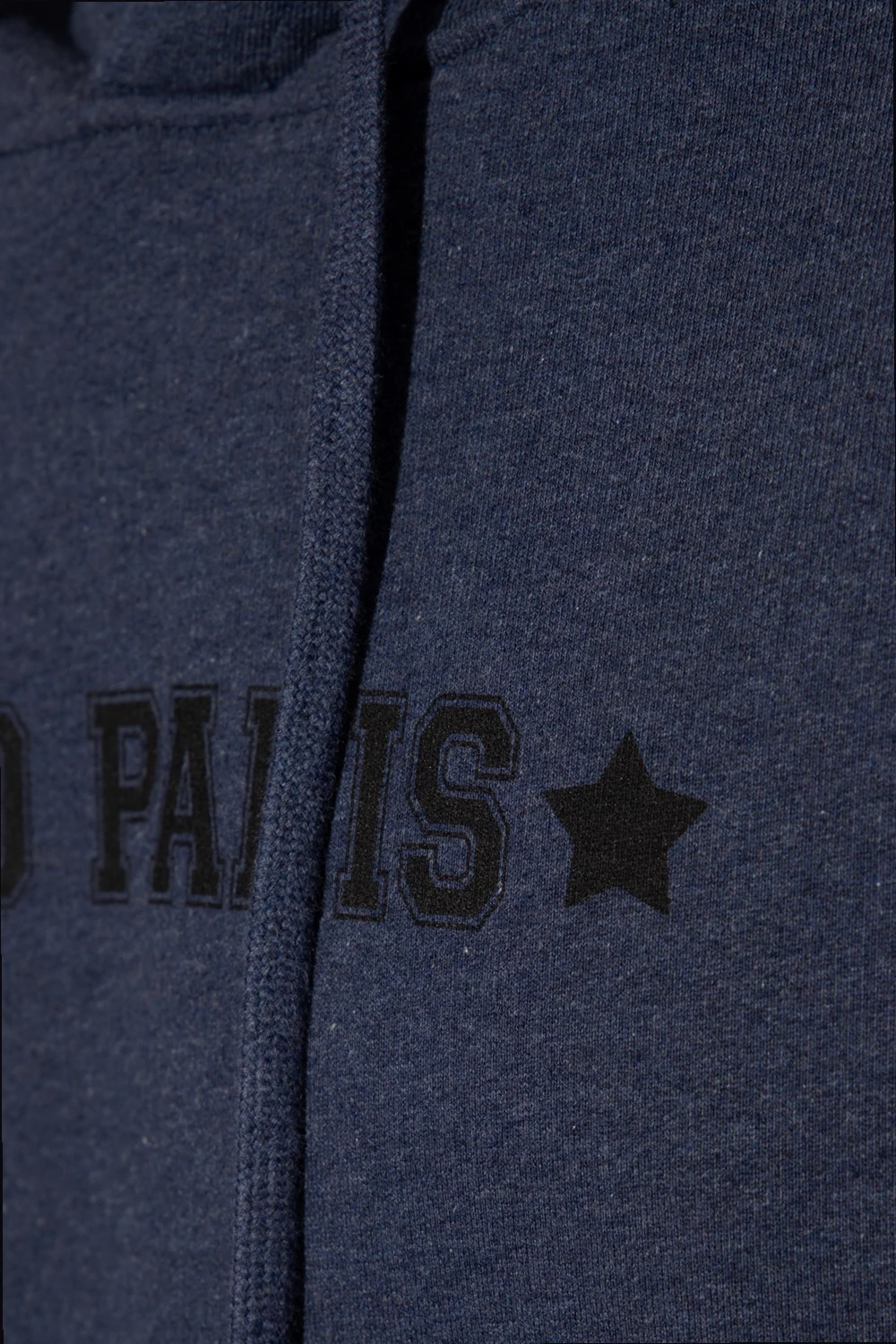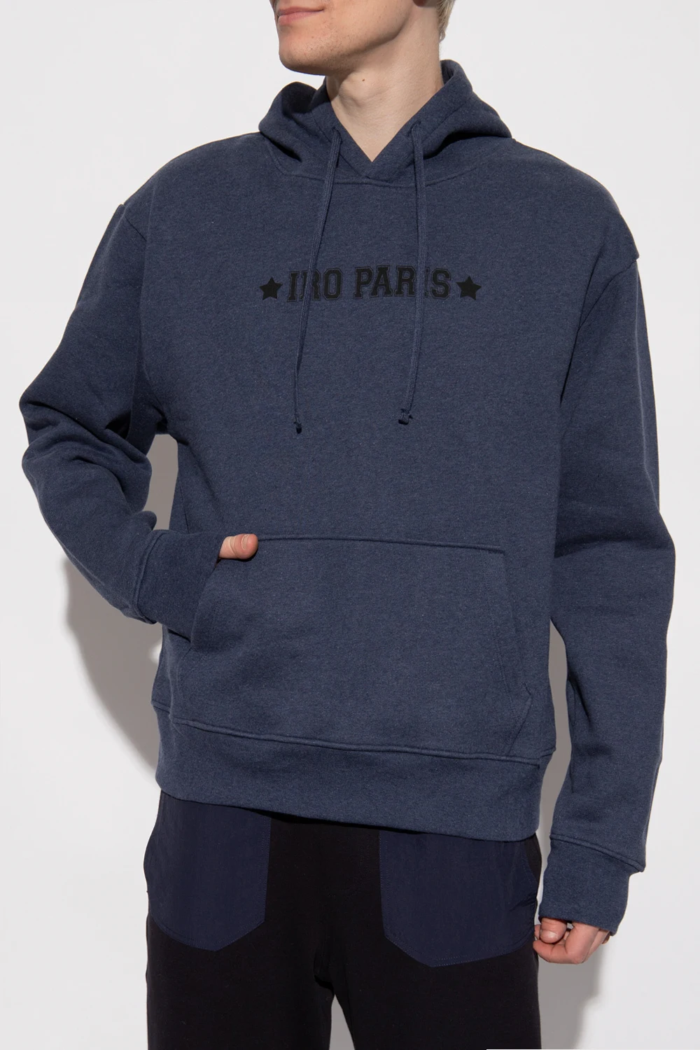 Granatowo-szara bluza z kapturem Iro. Wykonana z bawełny. Z przodu czarny nadruk oraz wsuwana kieszeń. Kaptur ściągany trokami. Dół i długie rękawy zakończone ściągaczami.