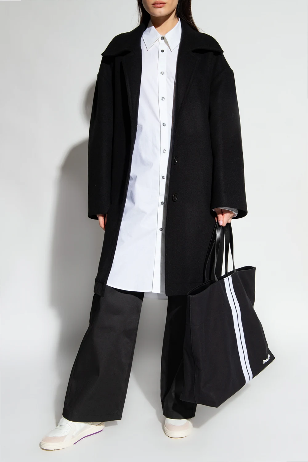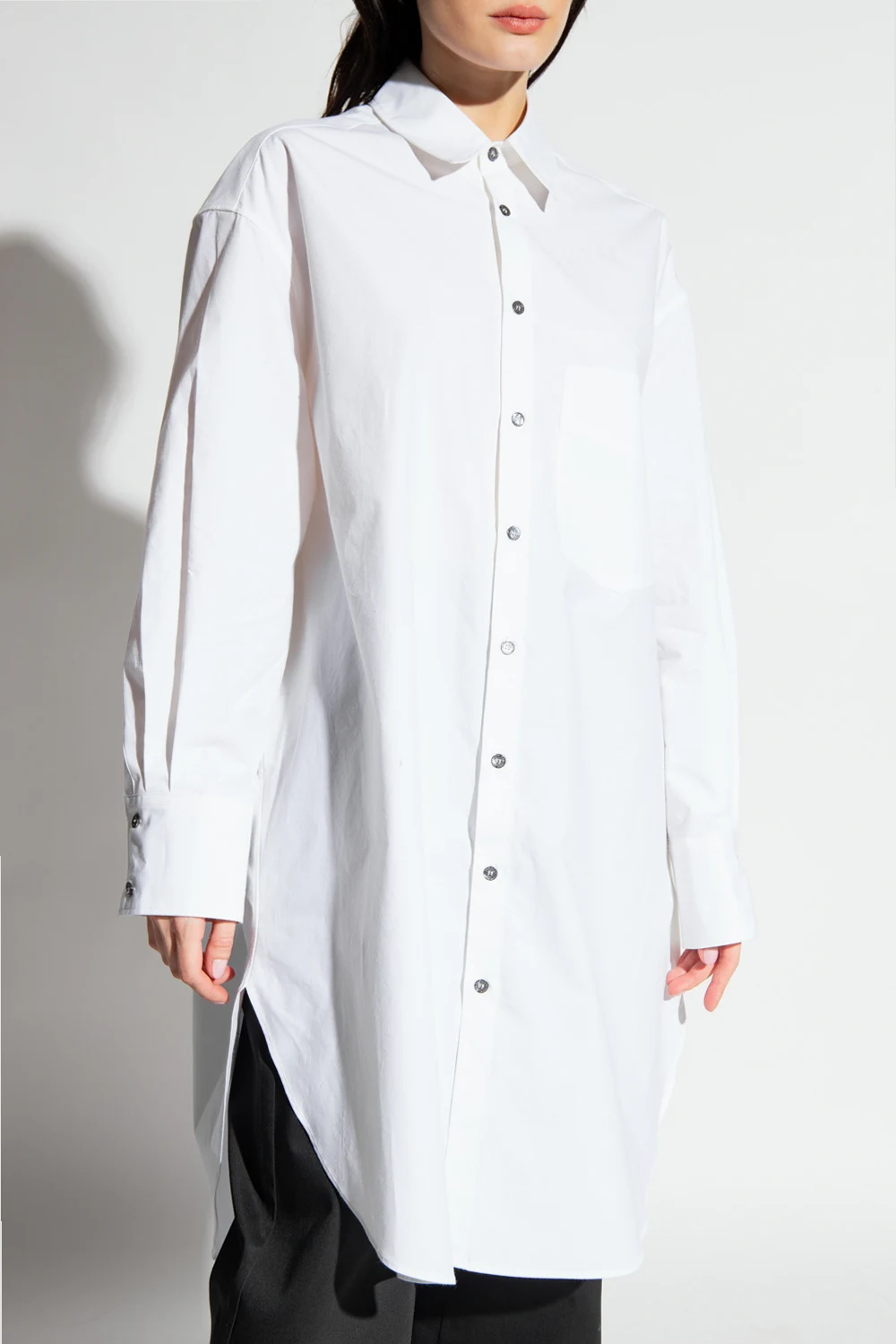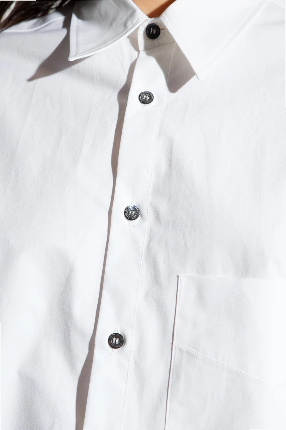 Biała, bawełniana koszulowa sukienka typu ‘oversize’ Palm Angels. Zapinana na guziki. Z przodu kieszeń. Z tyłu nadrukowane białe logo. Długie rękawy, mankiety zapinane na guziki.