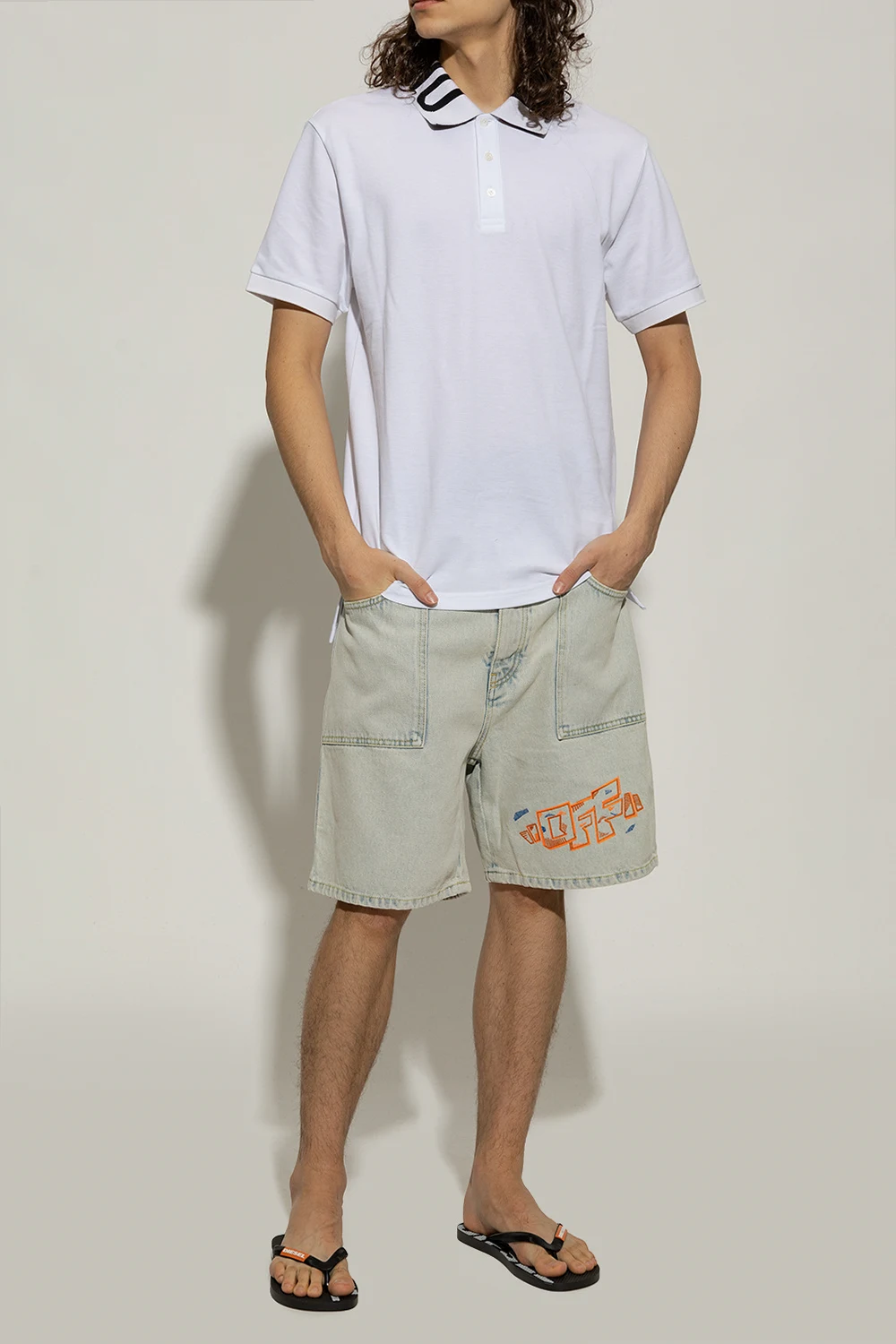 Czarne japonki, model ‘Sa-Briian’ Diesel. Nadruk z logo w kolorze białym. Pomarańczowa, wypukła aplikacja. Biała, gumowa podeszwa.