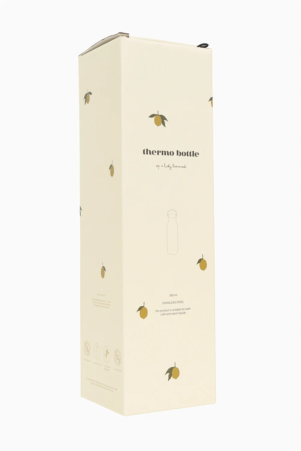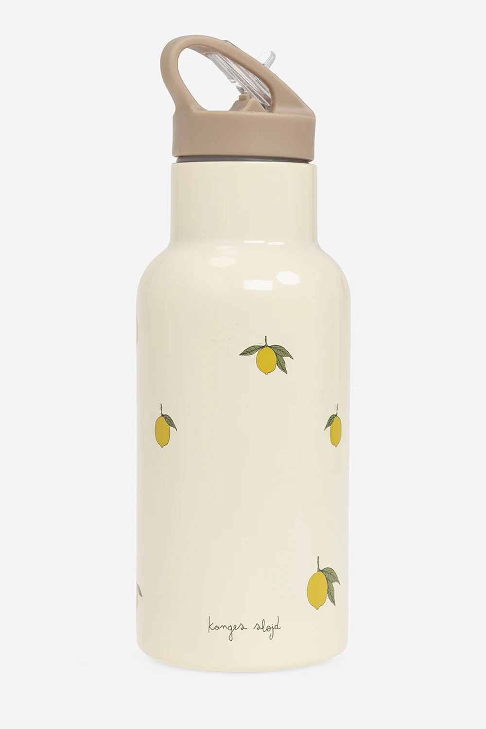 Kremowo-beżowa, termiczna butelka Konges Slojd. Ozdobiona kolorowym nadrukiem z motywem cytryn i logo. Dwie nakrętki, jedna ze słomką.