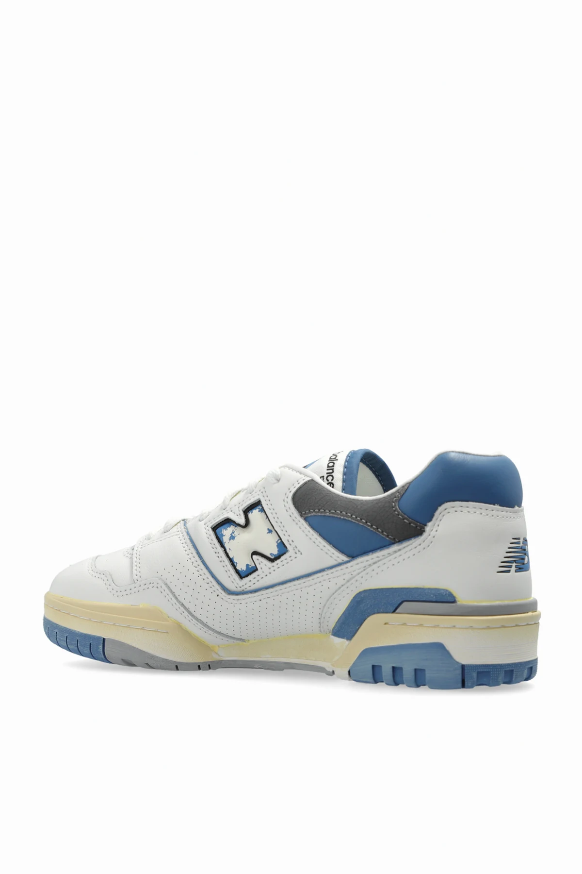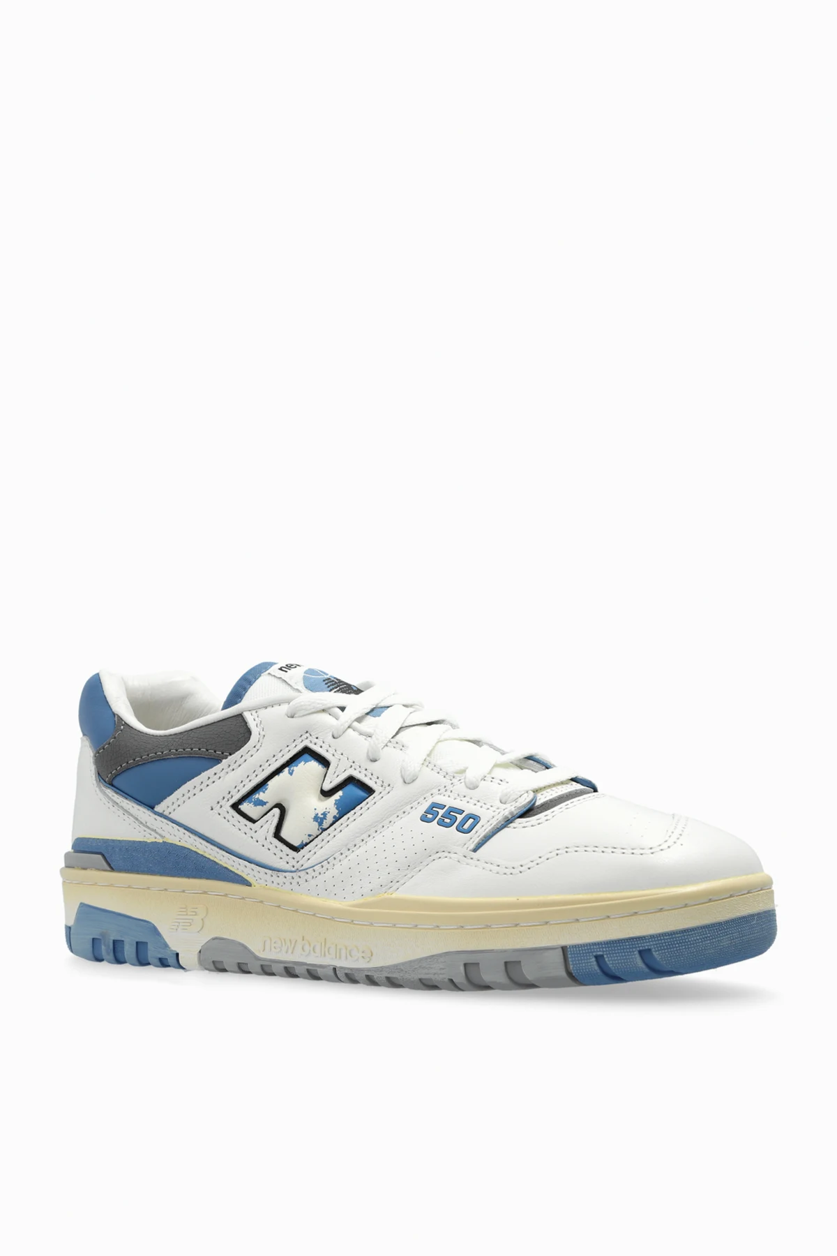 Precyzyjnie umieszczone detale, takie jak logo w kształcie litery "N" w kolorze niebieskim, napis "550" na bocznej stronie, oraz logo i napis "new balance" na języku, podkreślają unikatowość tego modelu. Gumowa podeszwa w kolorze beżowym z niebieskimi akcentami gwarantuje doskonałą przyczepność i amortyzację, czyniąc te buty idealnym wyborem zarówno do codziennych, jak i sportowych stylizacji.