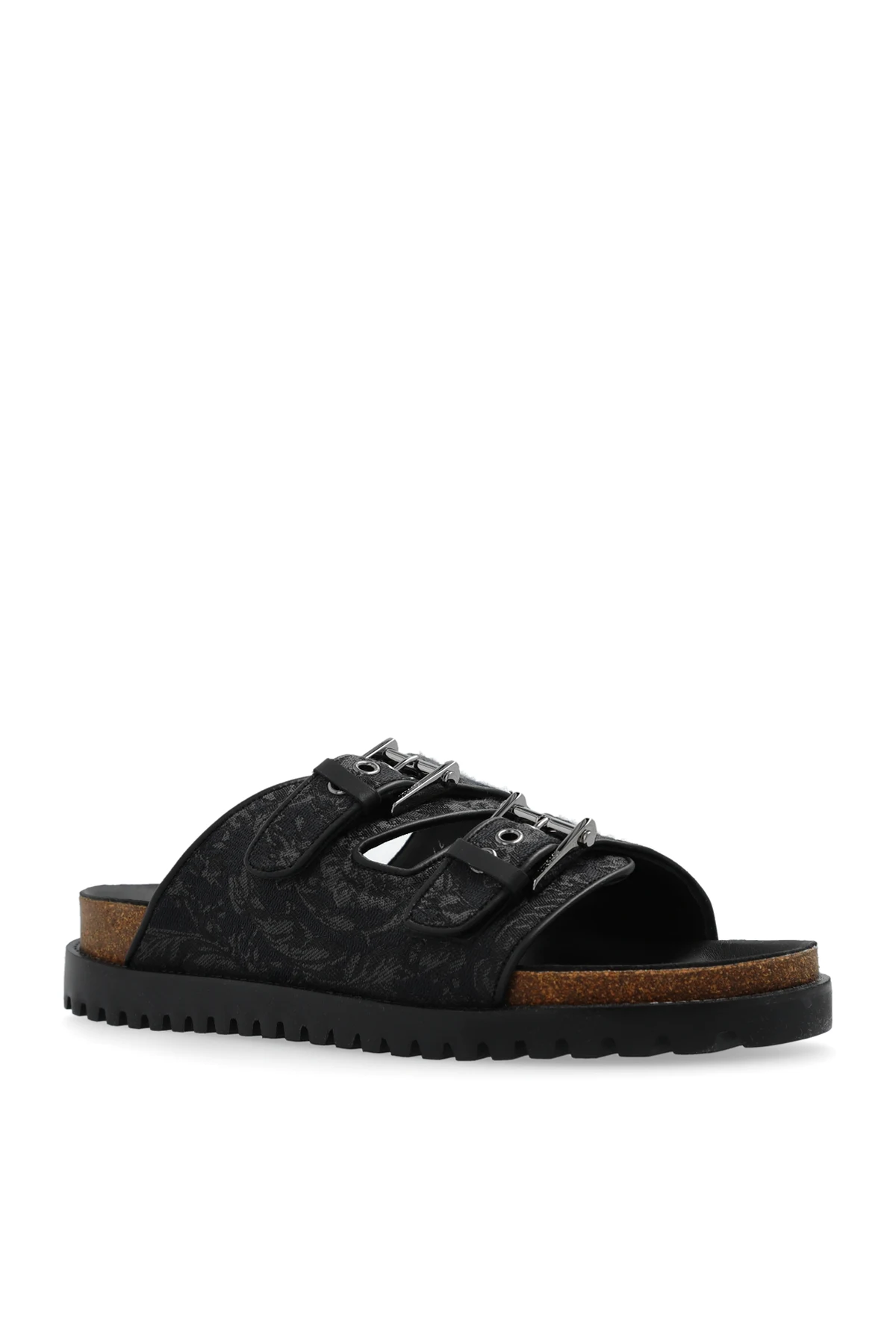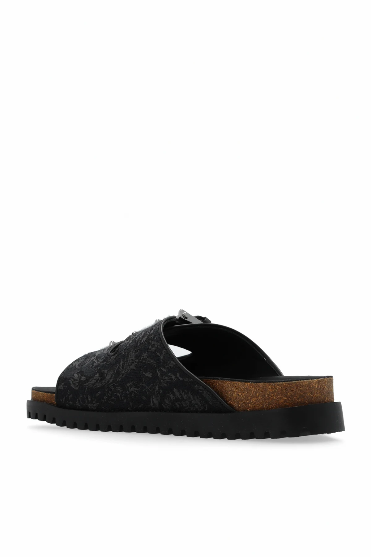Czarno-szare klapki Versace. Zapinane na regulowane paski z klamrami w kolorze srebrnym. Ozdobione wzorem ‘Barocco’. Brązowo-czarna podeszwa wykonana z korka oraz gumy.