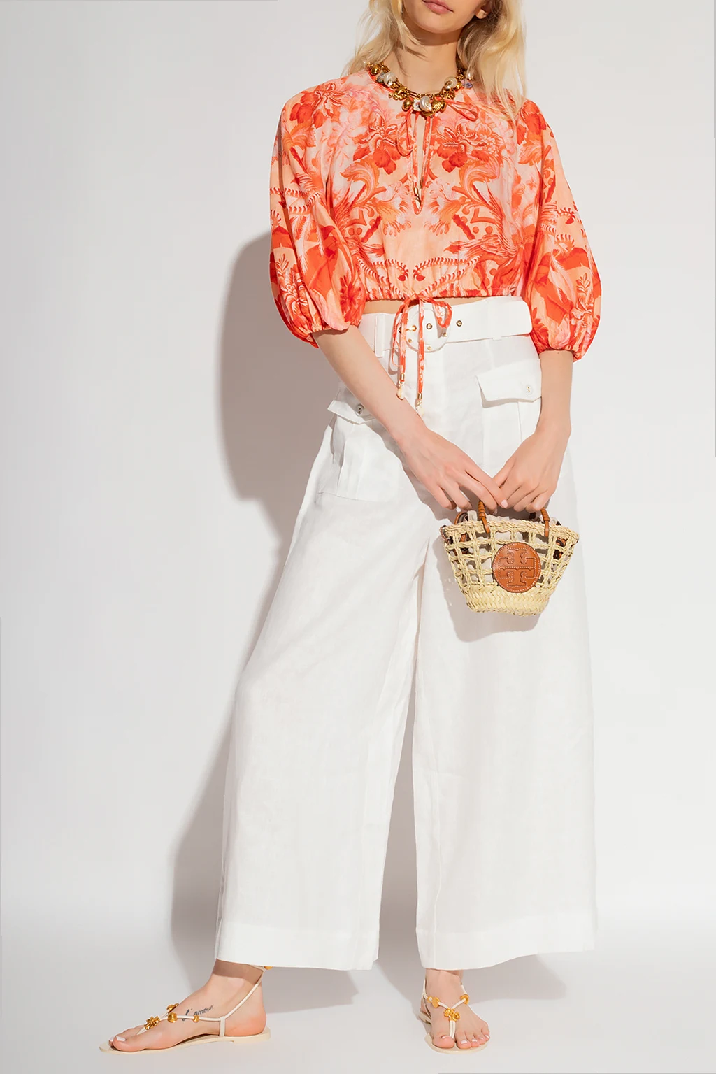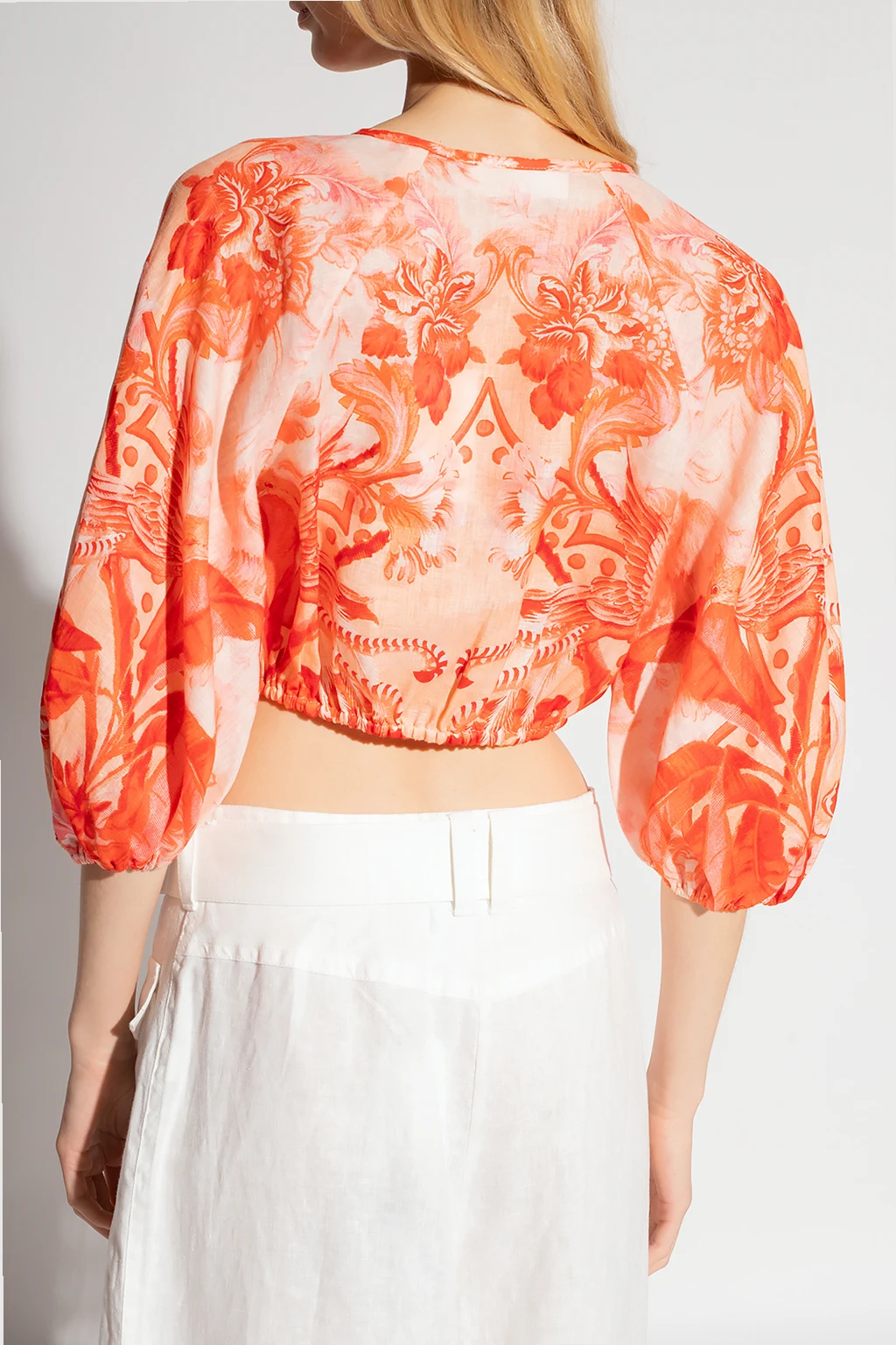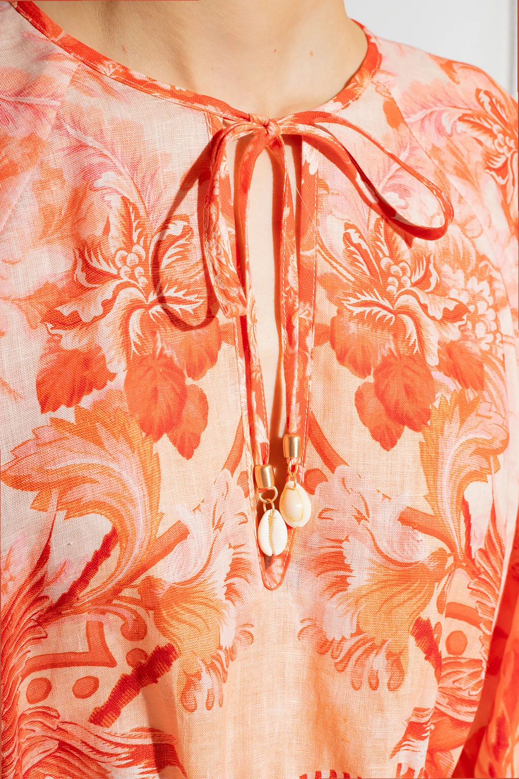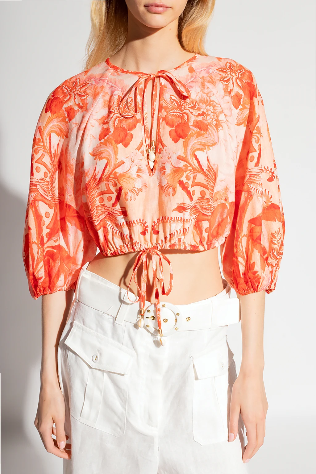 Czerwono-pomarańczowo-różowy, krótki top Zimmermann. Wykonany z lnu. Ozdobiony wzorem z motywem roślinnym. Głęboki dekolt w szpic wiązany pod szyją ozdobionymi trokami z zawieszkami w kształcie muszli. Bufiaste rękawy zakończone ściągaczem. Dół ściągany trokami.