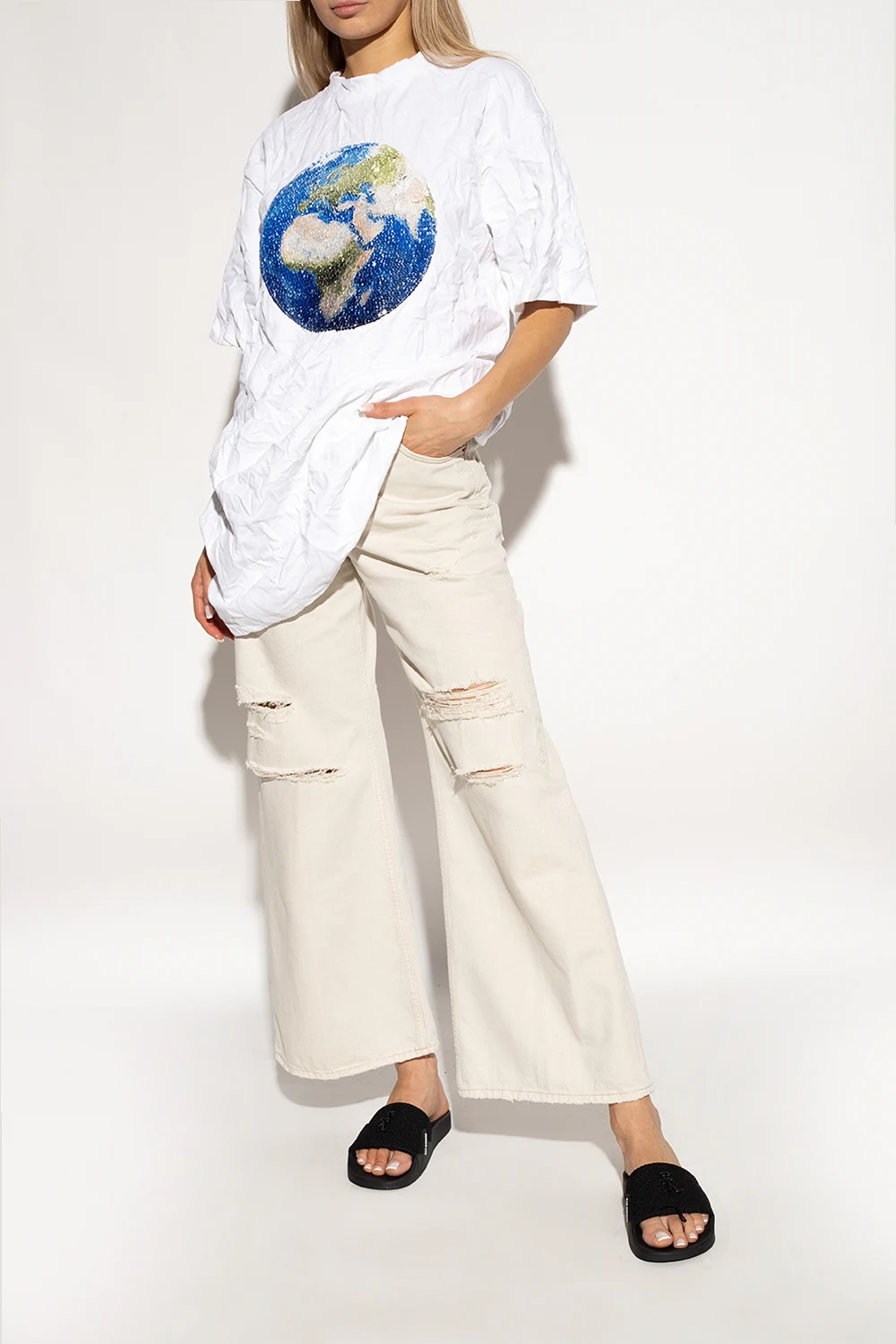 Czarne klapki, model ‘Astra’ Raf Simons. Wykonane z materiału. Ozdobione wypukłym białym logo i aplikacją w kształcie logo. Czarna, gumowa podeszwa.