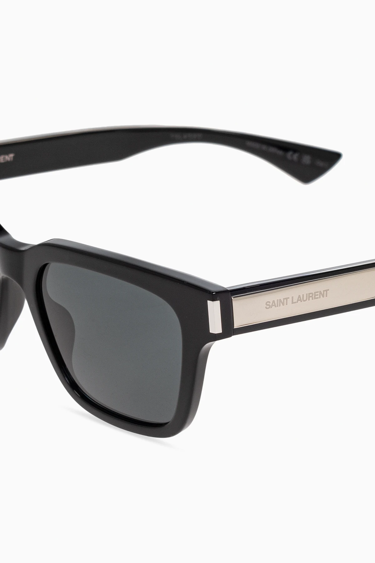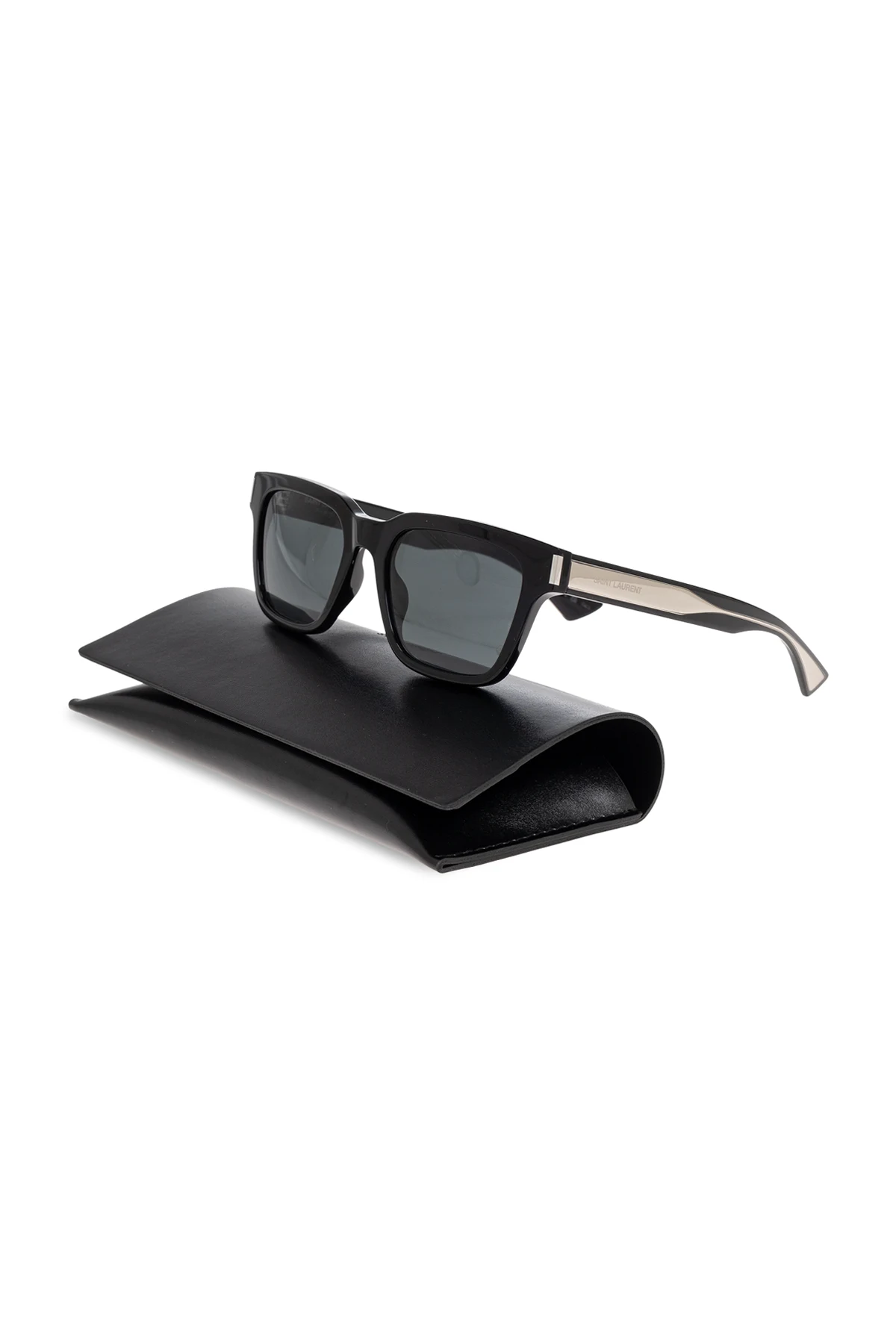 Detale w postaci subtelnego, metalicznego wykończenia na zausznikach oraz umieszczone tam logo "SAINT LAURENT" podkreślają ich luksusowy charakter. Czarne szkła zapewniają doskonałą ochronę przed słońcem, a całość dopełnia eleganckie, czarne etui, tworząc idealny zestaw dla osób, które cenią modę i jakość.