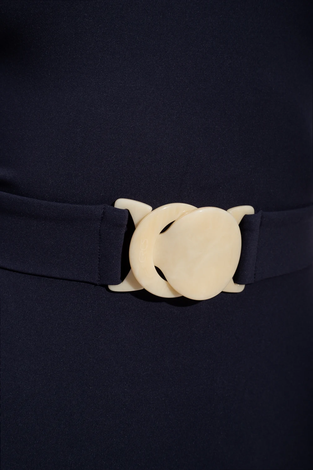 Granatowy, jednoczęściowy kostium kąpielowy z odkrytymi ramionami, model ‘Nuit’ Eres. W talii pasek z klamrą w kolorze złotym.
